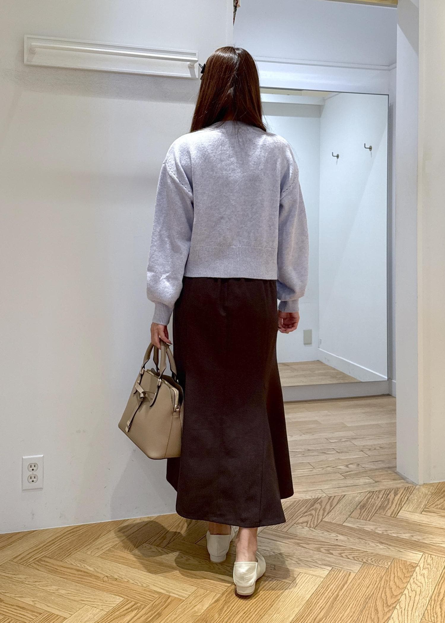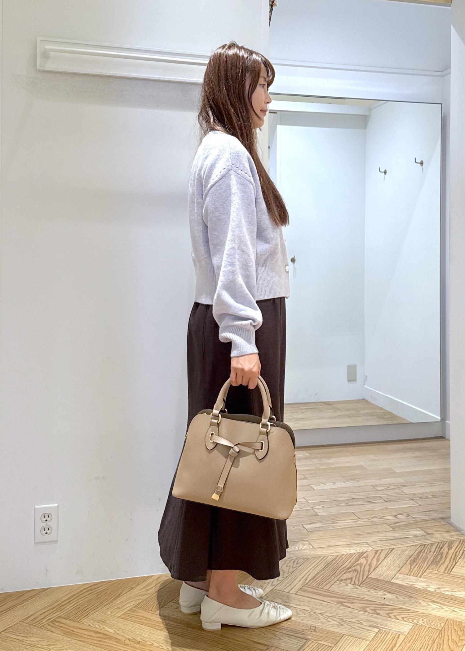 美シルエットのスカートを合わせて綺麗めな印象に仕上げました。パンプスは白系で柔らか雰囲気に。