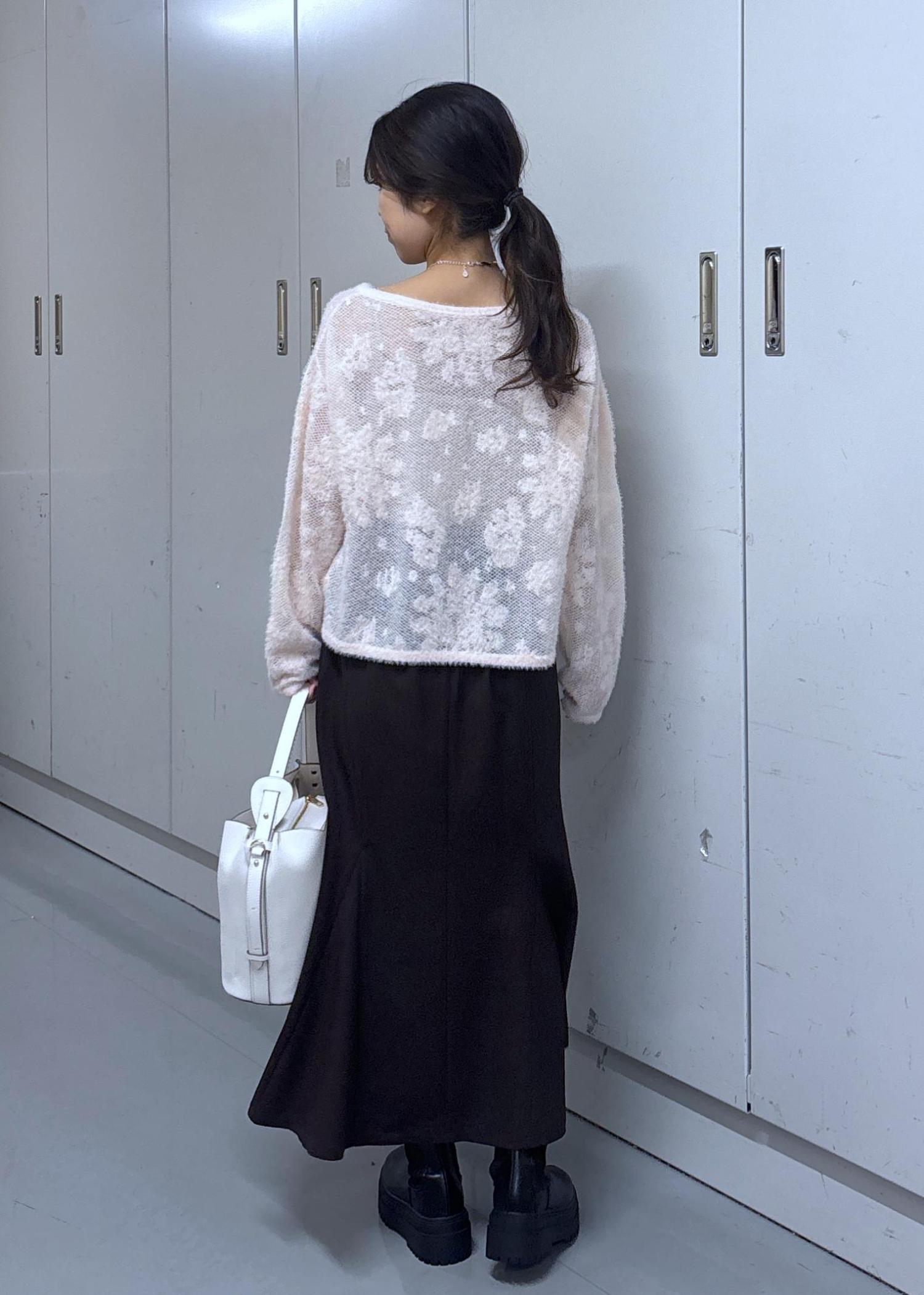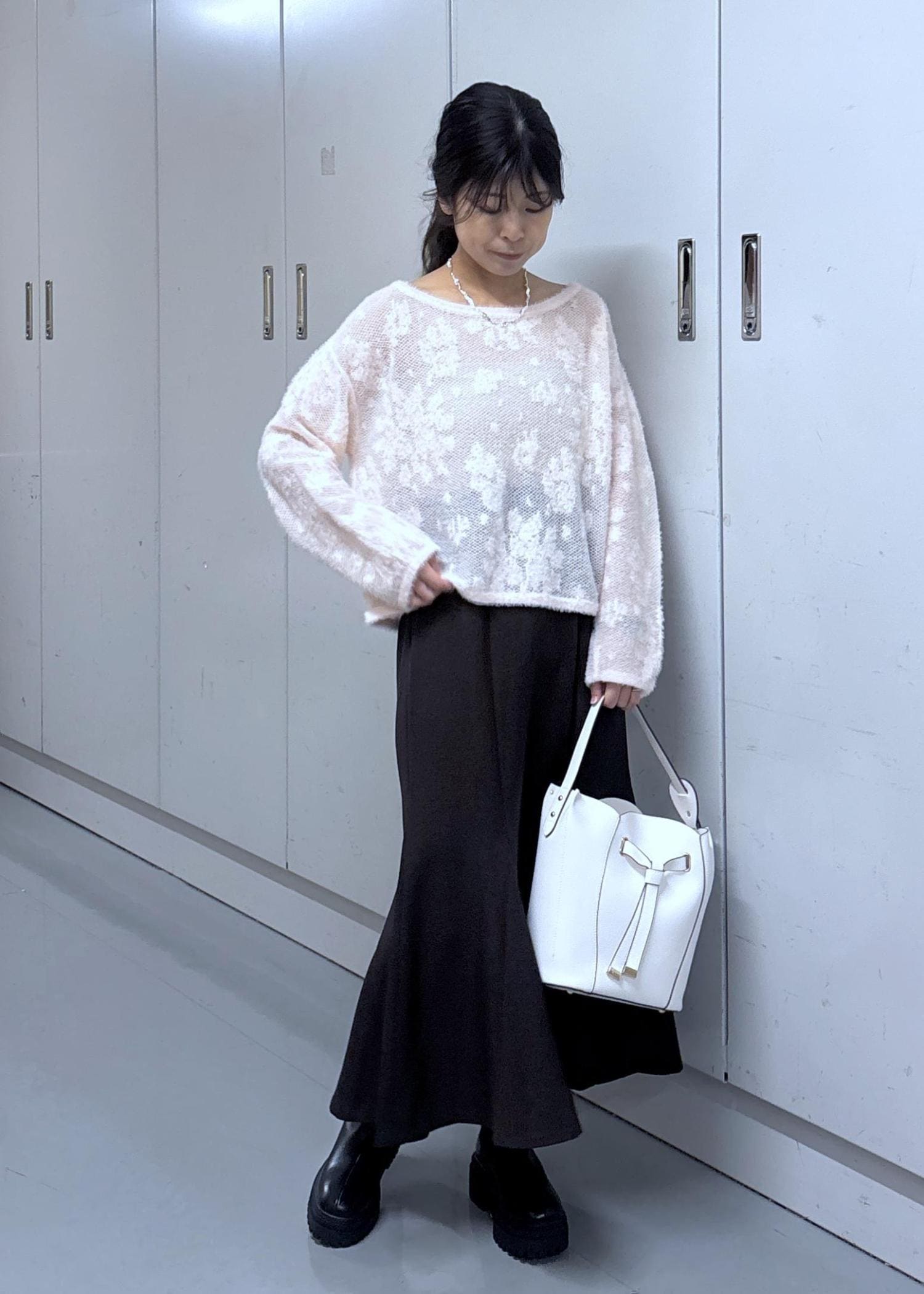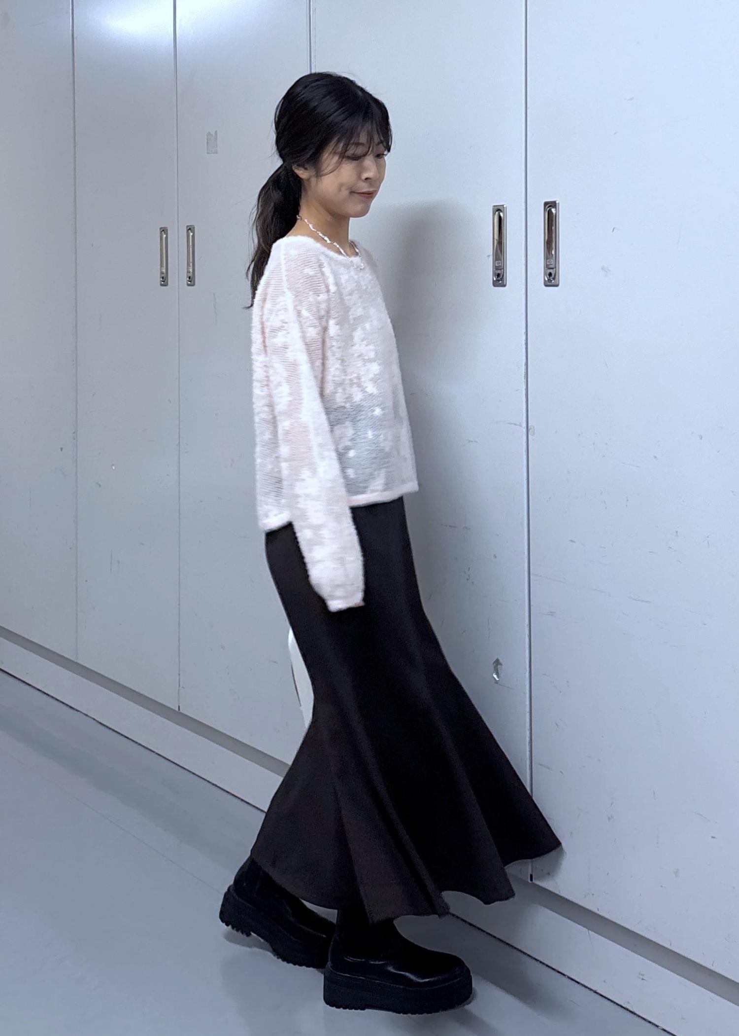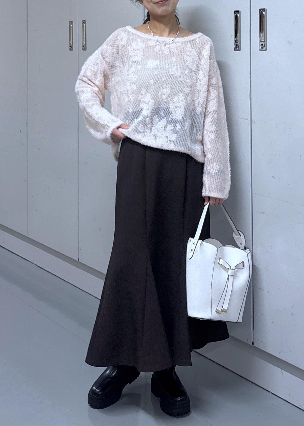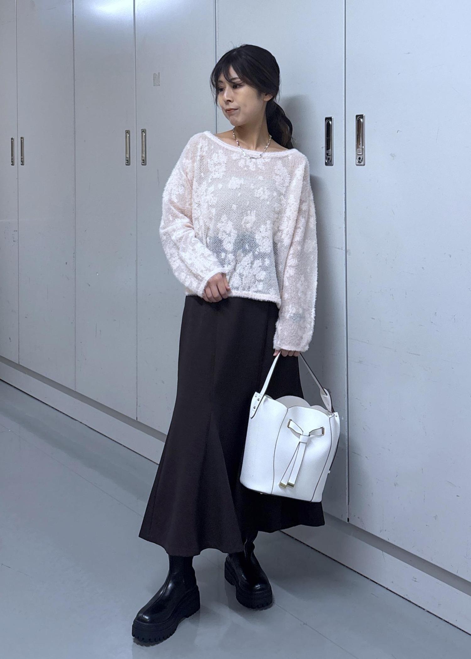 VISフラワーモチーフフェザーシアーニットピンク / F¥3,842レビュー156cm/F着用。着丈はおしりにぎりぎりかかる長さで身幅はゆったりめ。透け感のあるニットで軽い着心地です‼︎チクチクしないのでキャミ合わせはもちろん、ロンTなどを合わせても◎