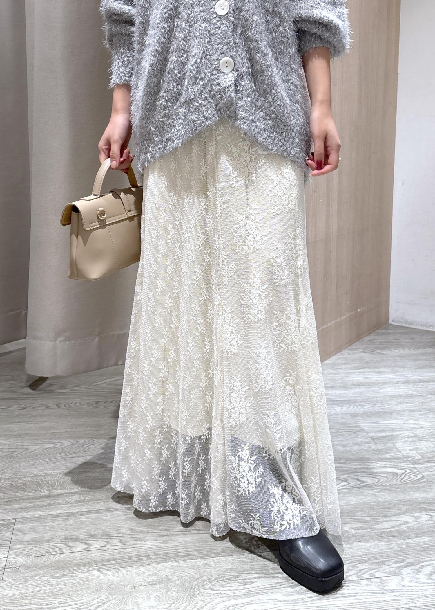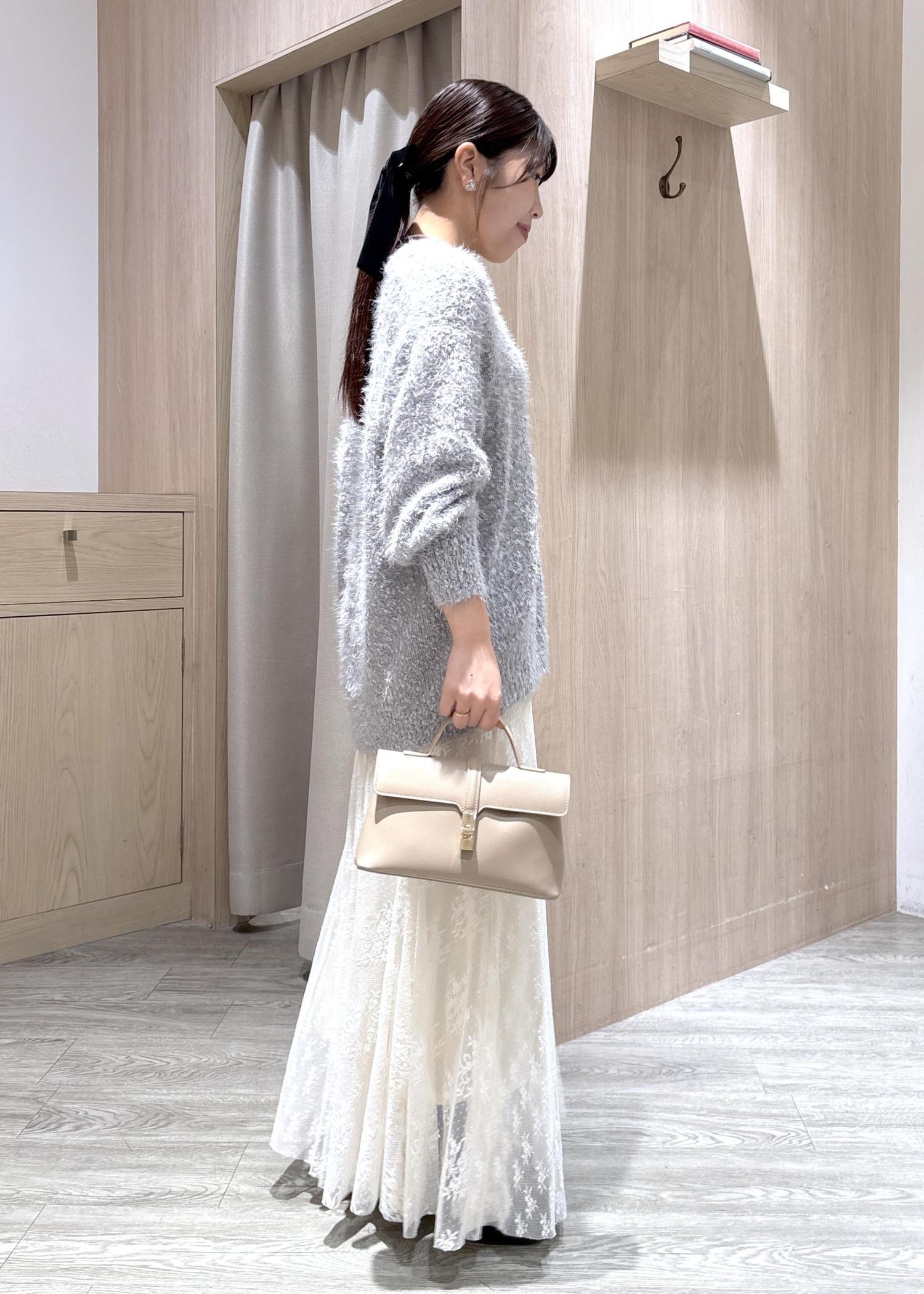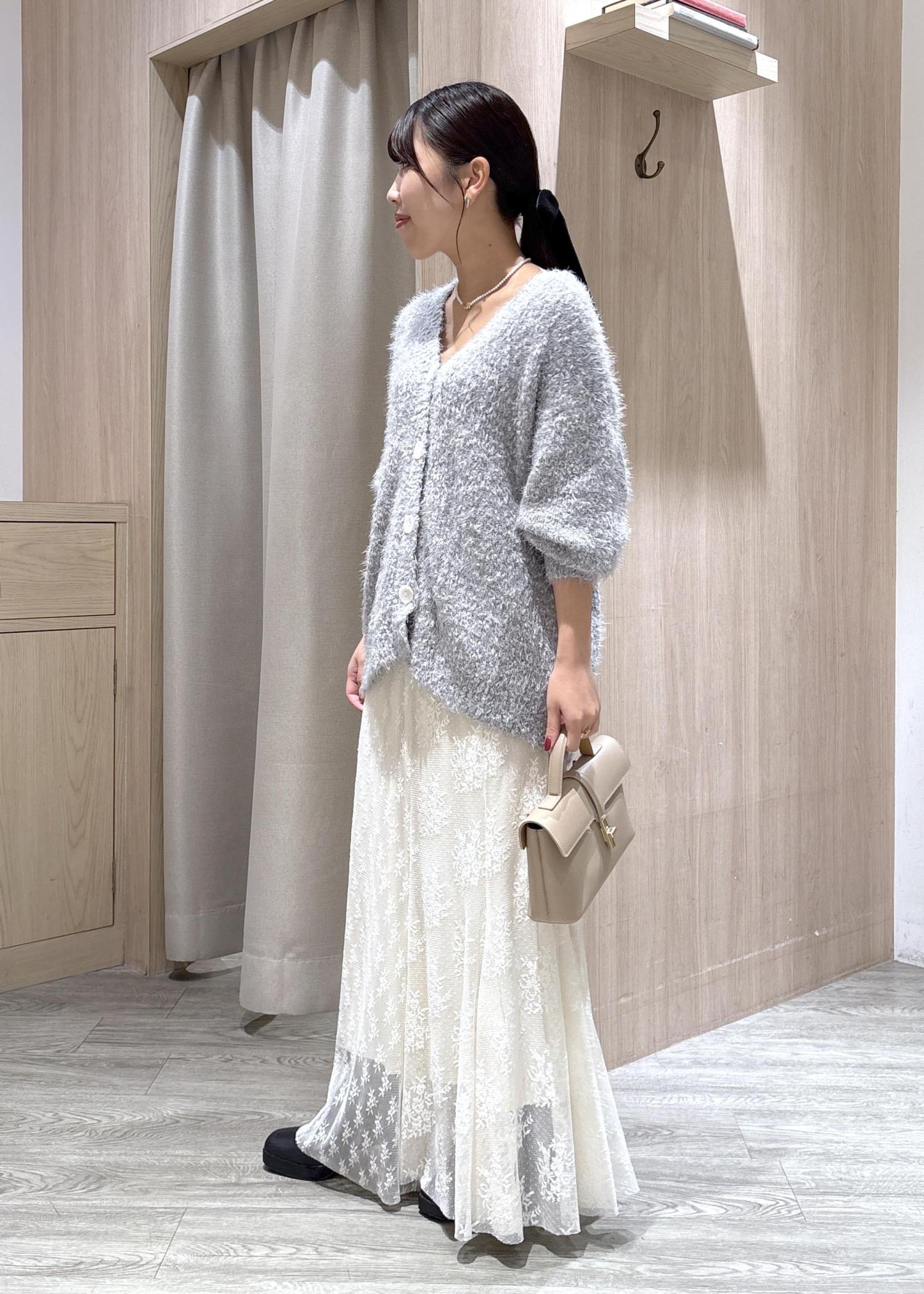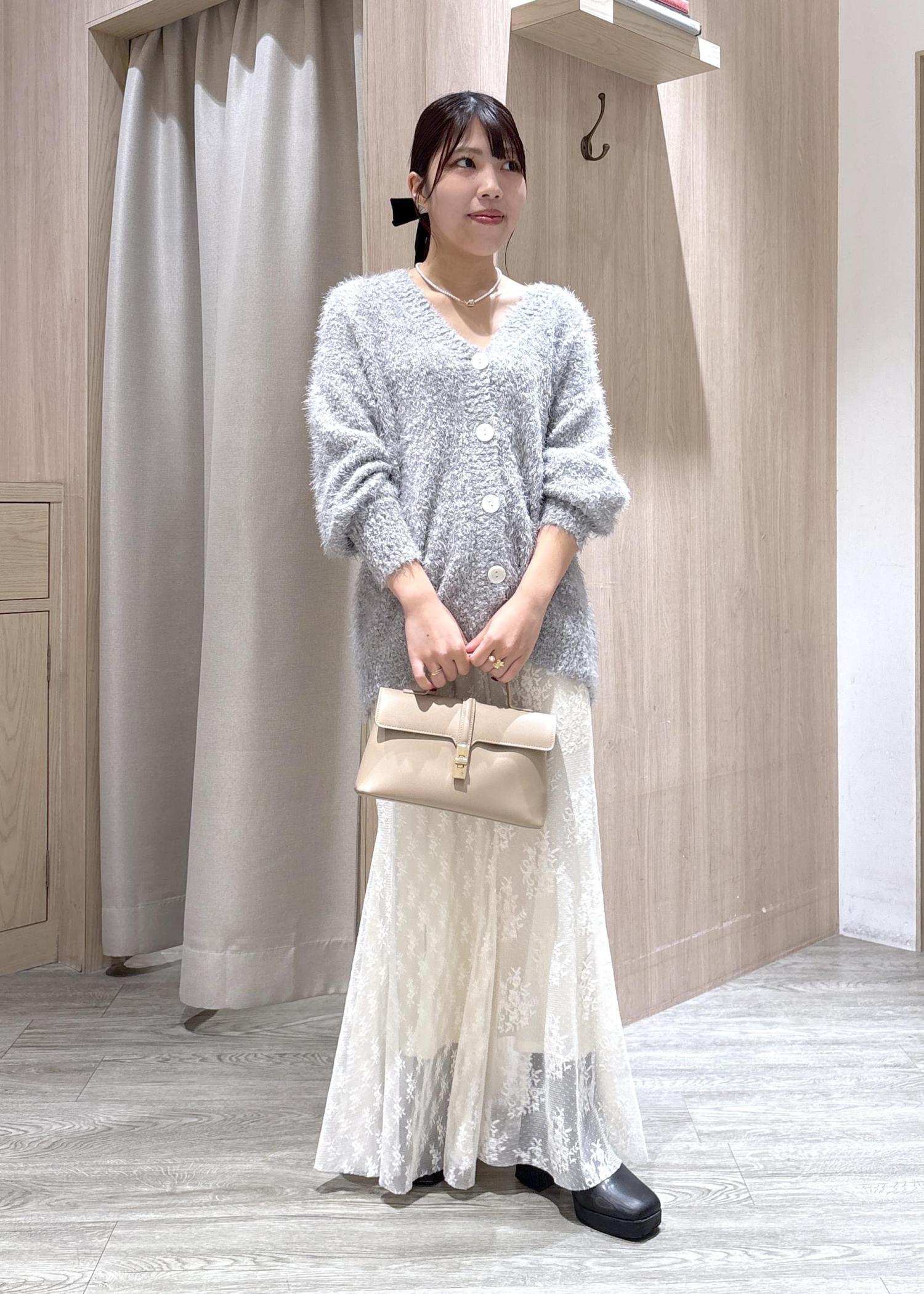 フワフワカーディガンで大人かわいいコーデに仕上げました!ボトムはレースでかわいらしく、小物はシンプルなバッグとヒール高めのブーツで大人っぽくまとめてみました☺︎