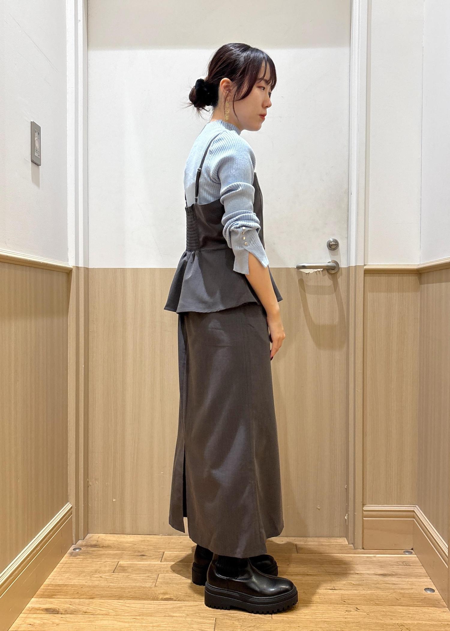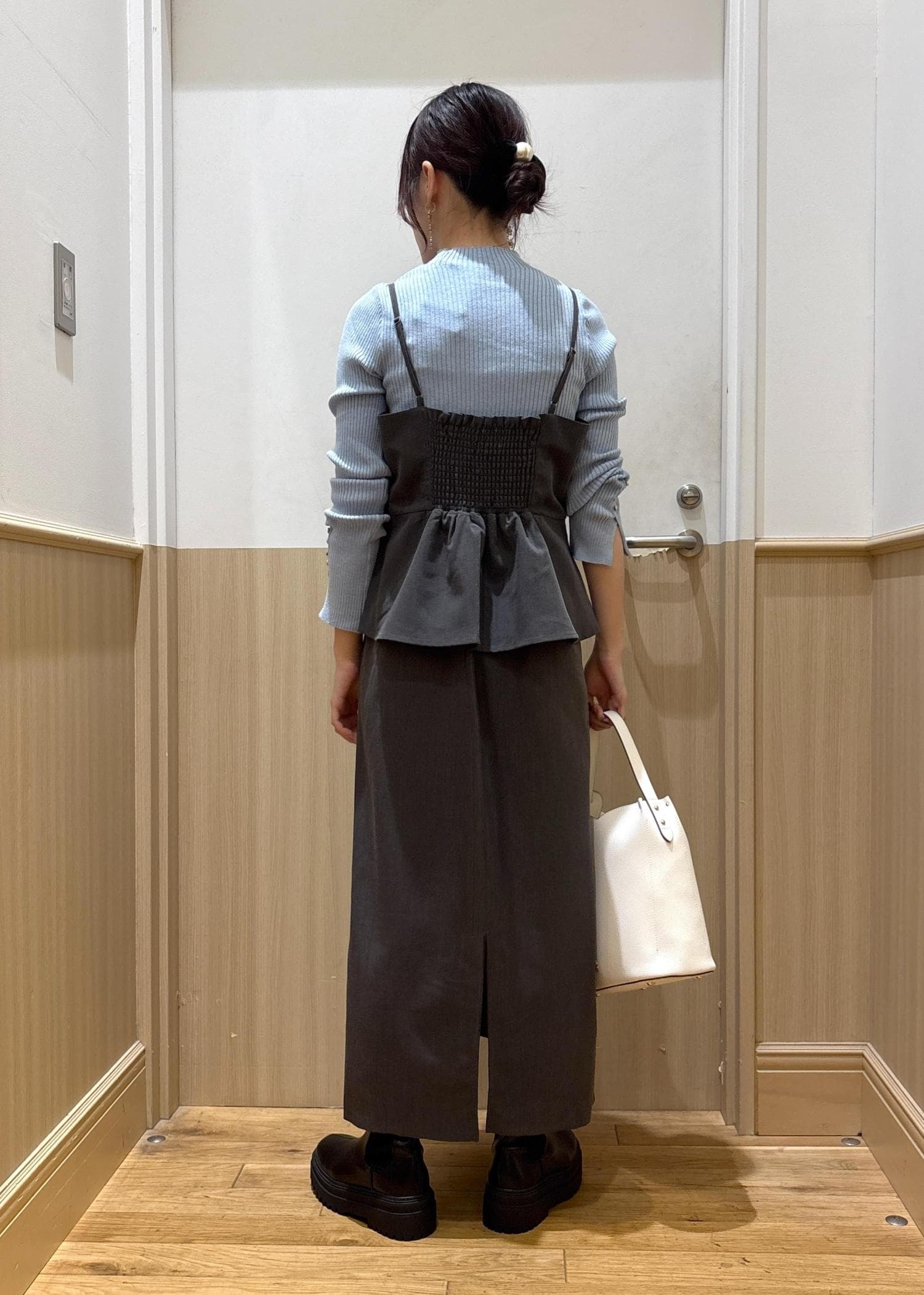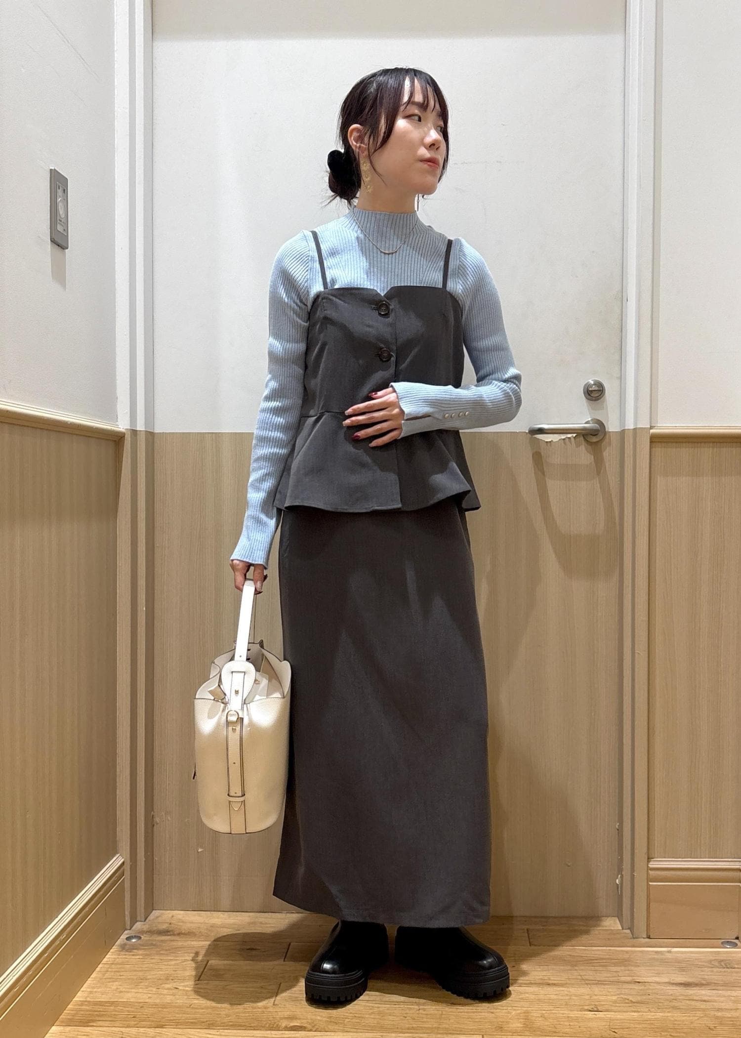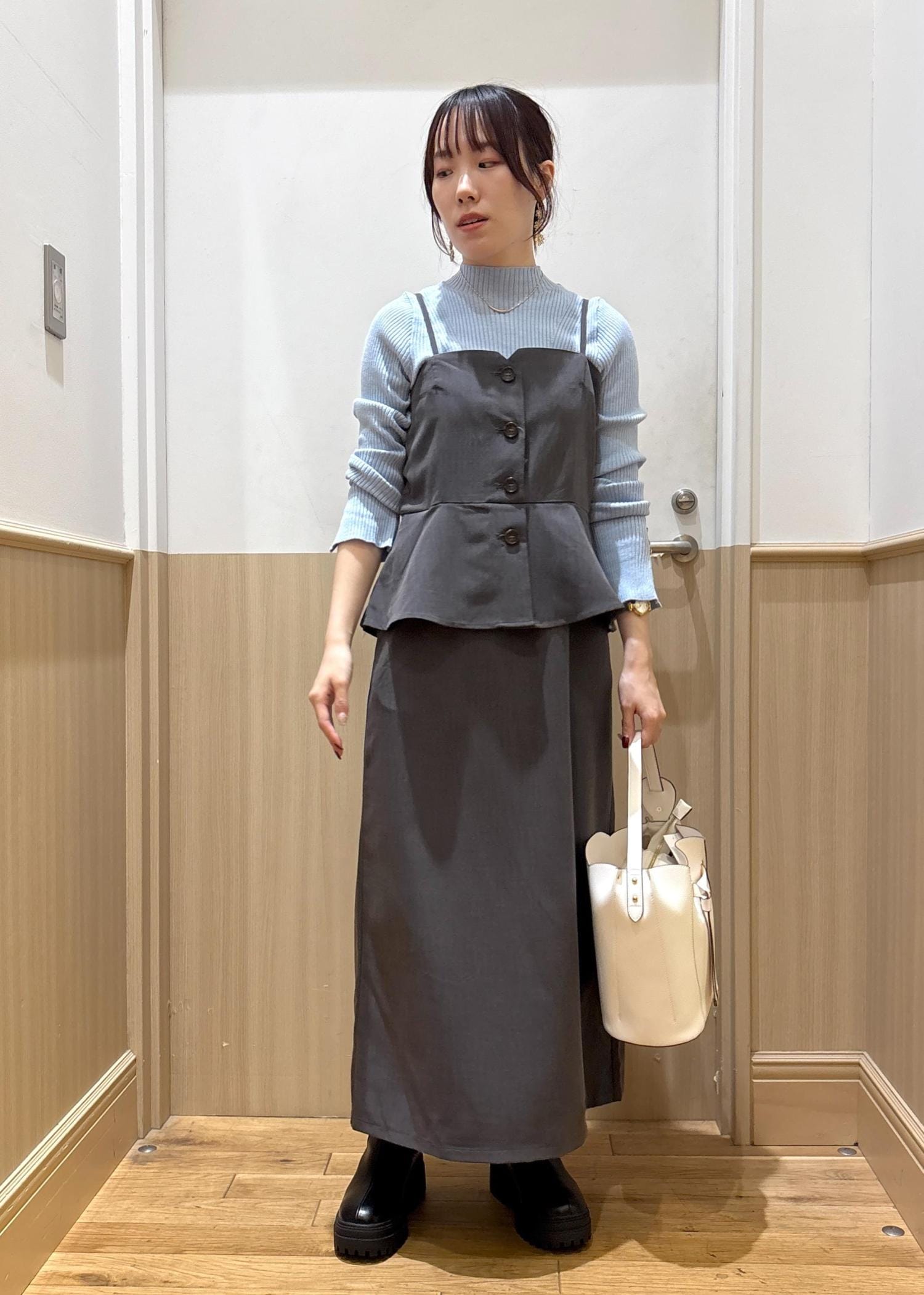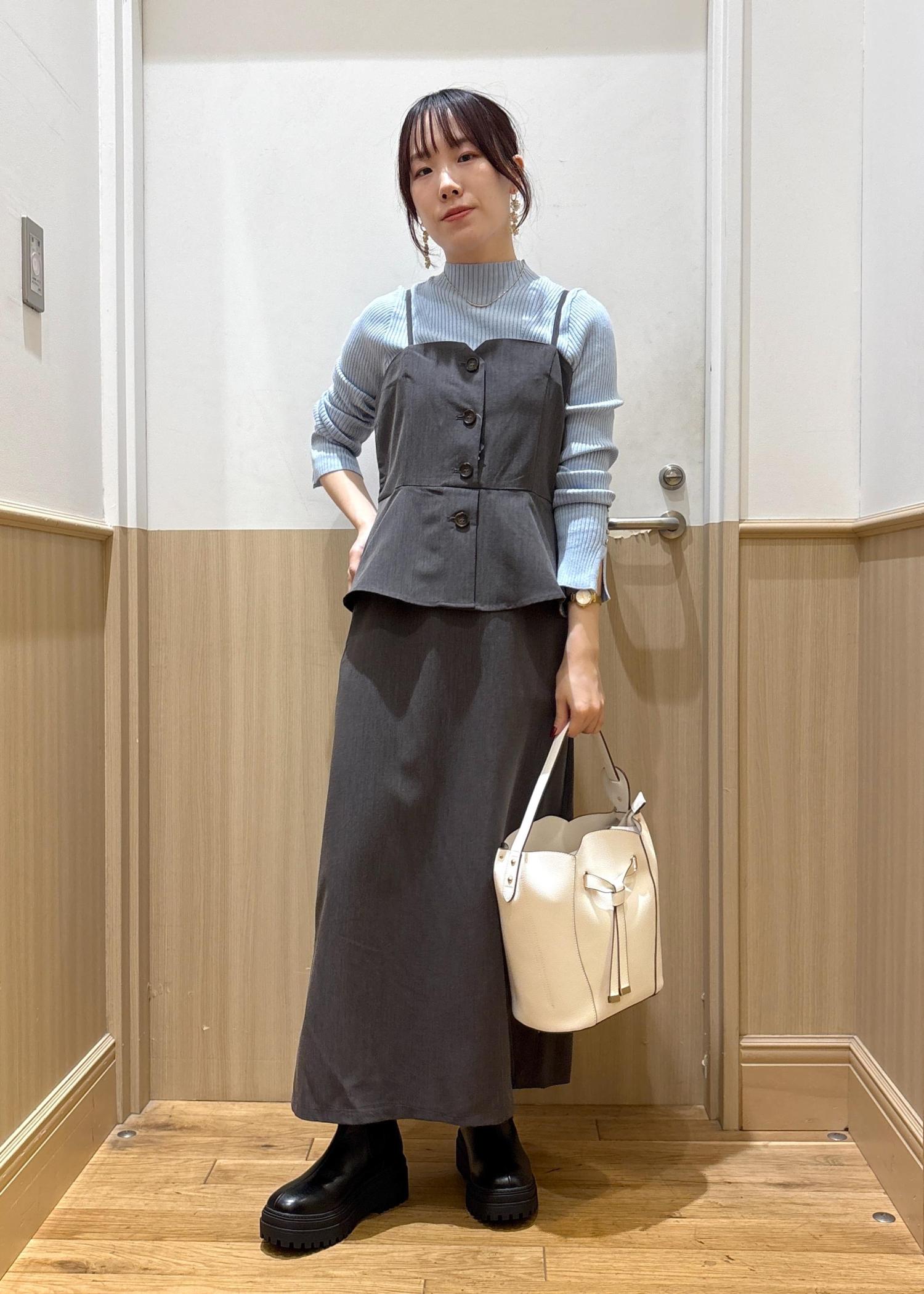 ビスチェドッキングワンピース×女性らしいリブニットの組み合わせがフェミニンで大人かわいいコーデ。