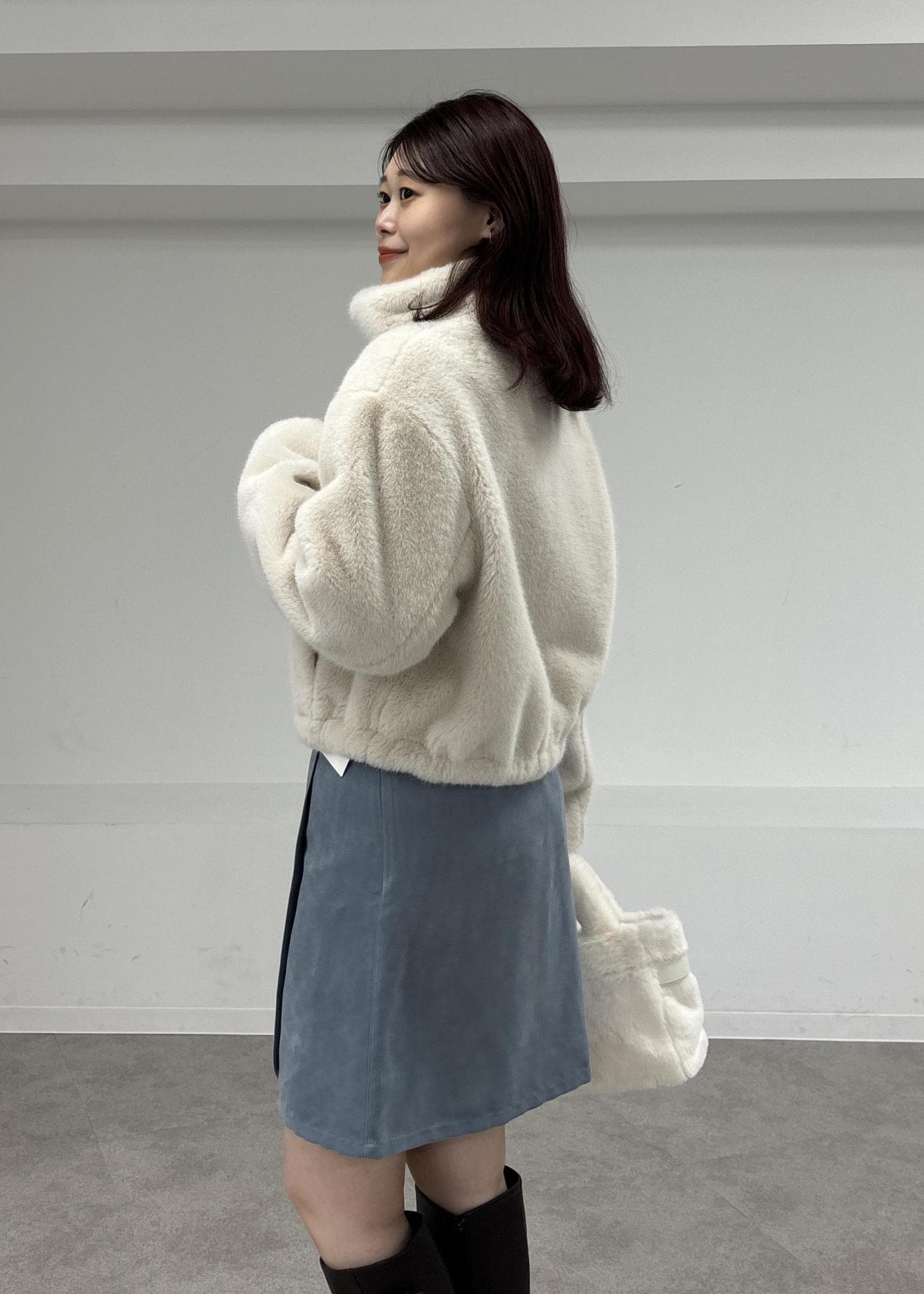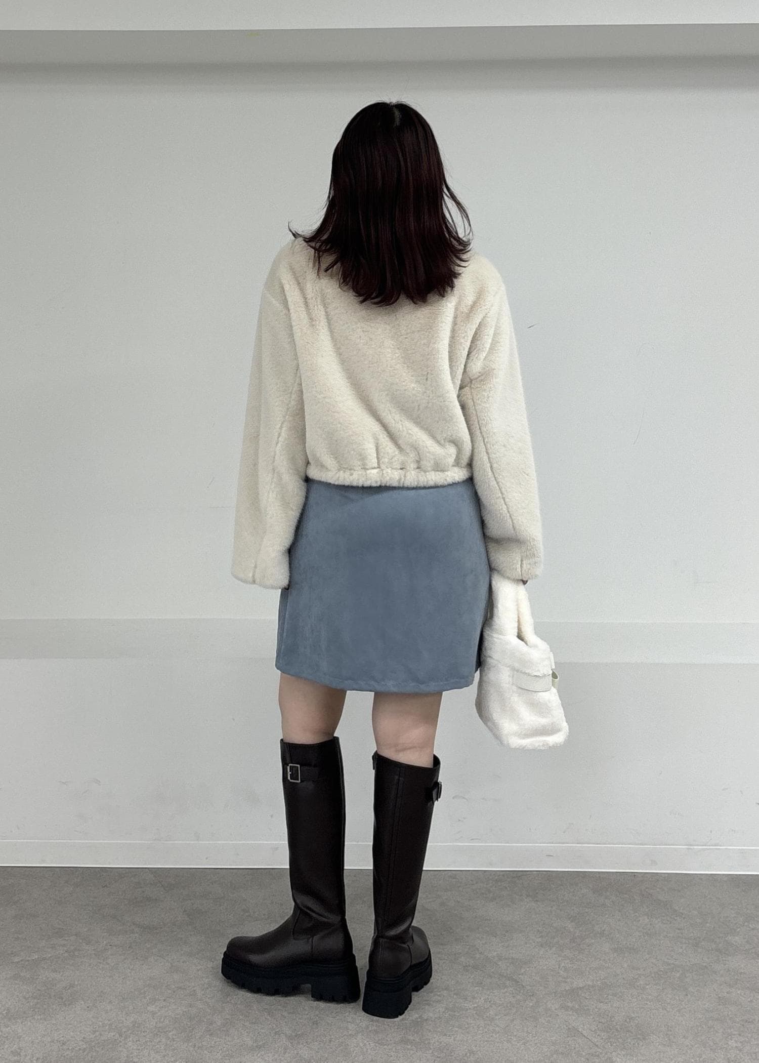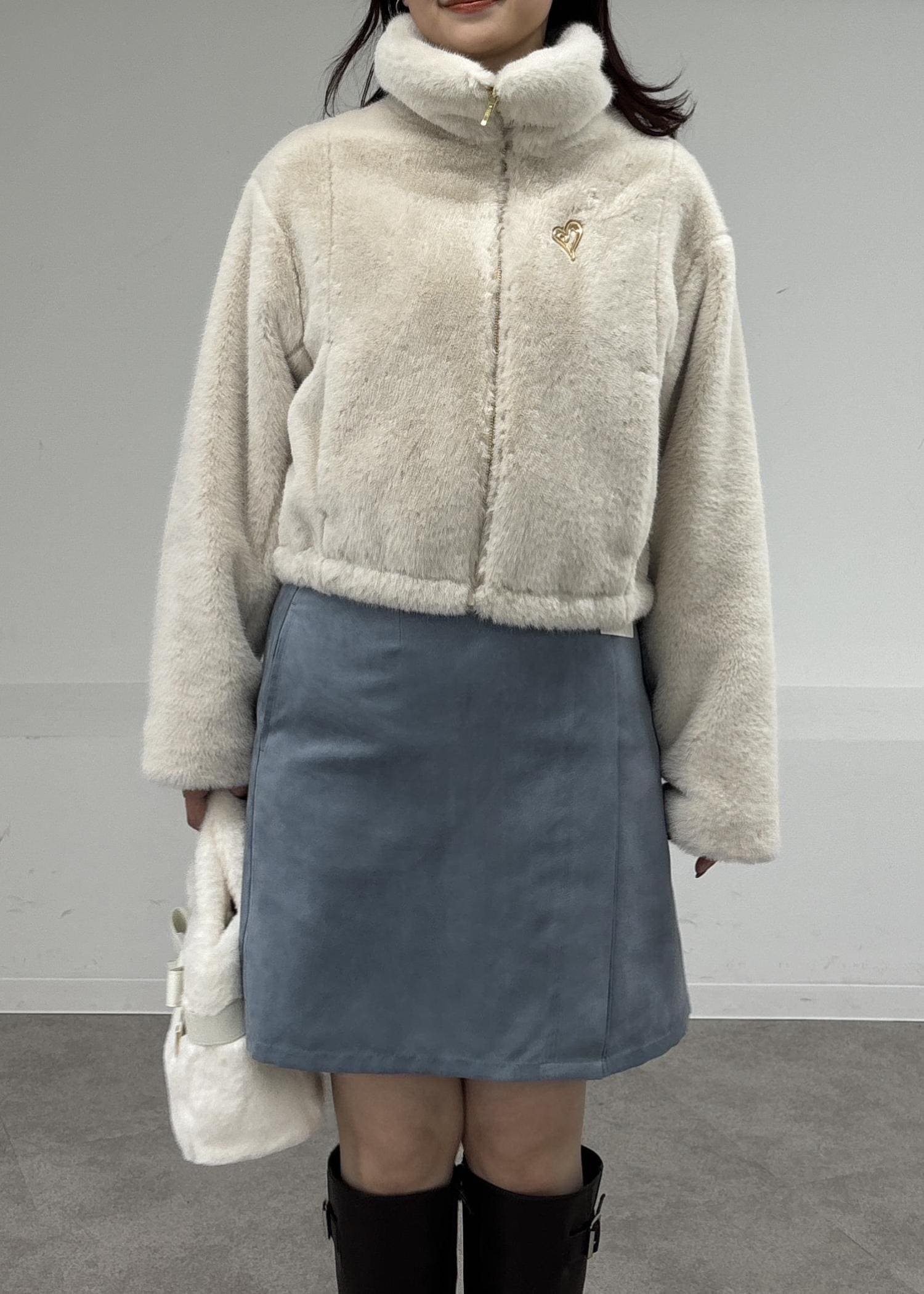 かわいいホワイト系のファーアウターに、スエード素材のミニ丈スカートにロングブーツで冬のフェミニンコーデに!