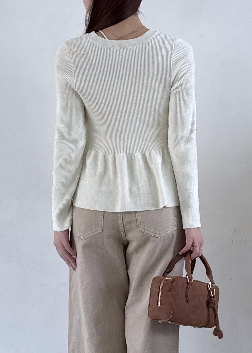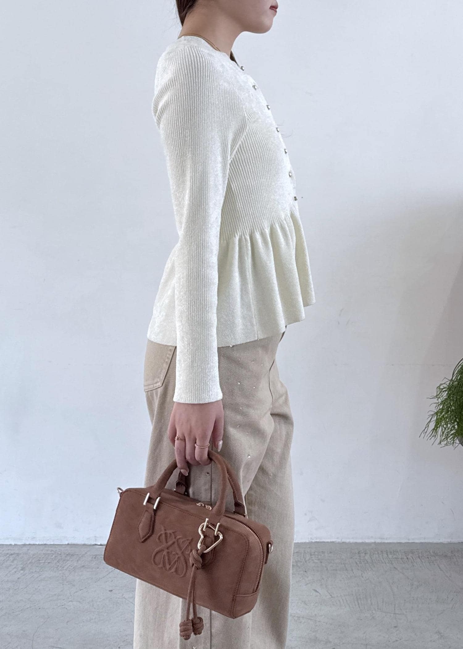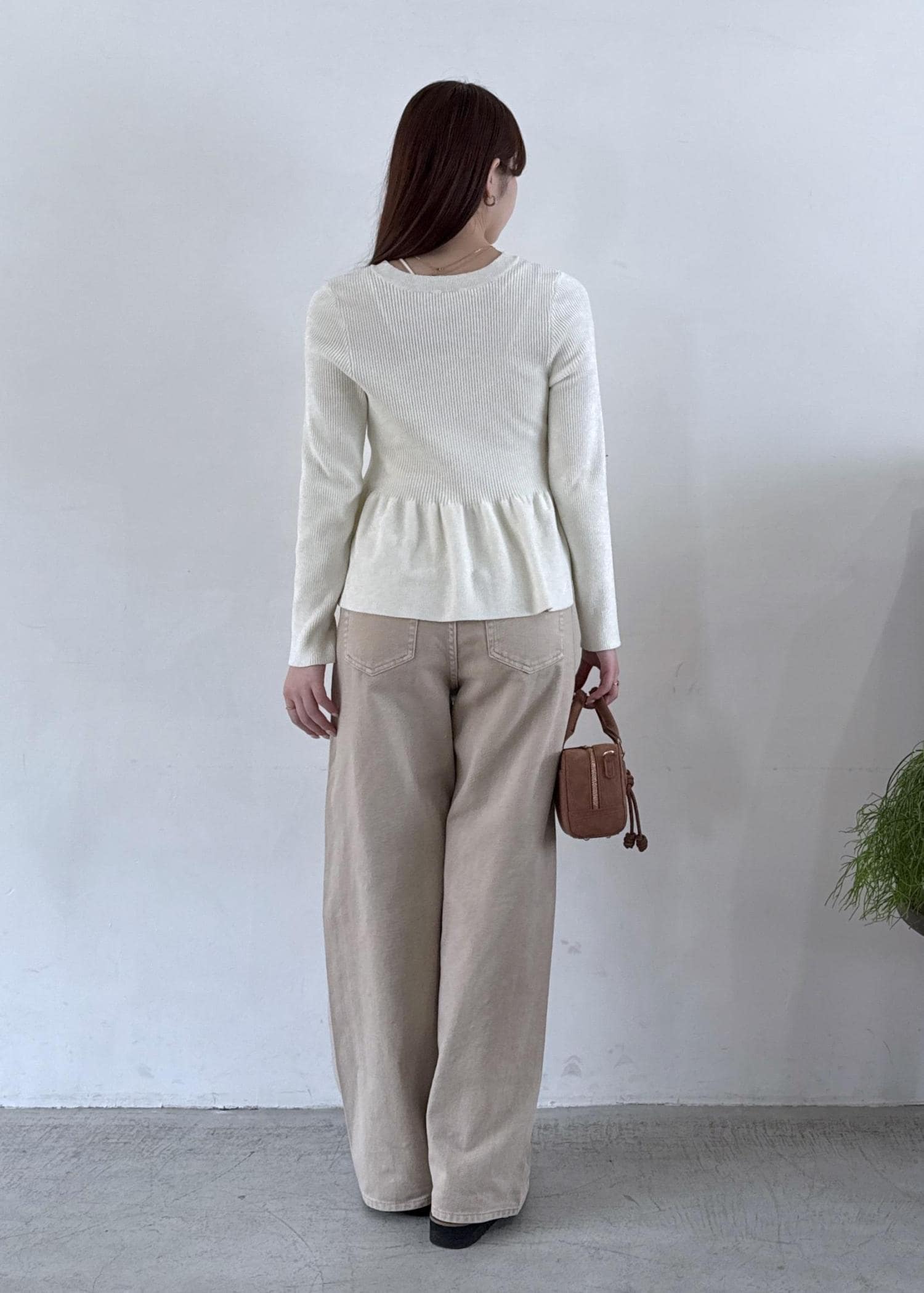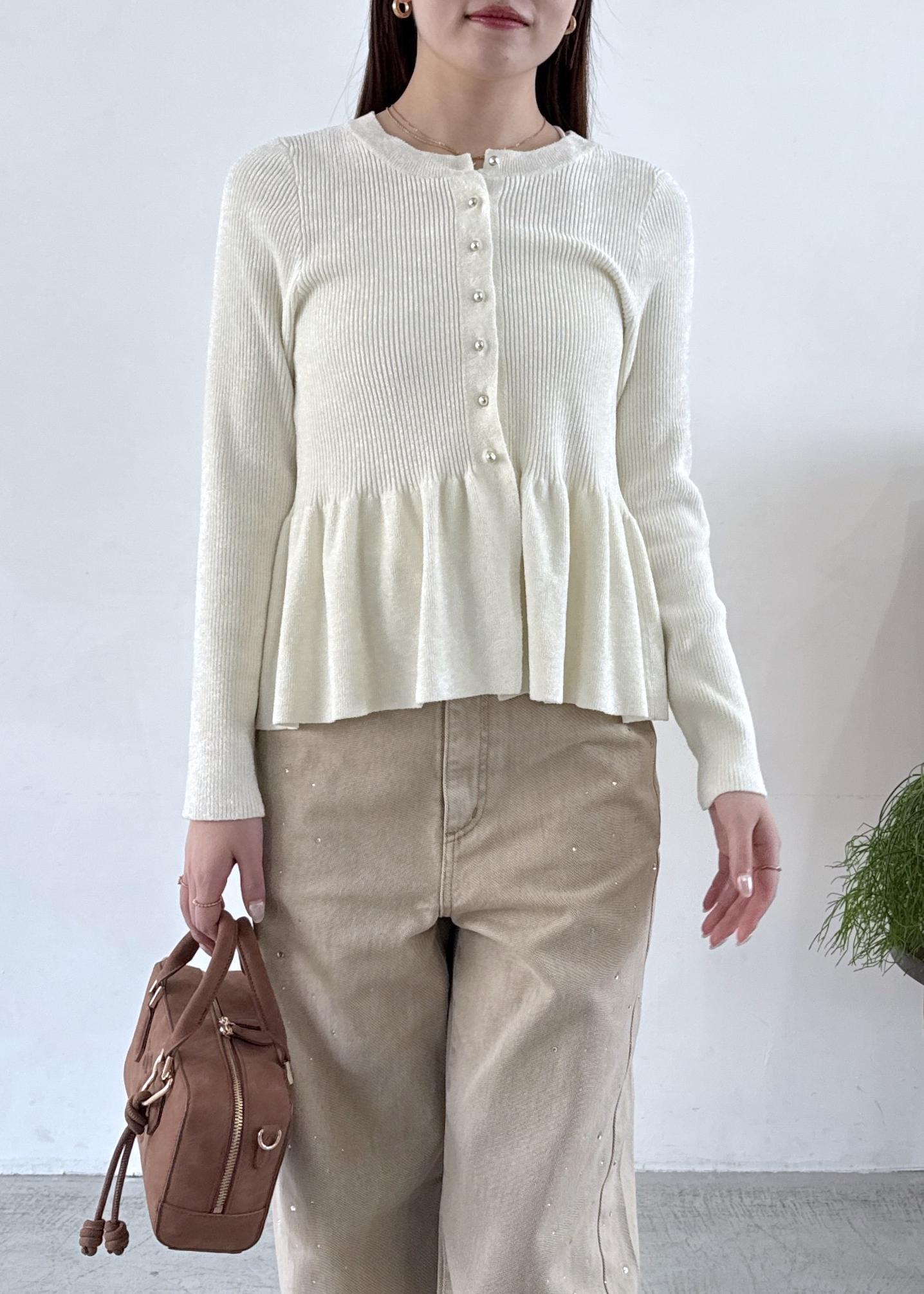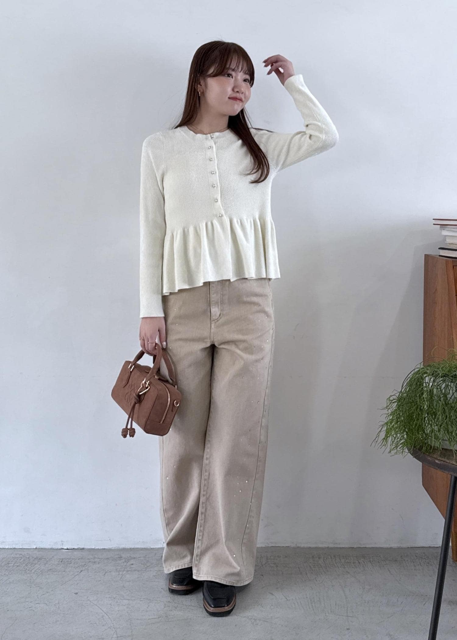 女性らしいペプラムデザインのカーディガンに、ビジューがポイントのベージュデニムを合わせて、フェミニン×カジュアルコーデ!お出かけスタイルにおすすめです◎
