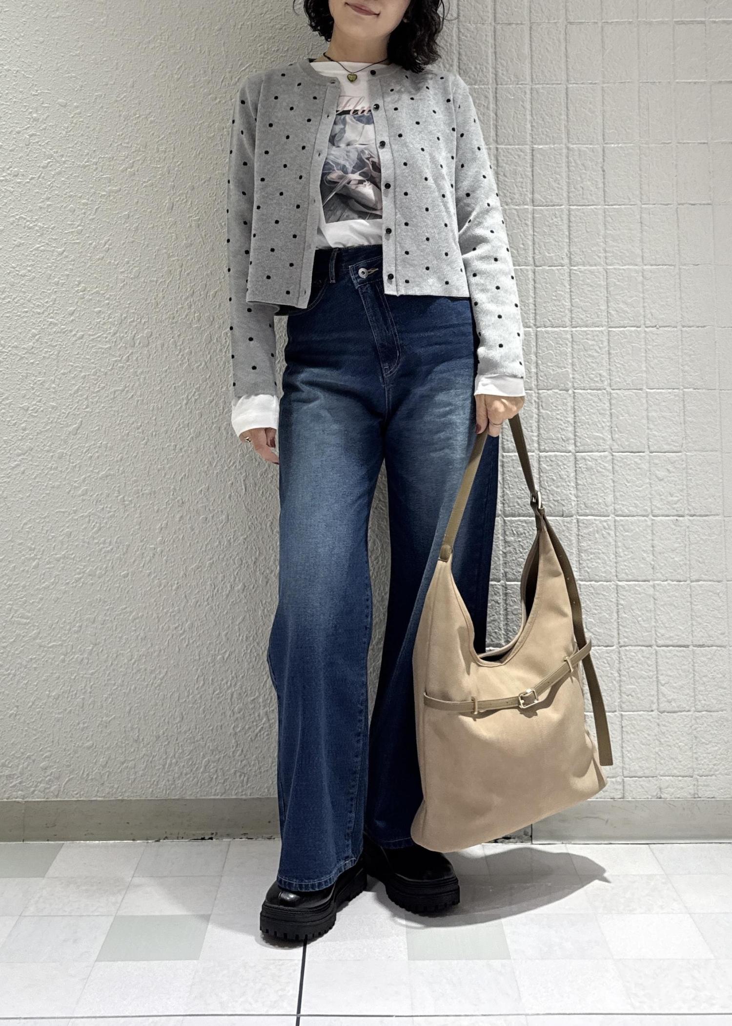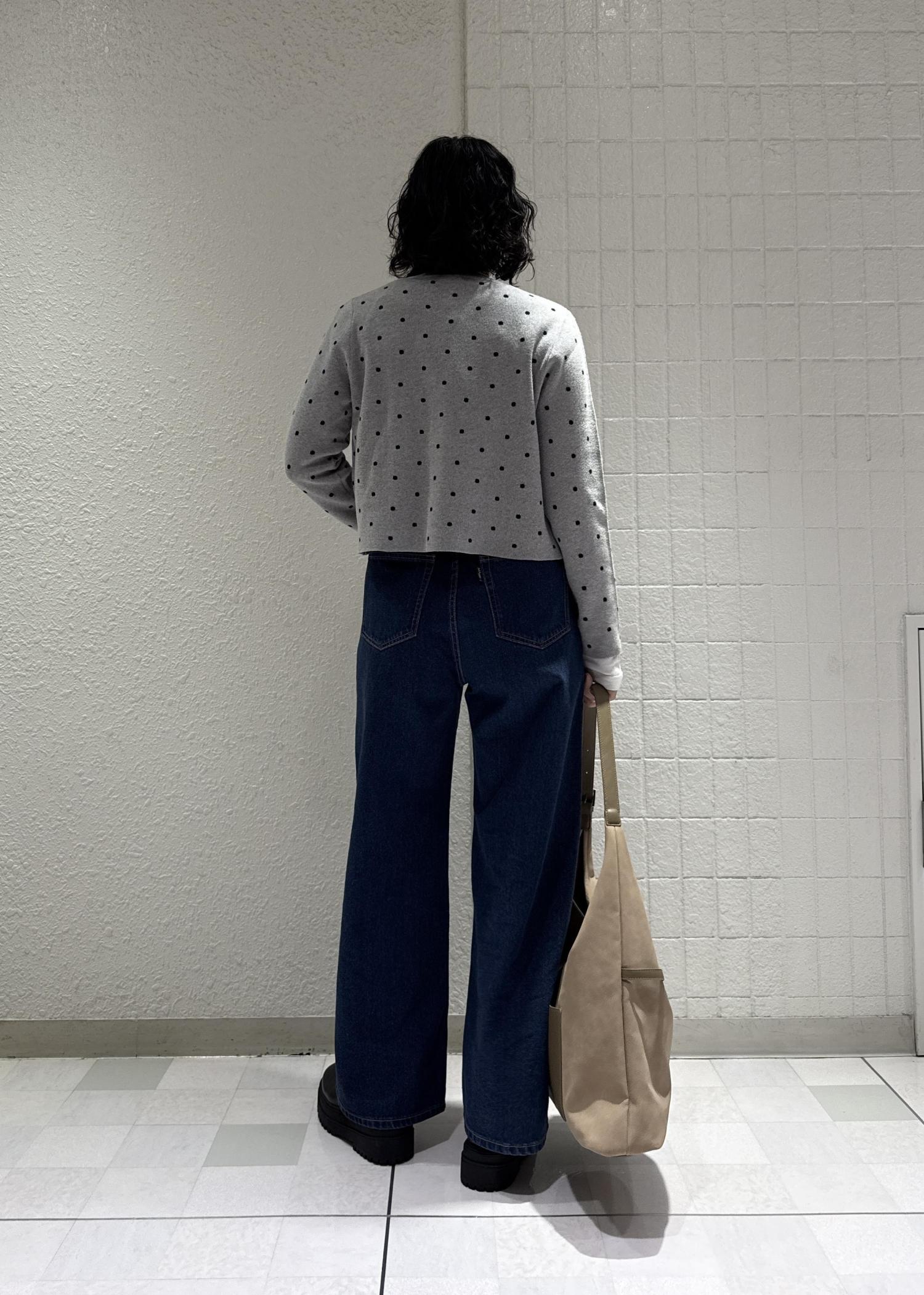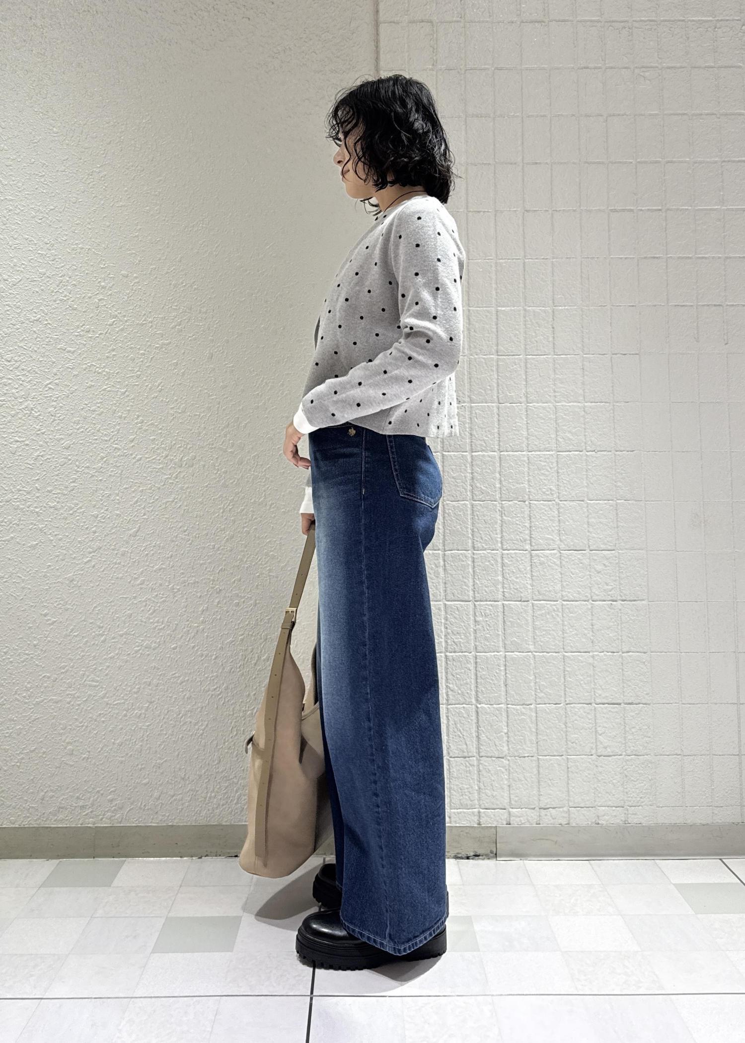 ドット柄カーディガンは思いっきり甘いスタイリングにしても可愛いですが、パンツスタイルに合わせて少しカジュアルな合わせも女っぽさが上がります!