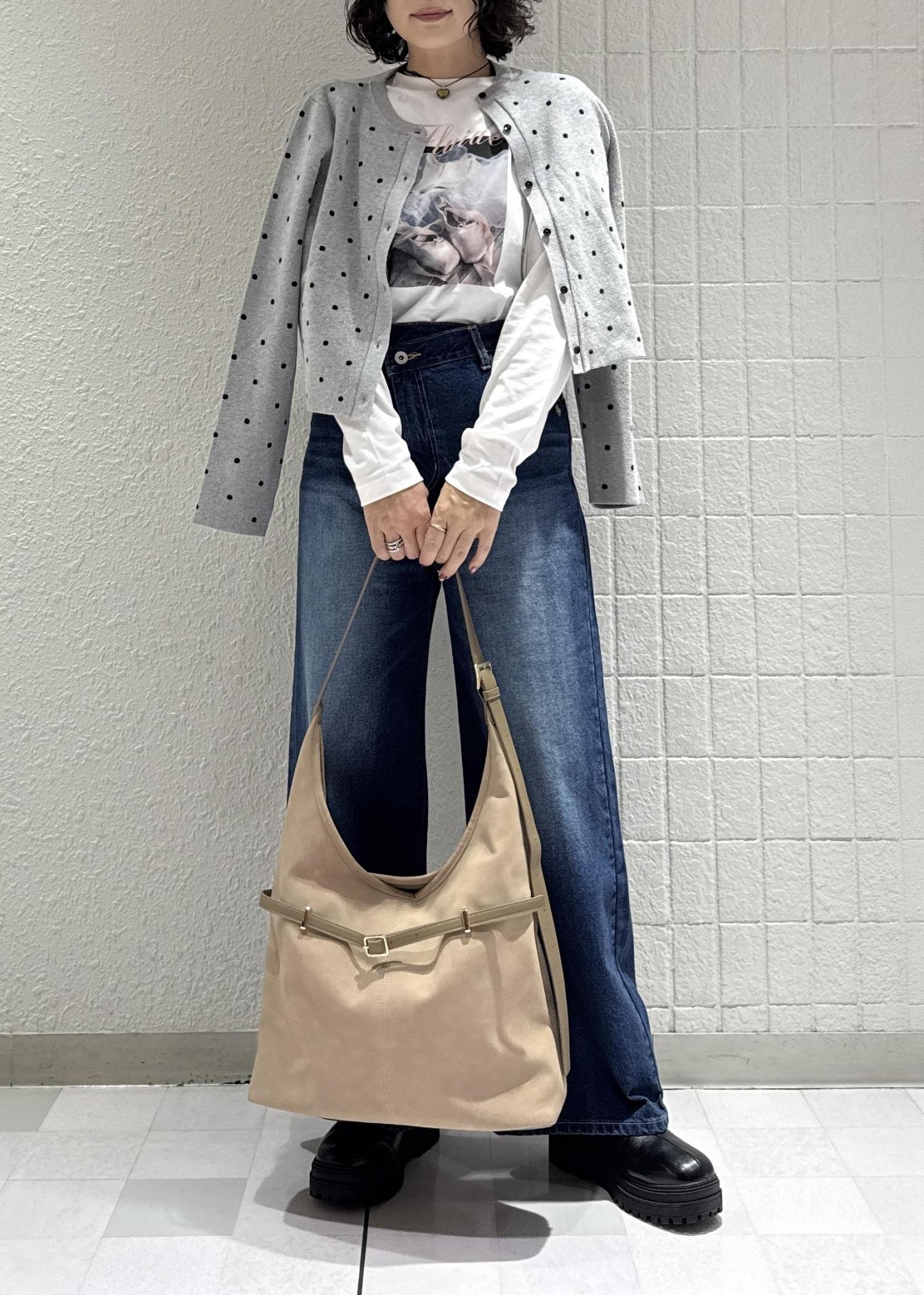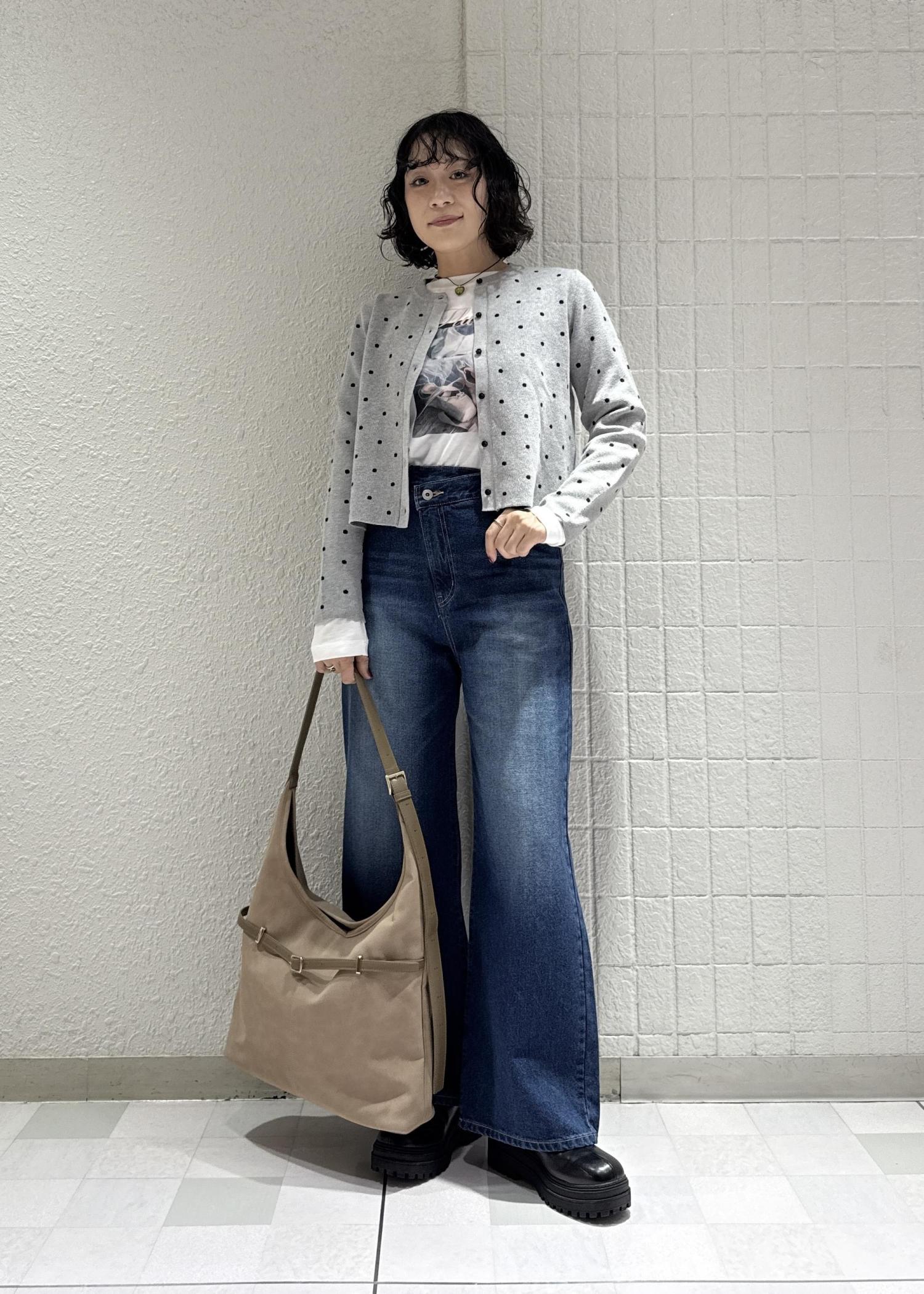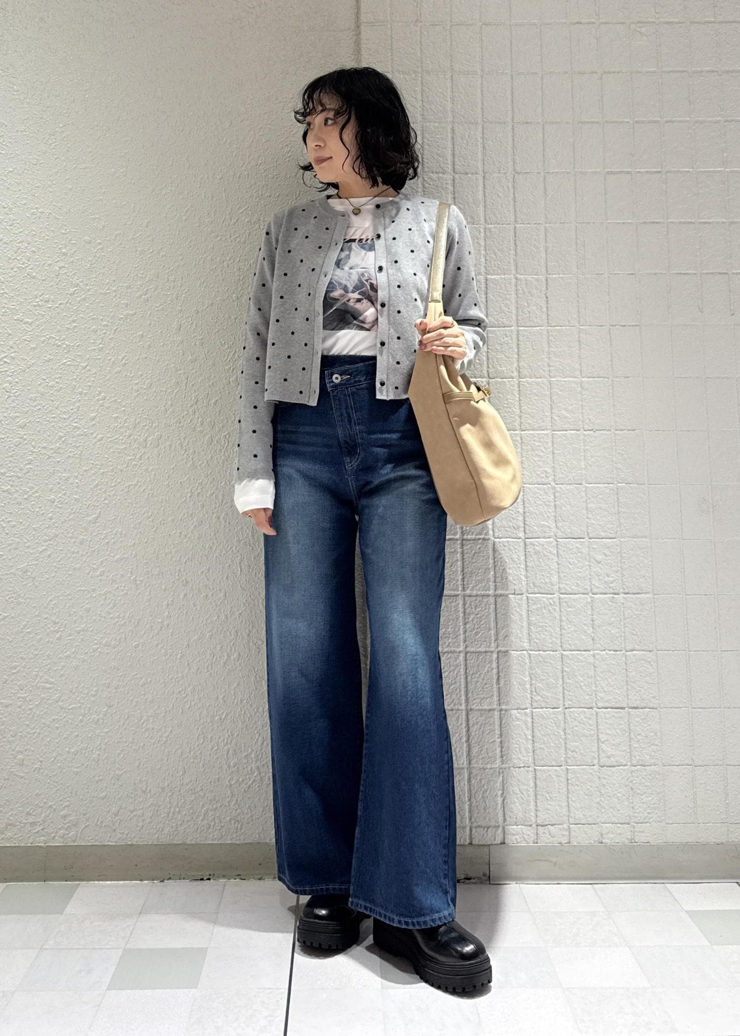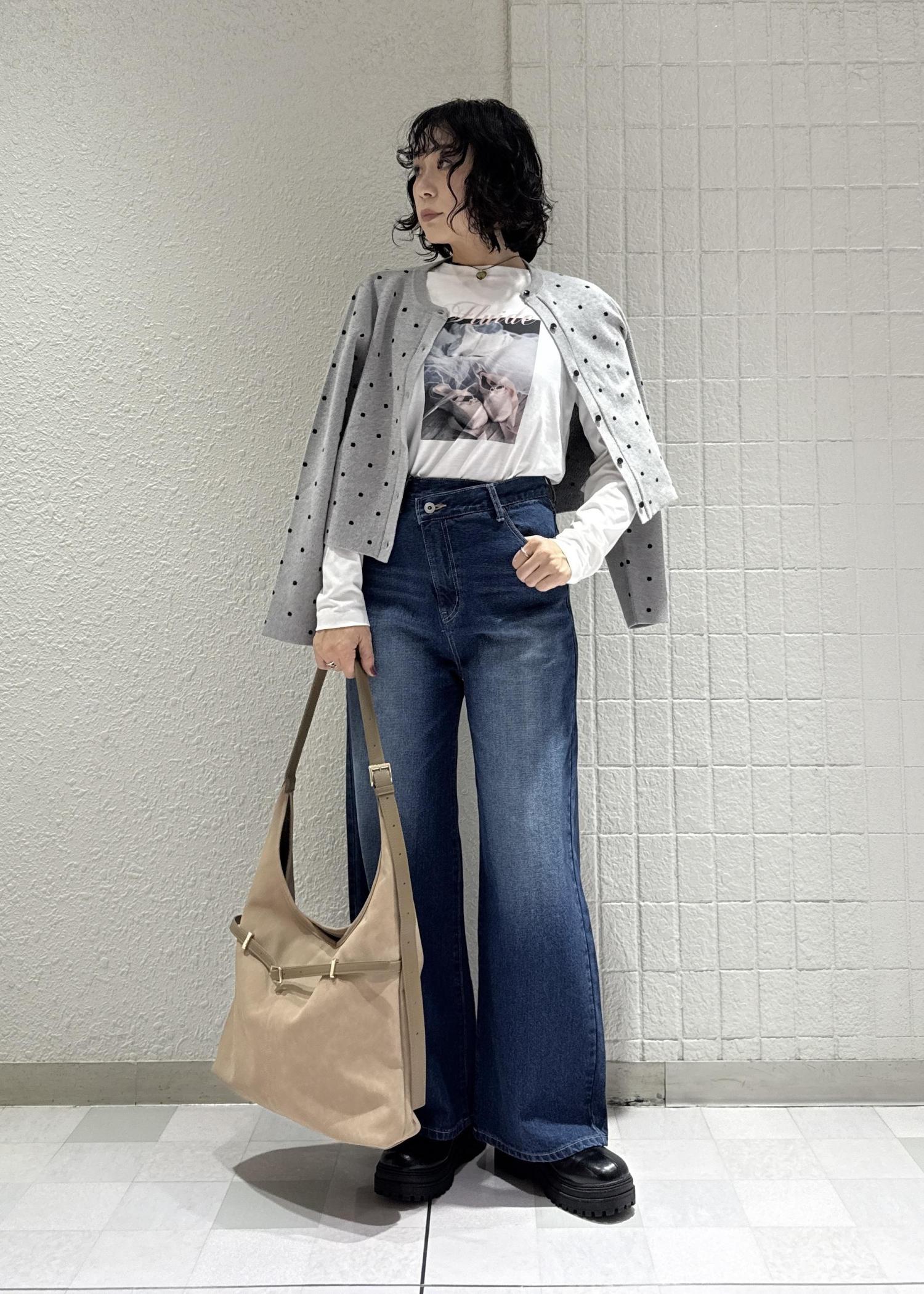 ドット柄カーディガンは思いっきり甘いスタイリングにしても可愛いですが、パンツスタイルに合わせて少しカジュアルな合わせも女っぽさが上がります!
