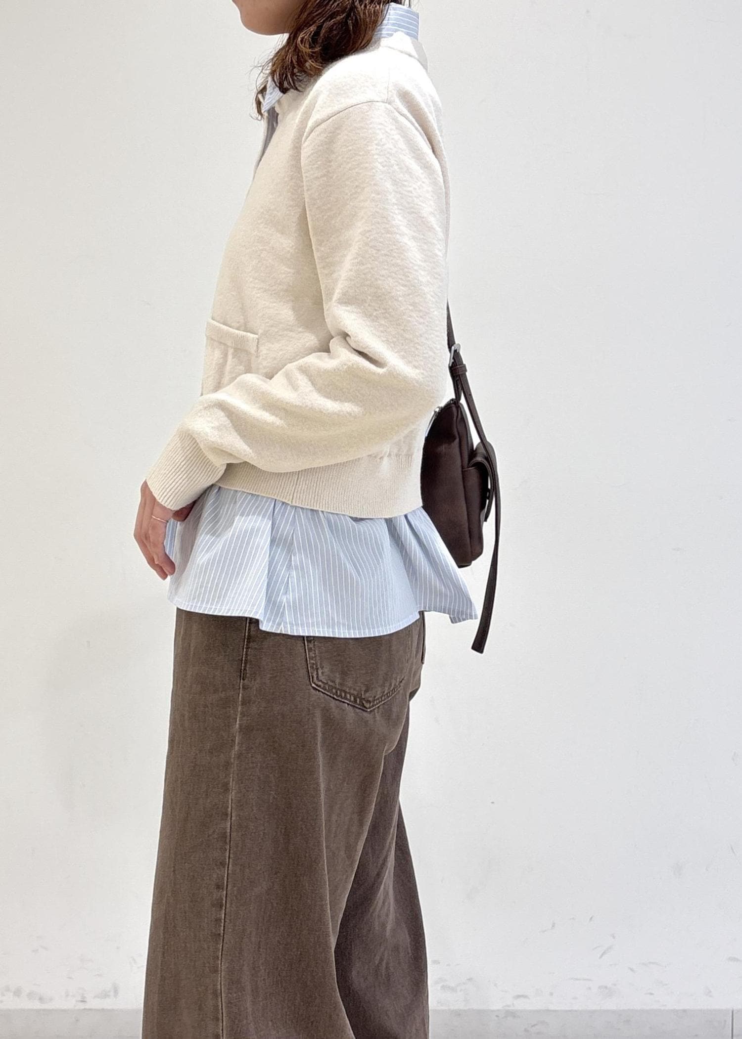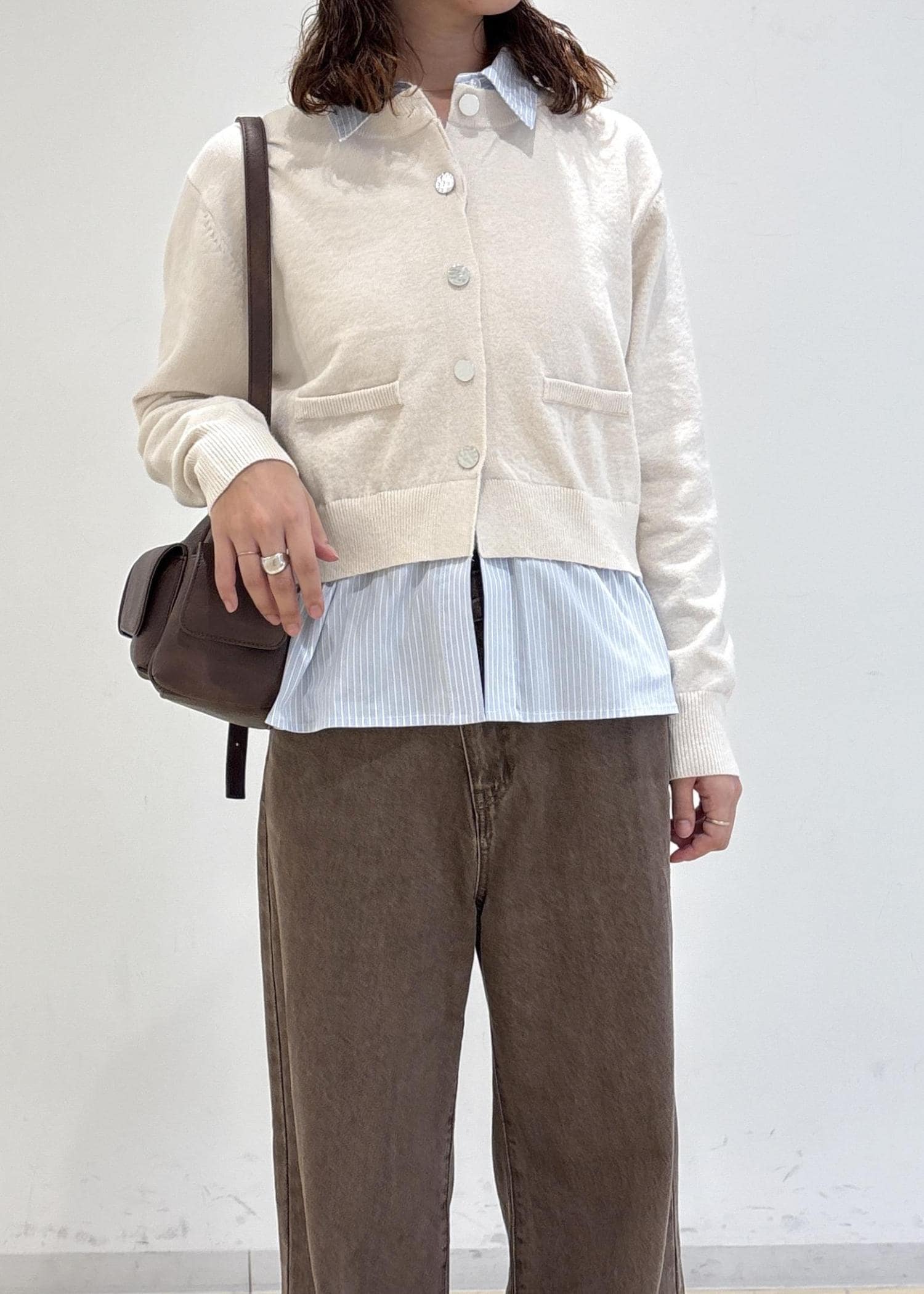 VISシャツレイヤード風メタルボタンカーディガンキナリ / F¥6,589レビュー160cm着用でヒップにかかる程の丈感です。