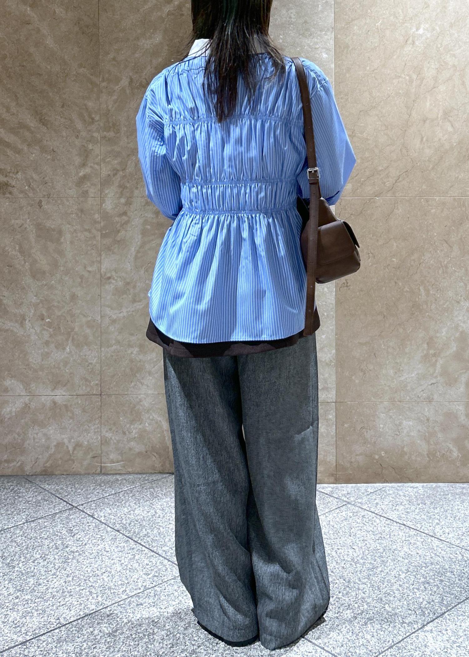 身体周りは全体的にゆとりがあり、背中はゴムになっているので、中にニットなども着られます◎