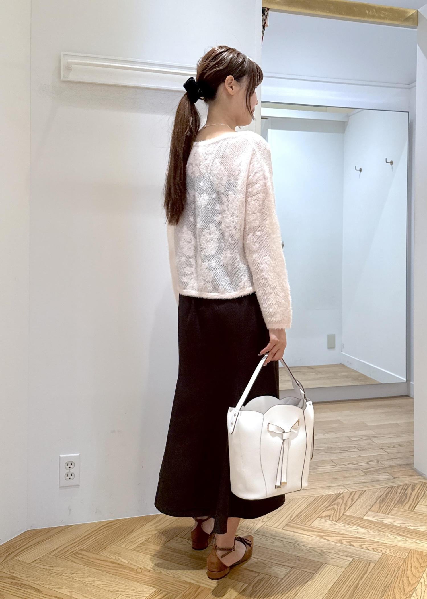 ピンクカラーがかわいい花柄シャギーニットに美シルエットのスカートを合わせた秋カラーコーデです。