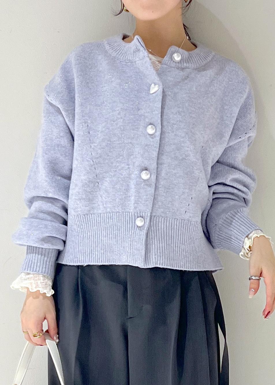 VISハートアソートパール釦ラメミックスカーディガン/イージーケア・一部WEB限定カラーパープル系 / F¥5,489レビュー152cmで腰より少し長いくらいの丈感でした!