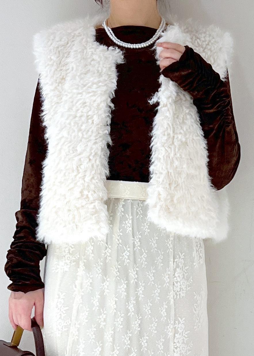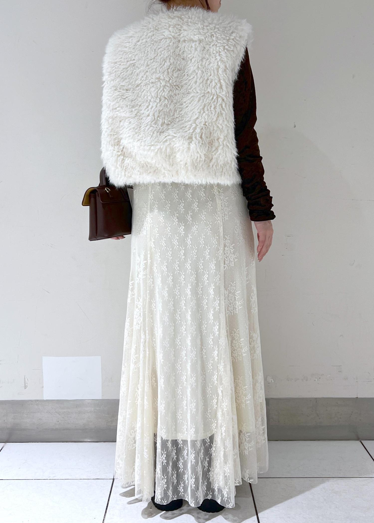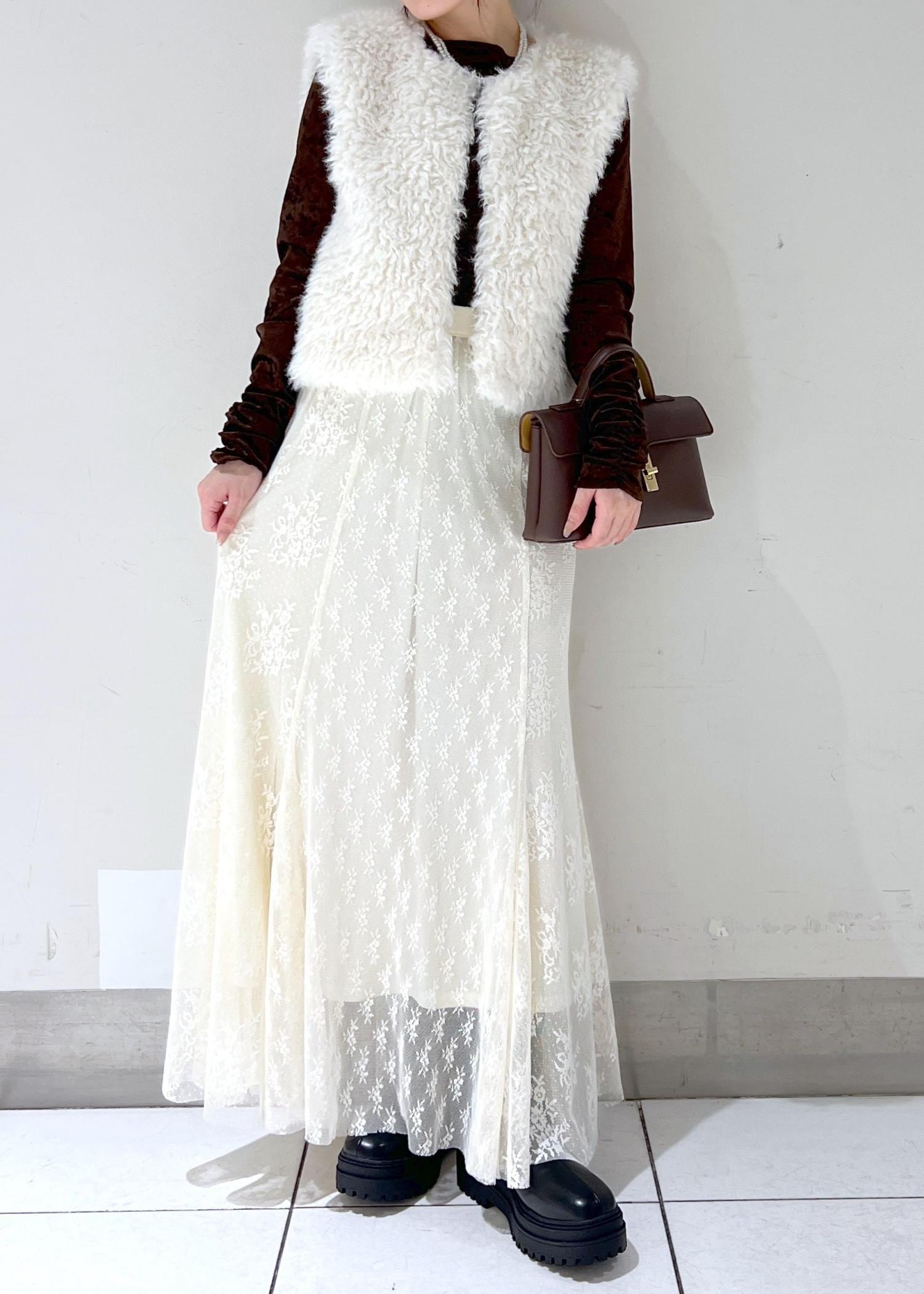 もこもこファーベストに、レースの組み合わせにブラウンの柔らかい差し色が女性らしいかわいいコーデにしてみました✨