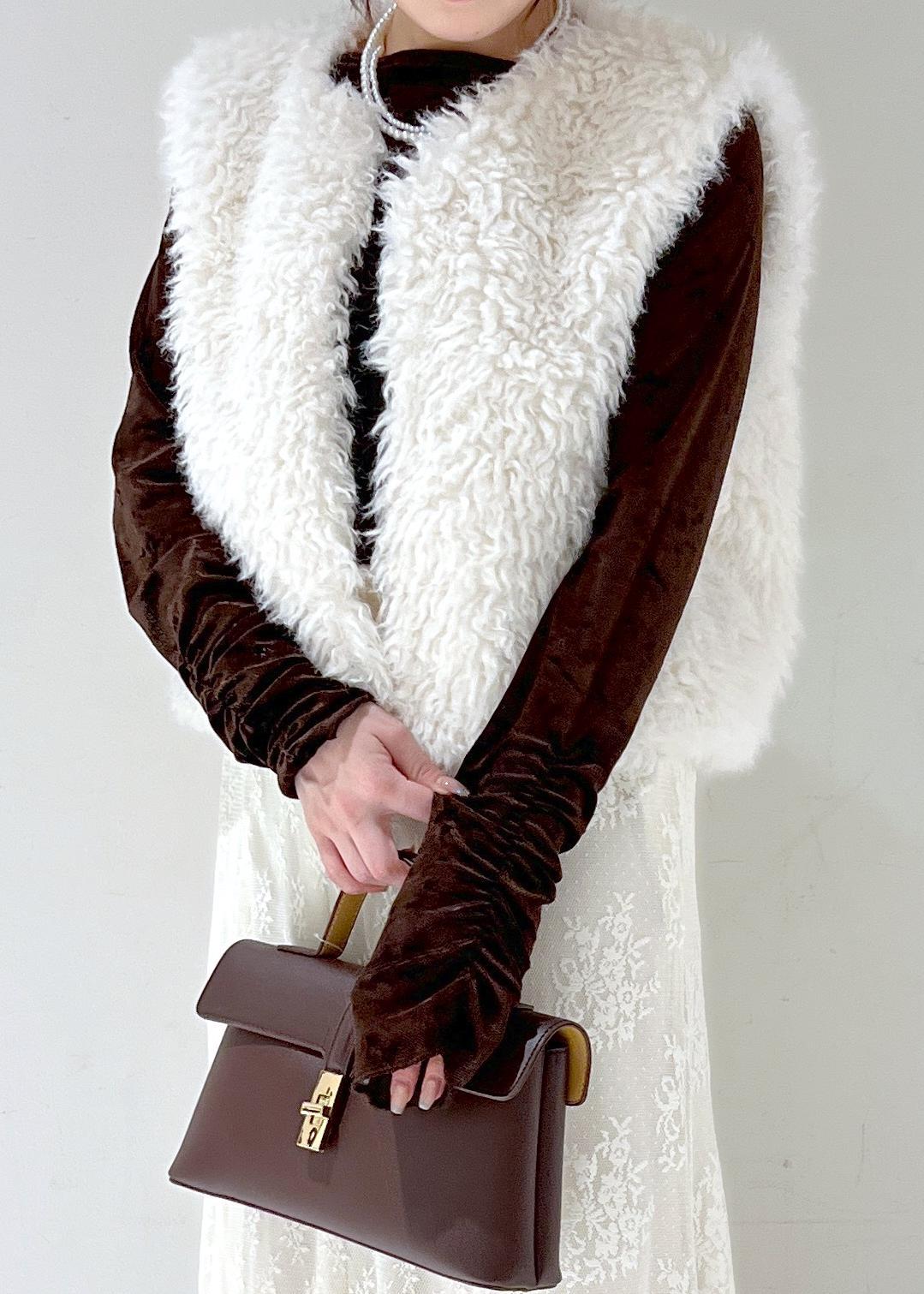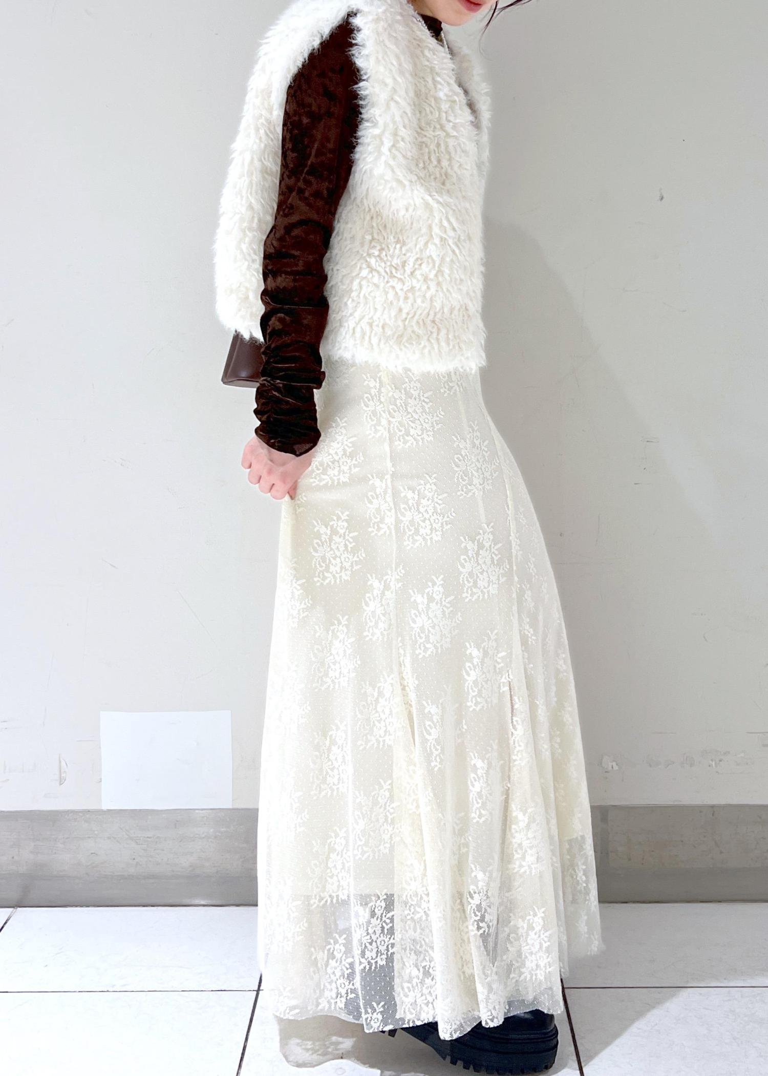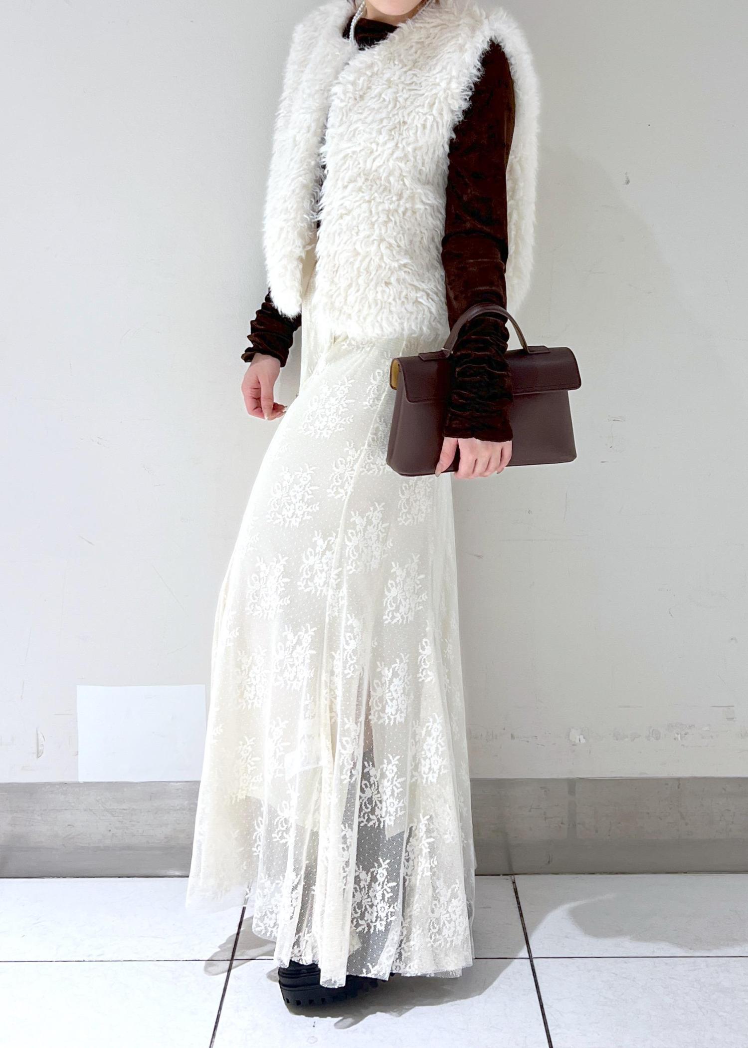 もこもこファーベストに、レースの組み合わせにブラウンの柔らかい差し色が女性らしいかわいいコーデにしてみました✨