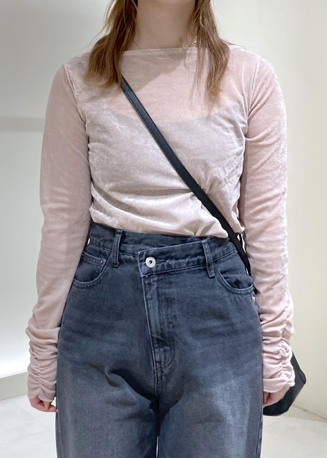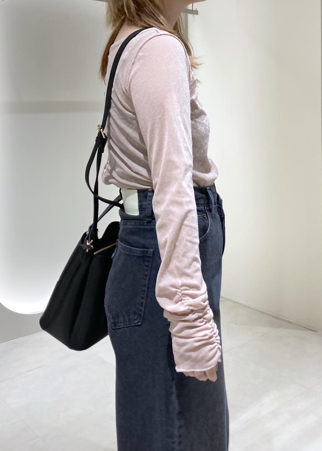 ギャザーデザインが華やかさを出してくれるのでシンプルなパンツとの組み合わせがおすすめです! -