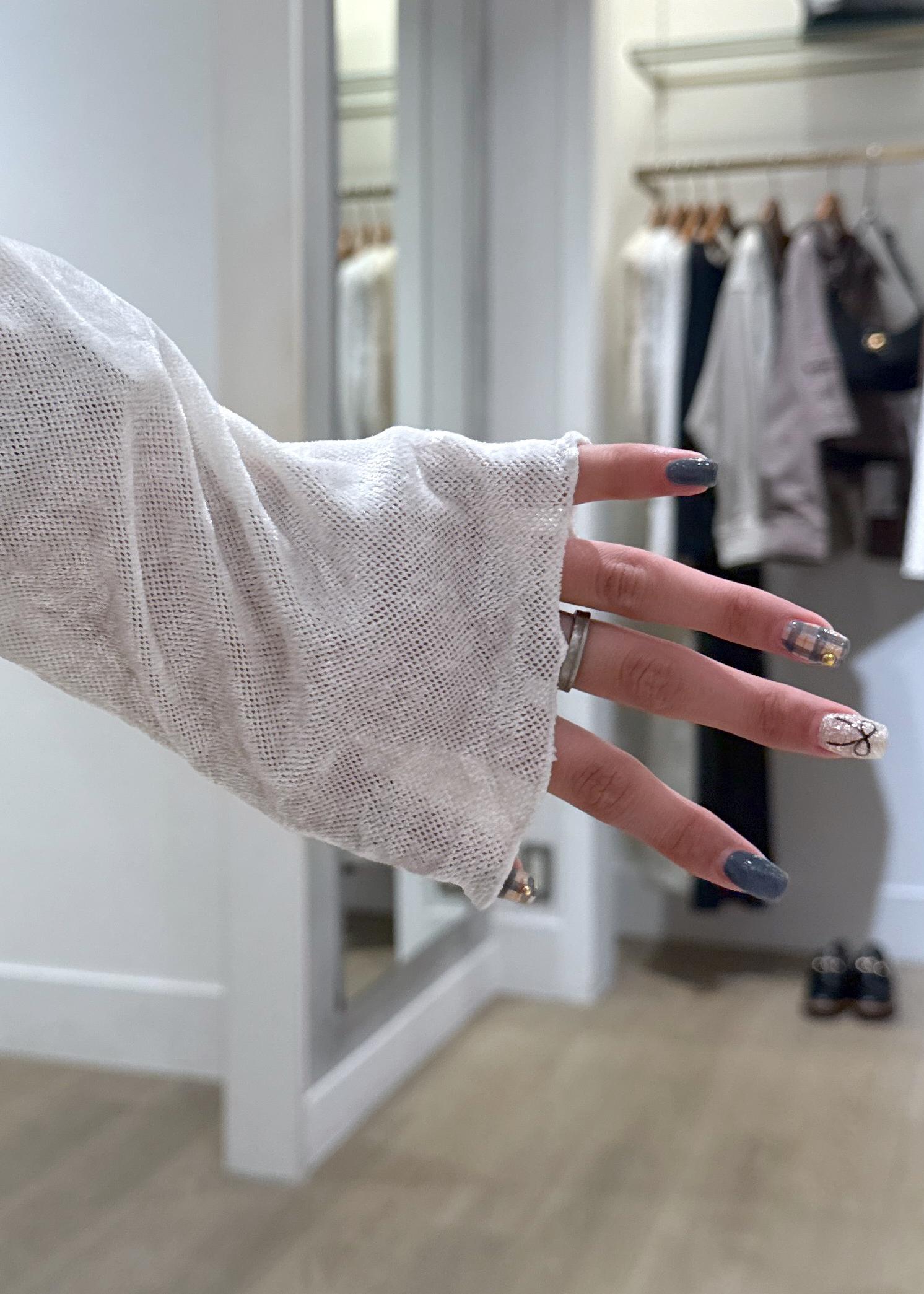 VISシアーベロアロングスリーブTシャツオフホワイト / F¥4,389レビューベロア素材ですが、少し透け感があって風通しがいいので、夏の終わりから使えるのが嬉しい。一足先に秋を取り入れられます◎