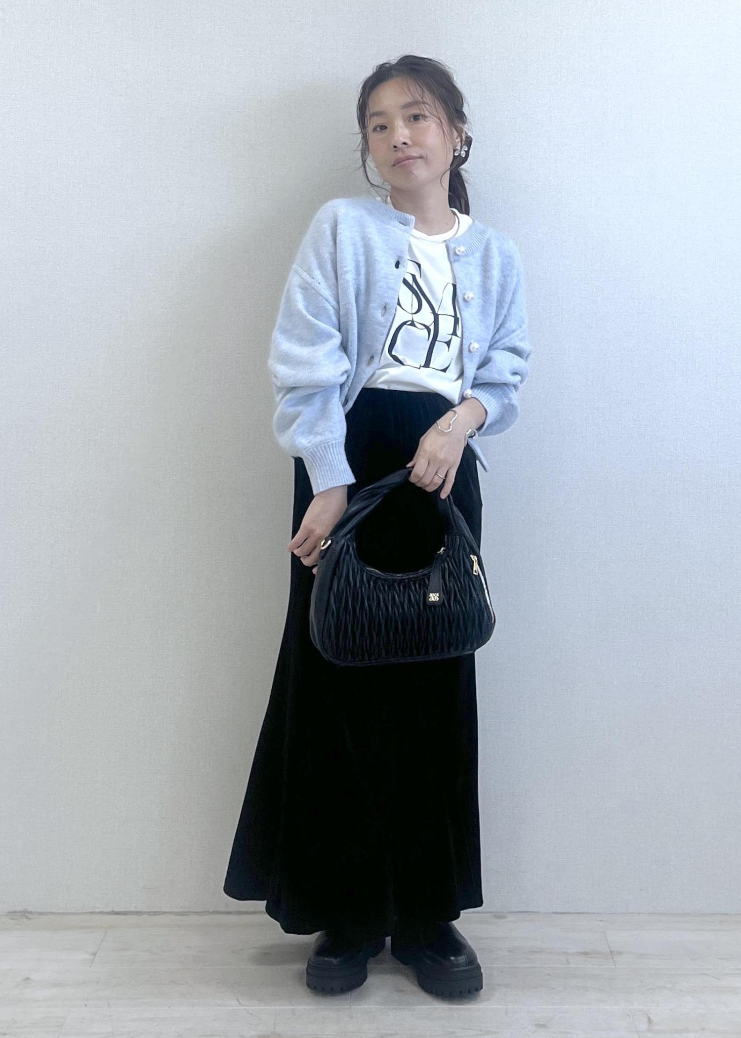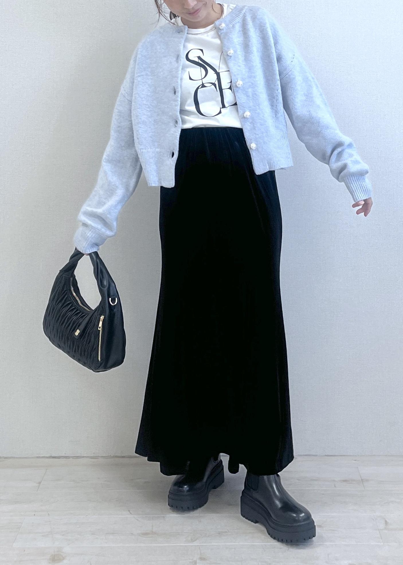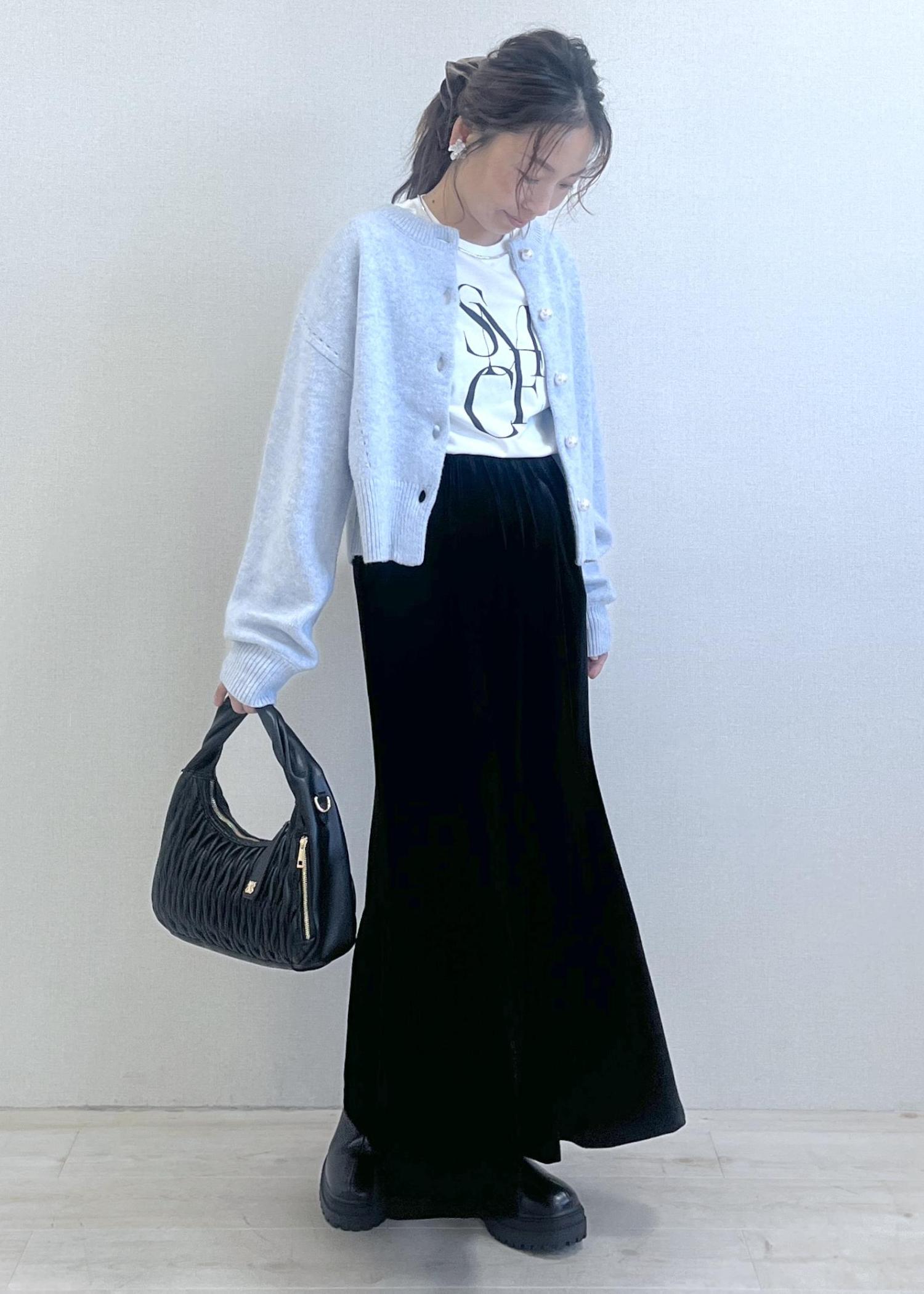 淡いブルーのカーディガンに、ロゴT×ベロアスカートを合わせた上品カジュアル。