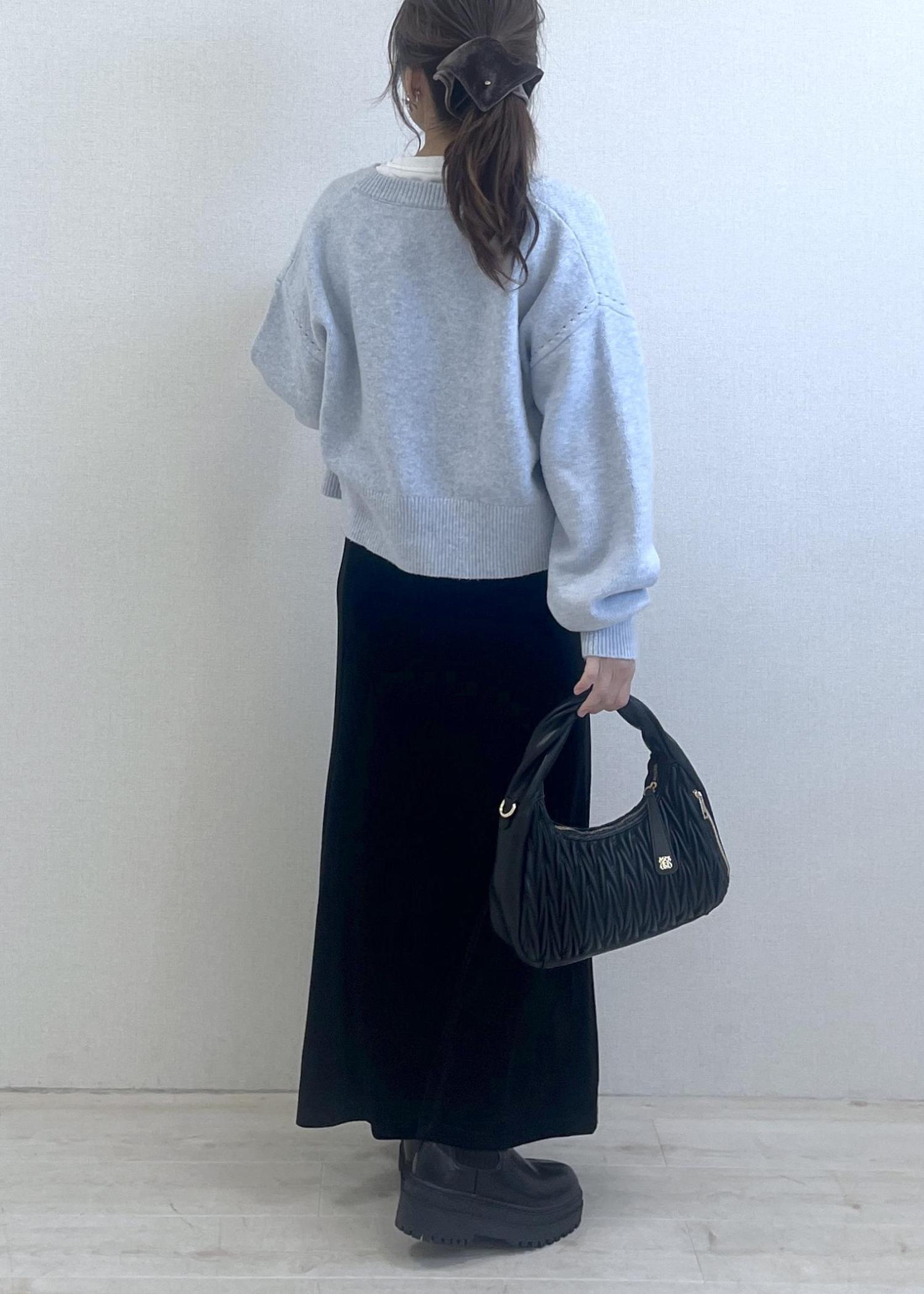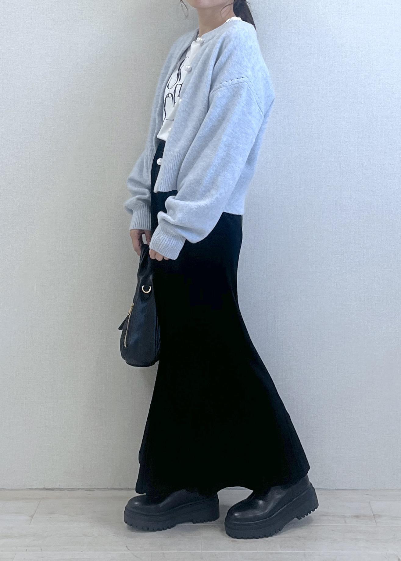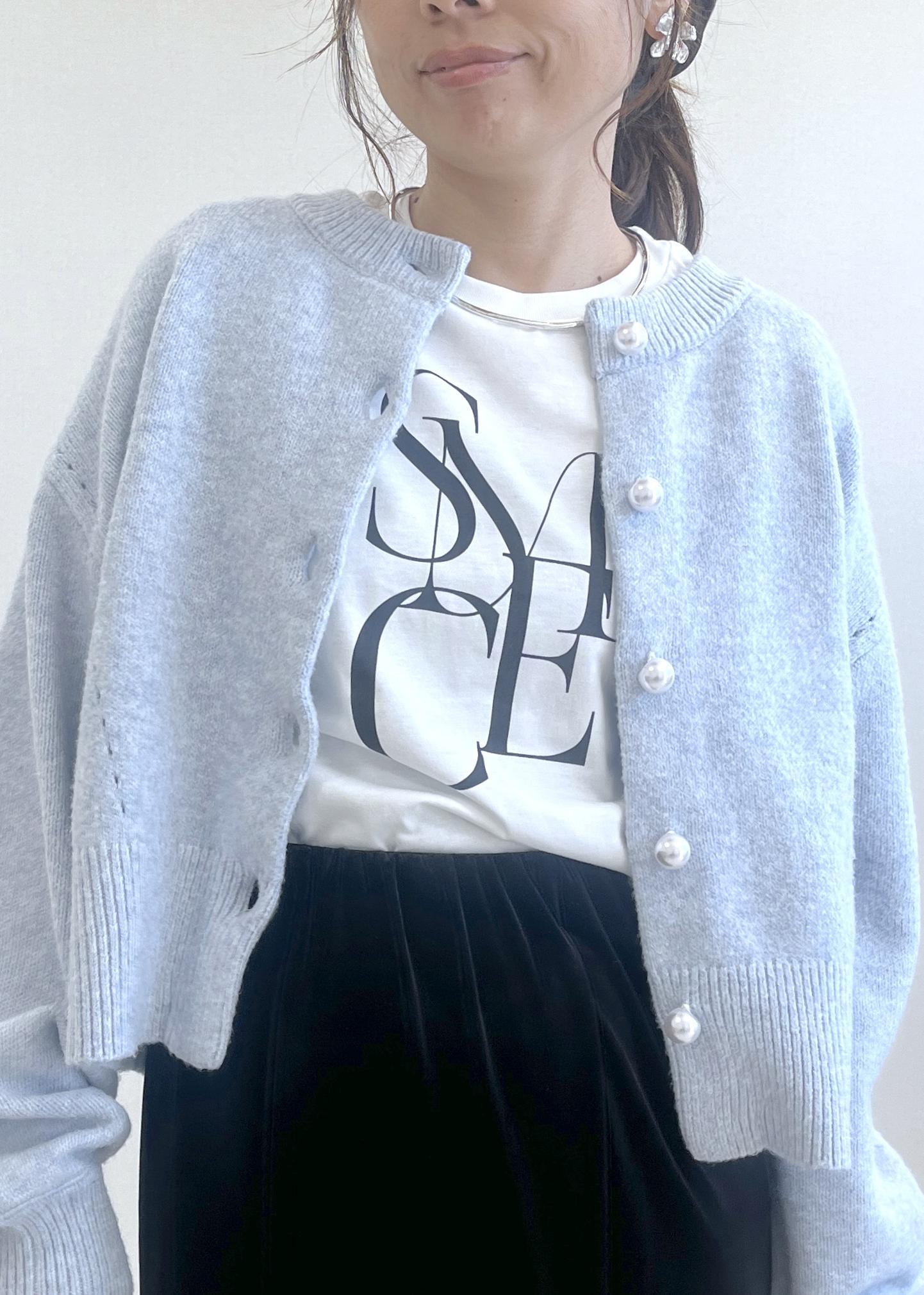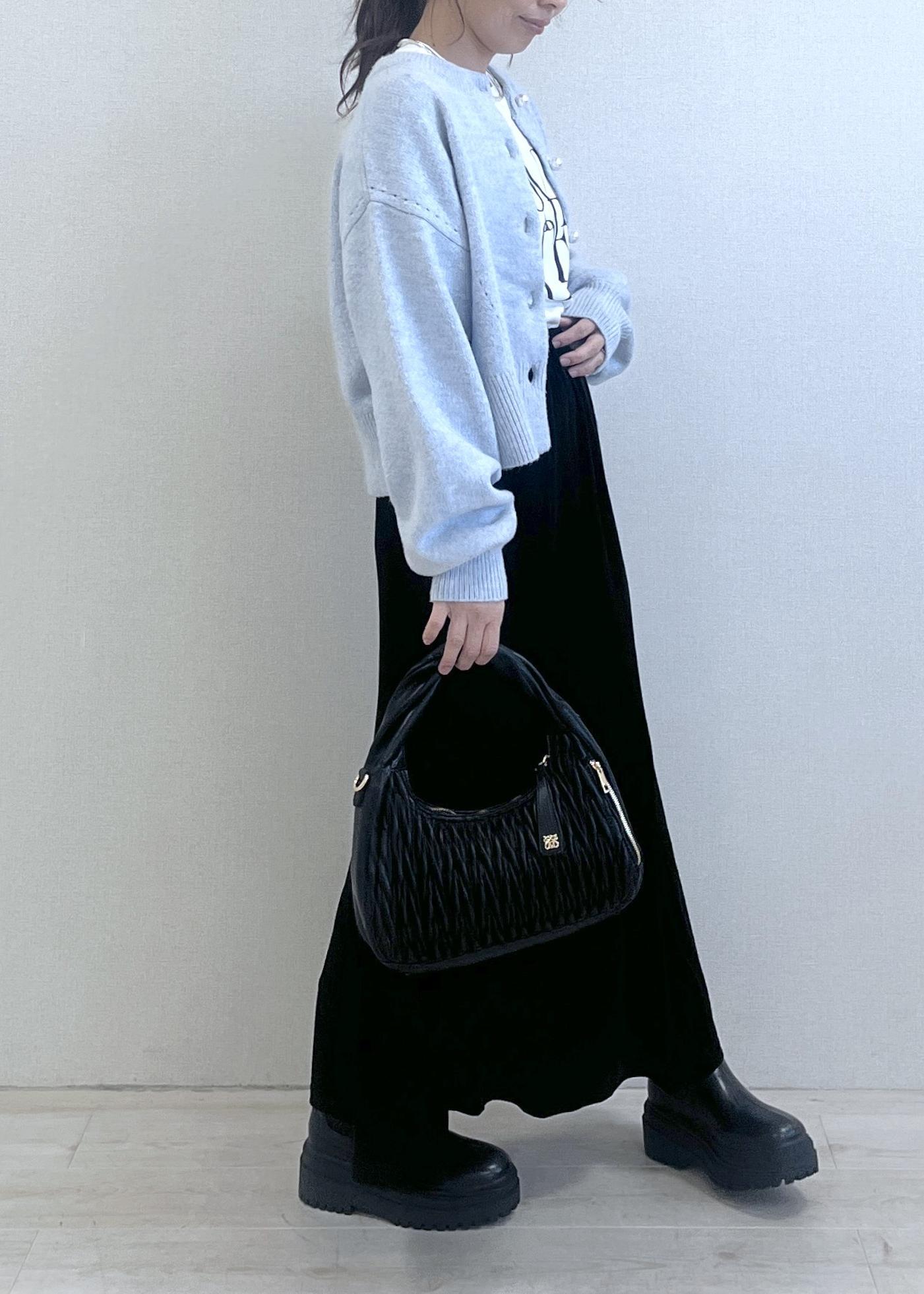淡いブルーのカーディガンに、ロゴT×ベロアスカートを合わせた上品カジュアル。