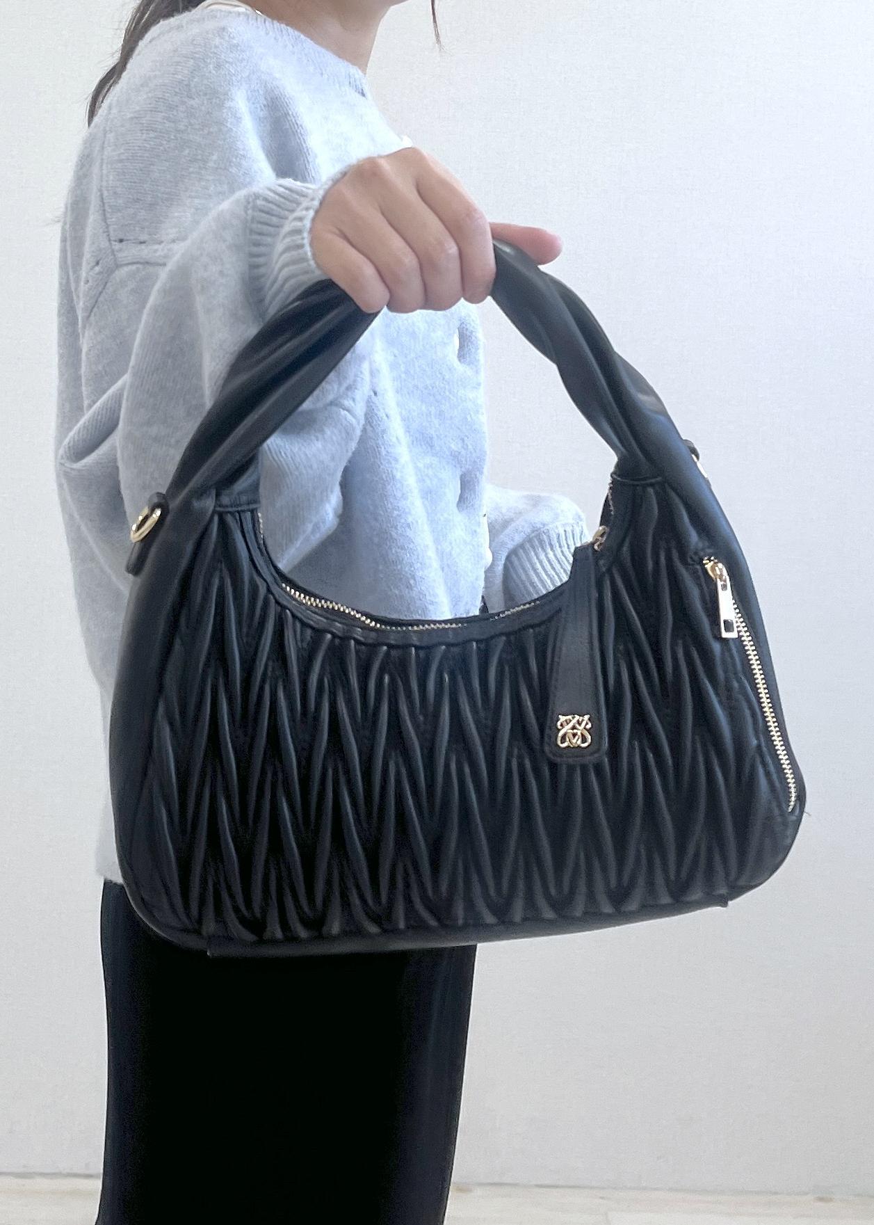VIS【2WAY】ねじりハンドルキルティングバッグブラック / F¥6,327レビューとっても柔らかい素材で軽い高見え効果◎なバッグです。コーディネートのアクセントにもなるデザインがポイントです。ペットボトルも長財布もいれられる見た目以上に大容量です。
