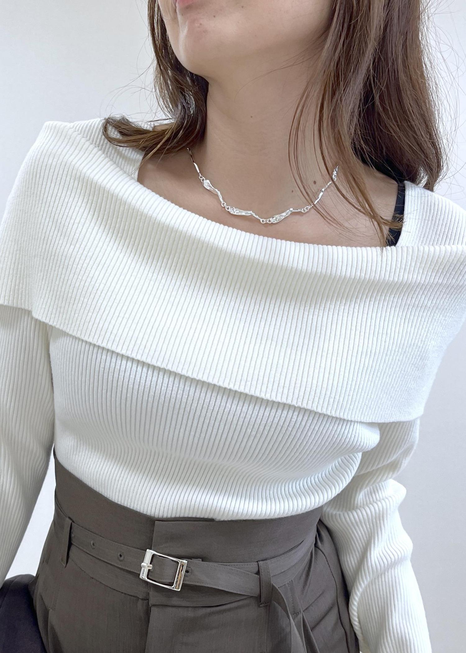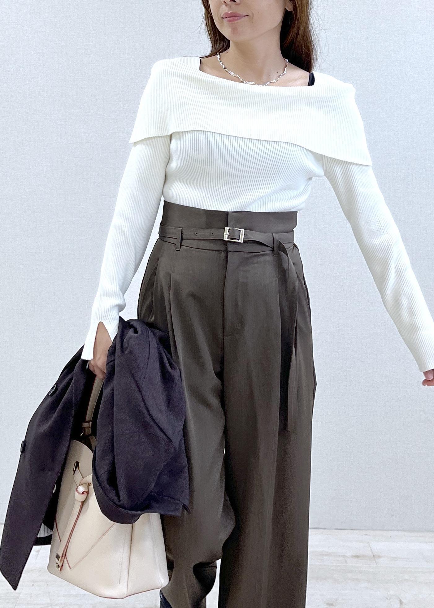 肩まわりのラインをきれいに見せるオフショル風ニットに、