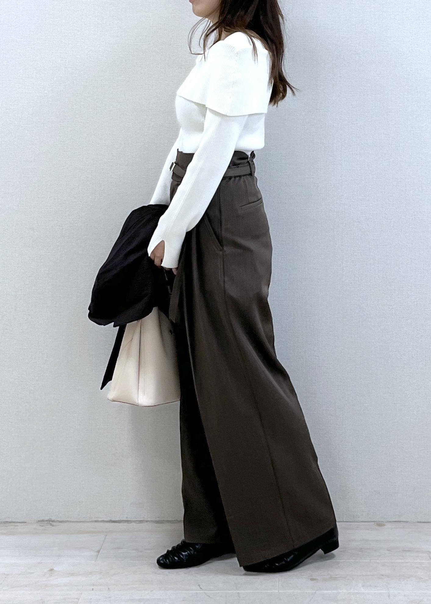 季節感と上品さを両立した秋のきれいめコーデに仕上がります。