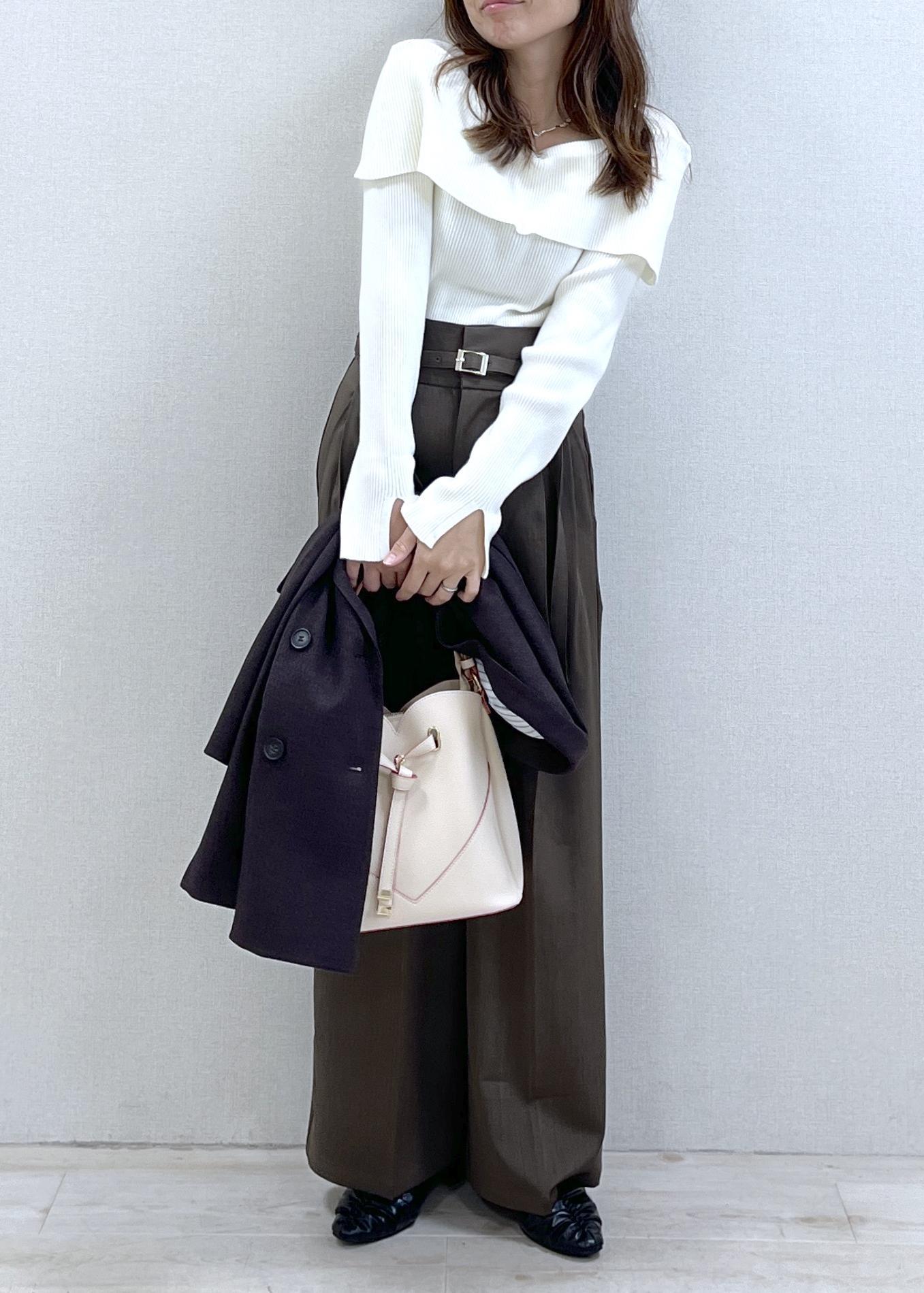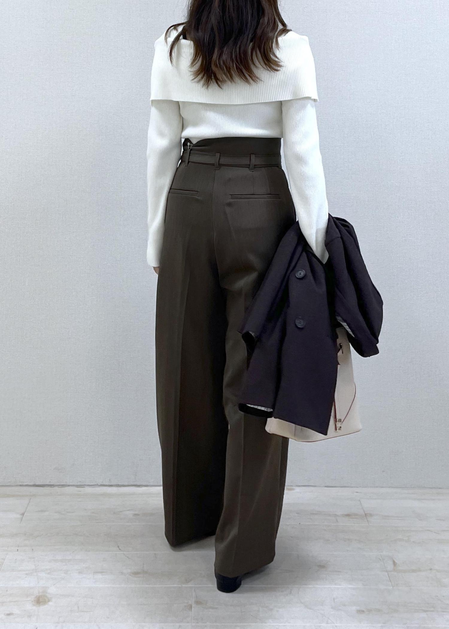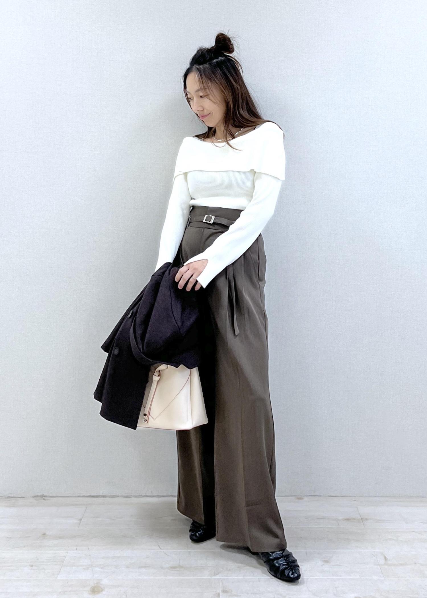 タック入りのワイドパンツを合わせて大人な抜け感を。
