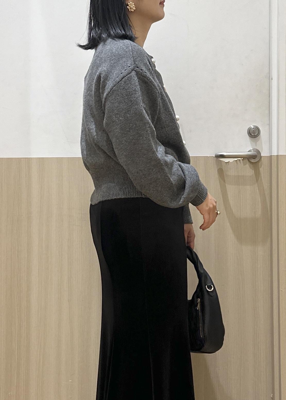 VISハートアソートパール釦ラメミックスカーディガン/イージーケア・一部WEB限定カラーチャコール / F¥5,489レビュー157センチ、骨格ウェーブでヒップに少しかかる丈感、袖は甲が隠れる丈でした!