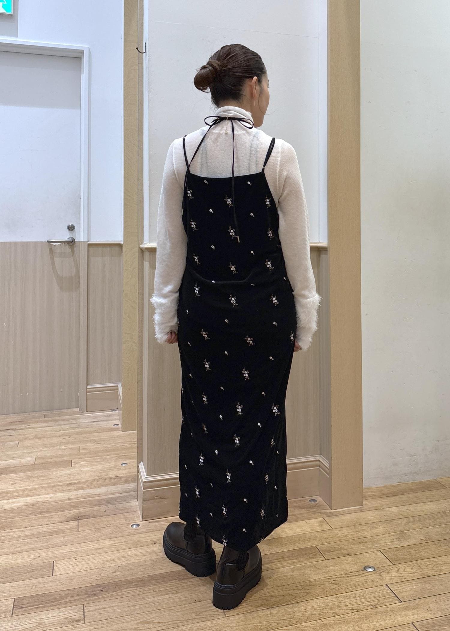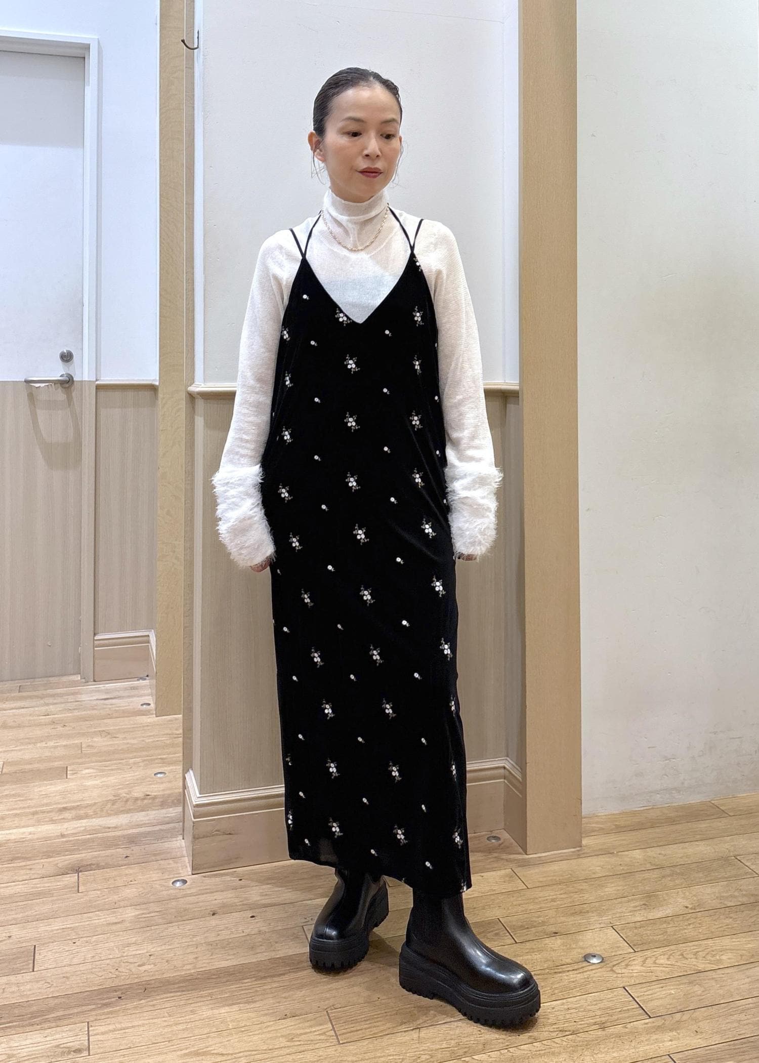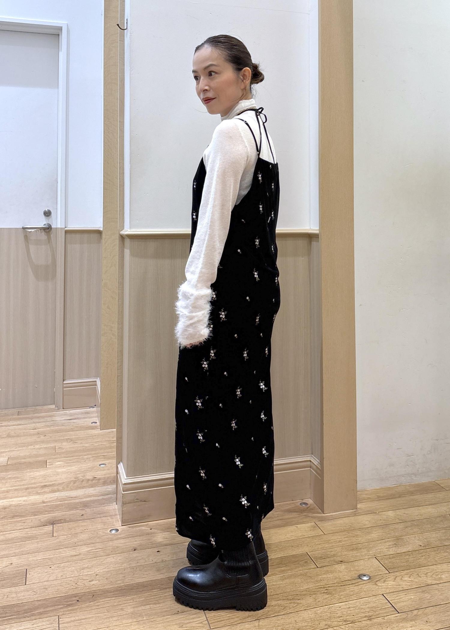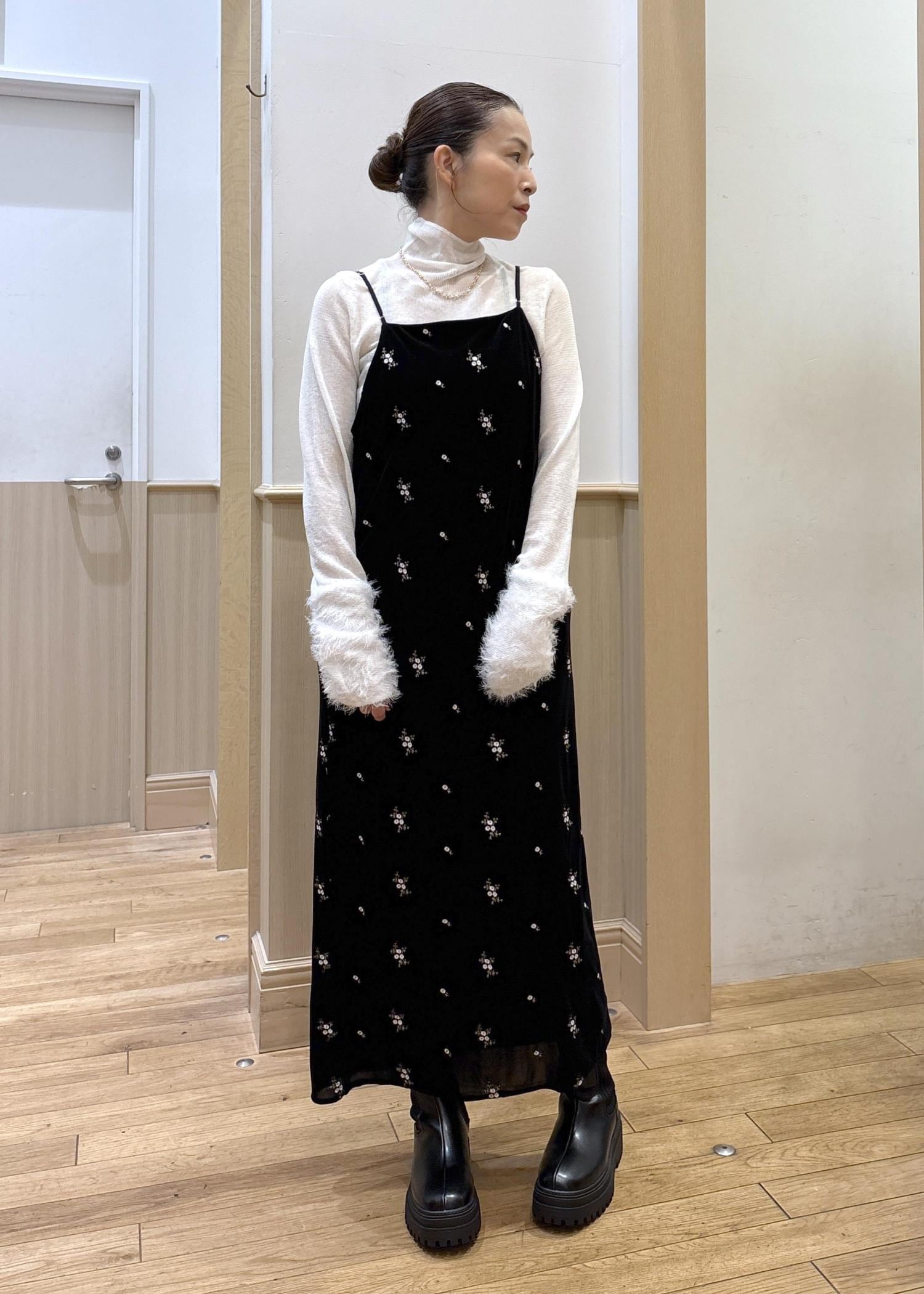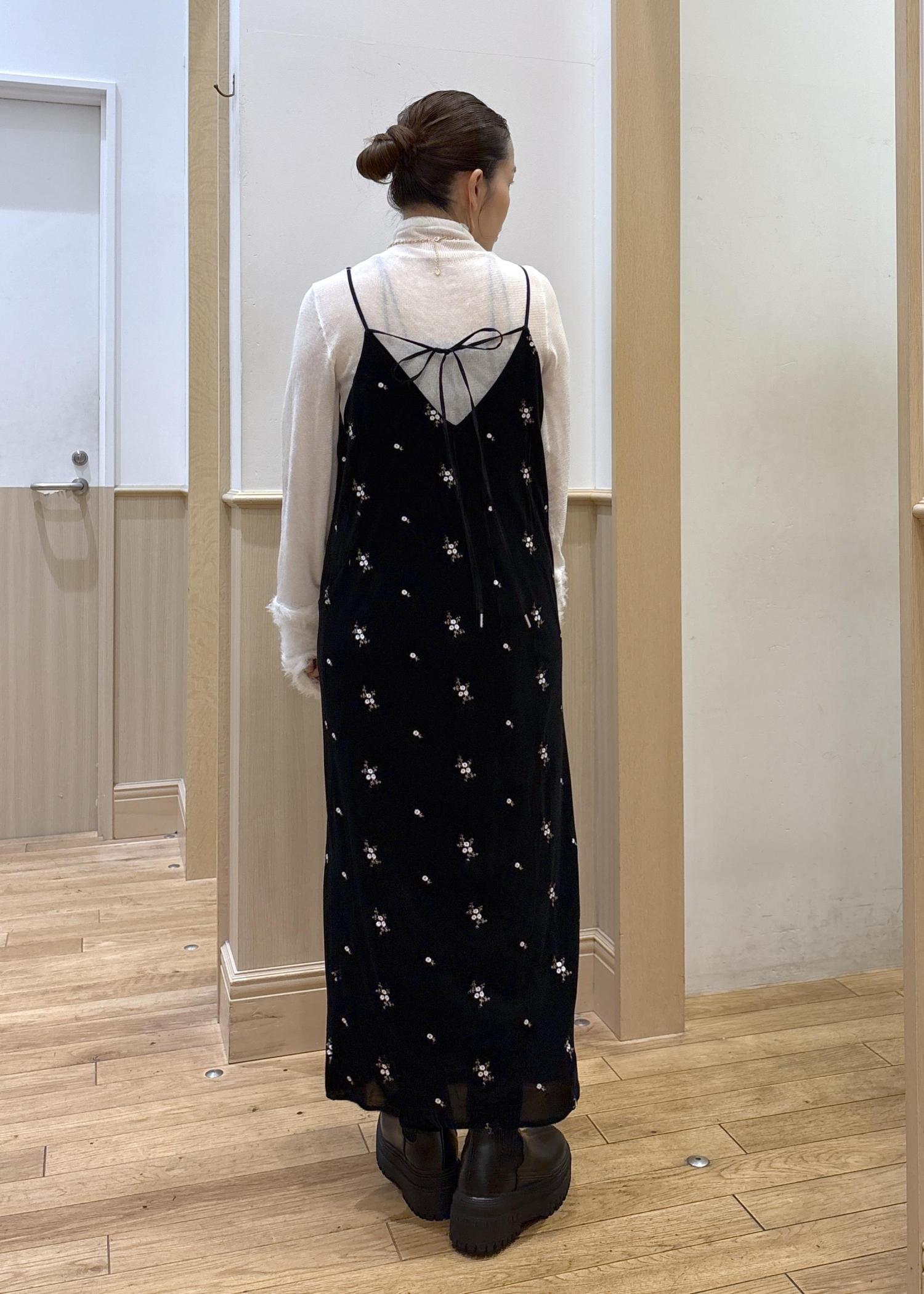 VIS刺繍アソートベロアキャミワンピース/2WAYブラック系 / F¥8,899レビュー153cmでアジャスターで長さを調整してくるぶし丈上くらいの丈感です。