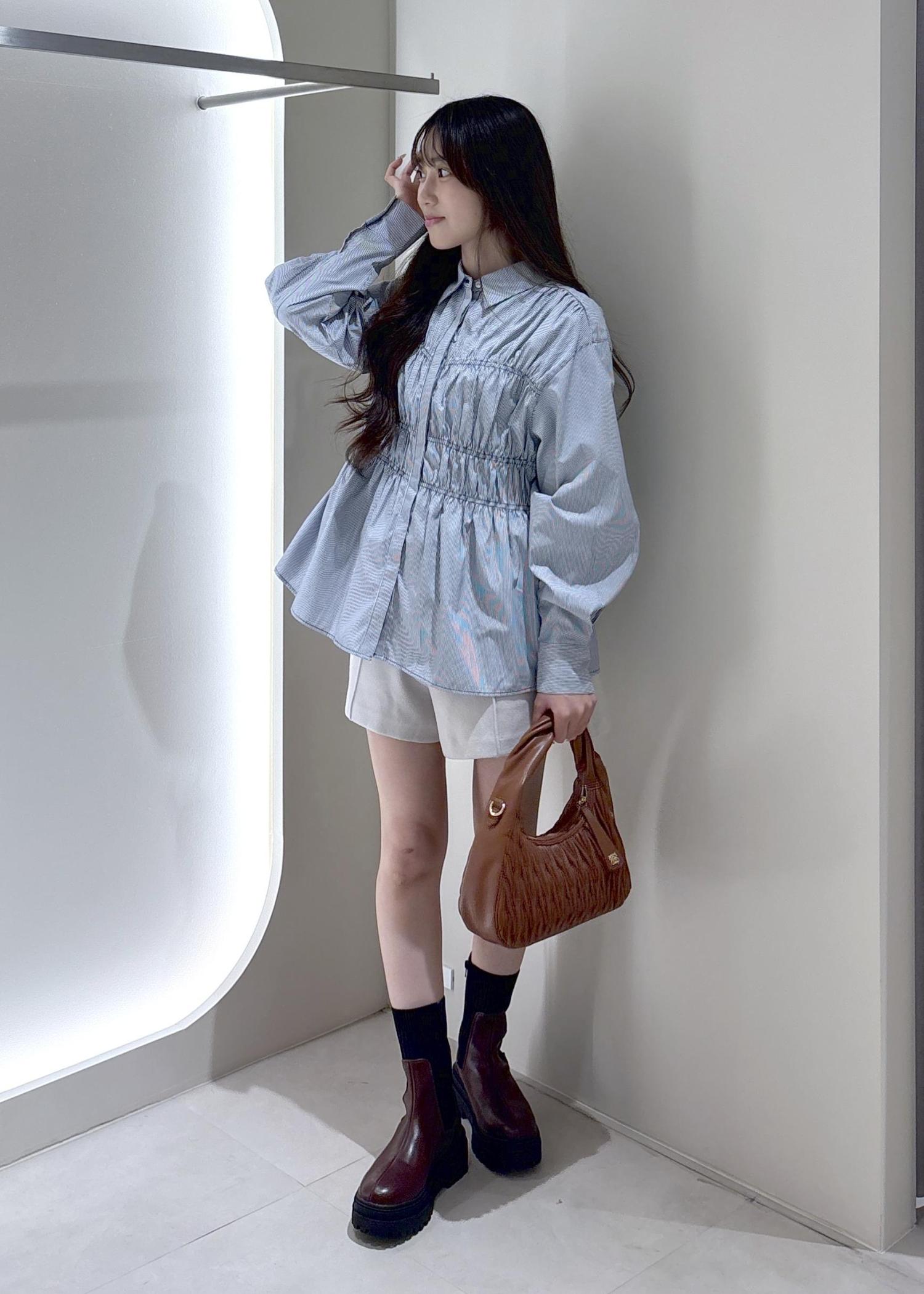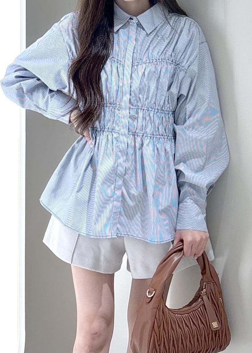 VISシャーリングデザインシャツネイビー系 / F¥5,489レビュー身長155cmでお尻が隠れるくらいの丈感です。