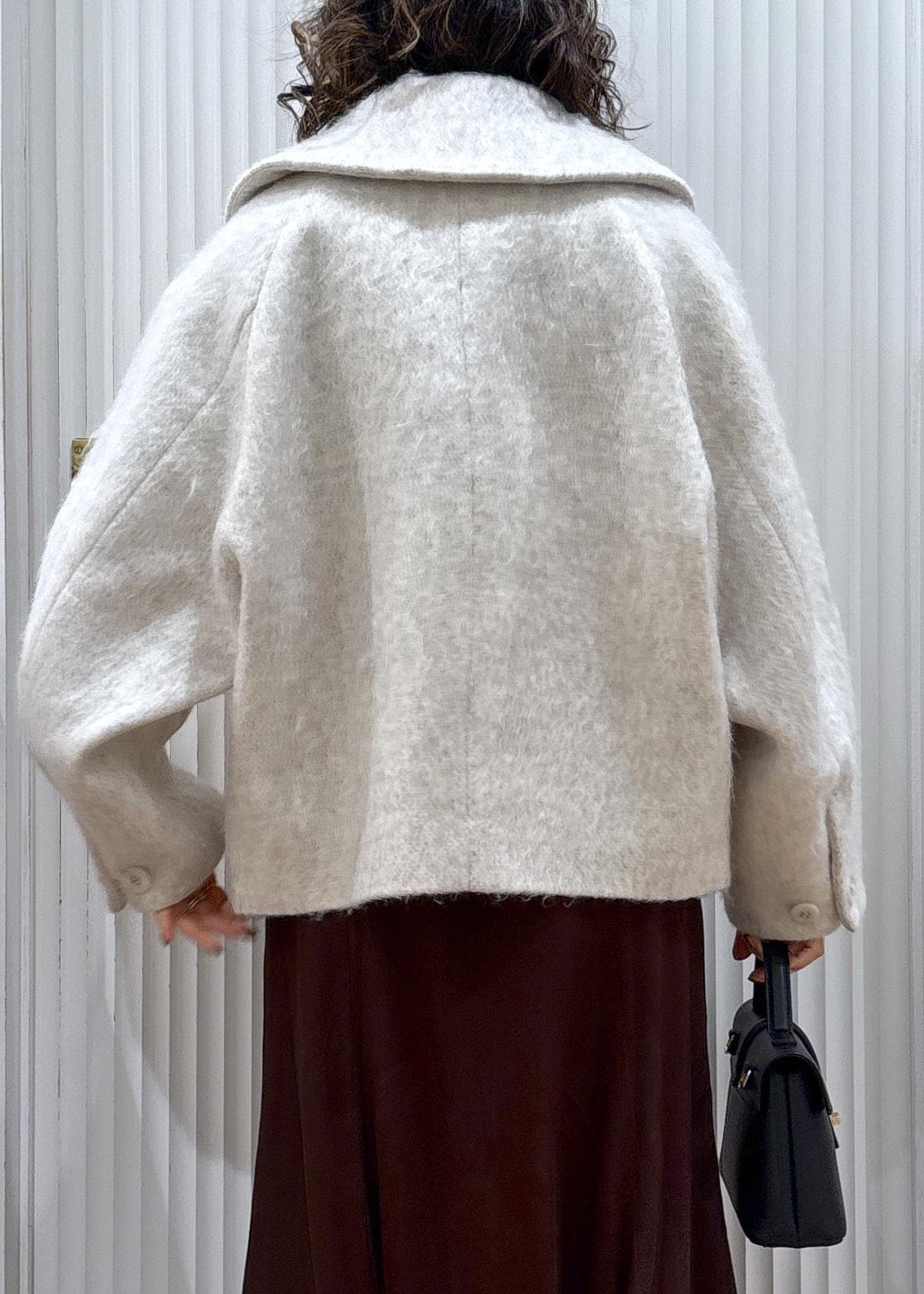 ウール混で軽く温かいショートコートです。ラグランのデザインで肩周りがゆったりしており、中に沢山着こんでも着膨れ知らず。Mサイズを着用しています。お尻にかかる程度の着丈で全体的に安心感のあるサイズ感で、見た目も重たい印象にならず、秋口から冬まで長く着用出来ます。