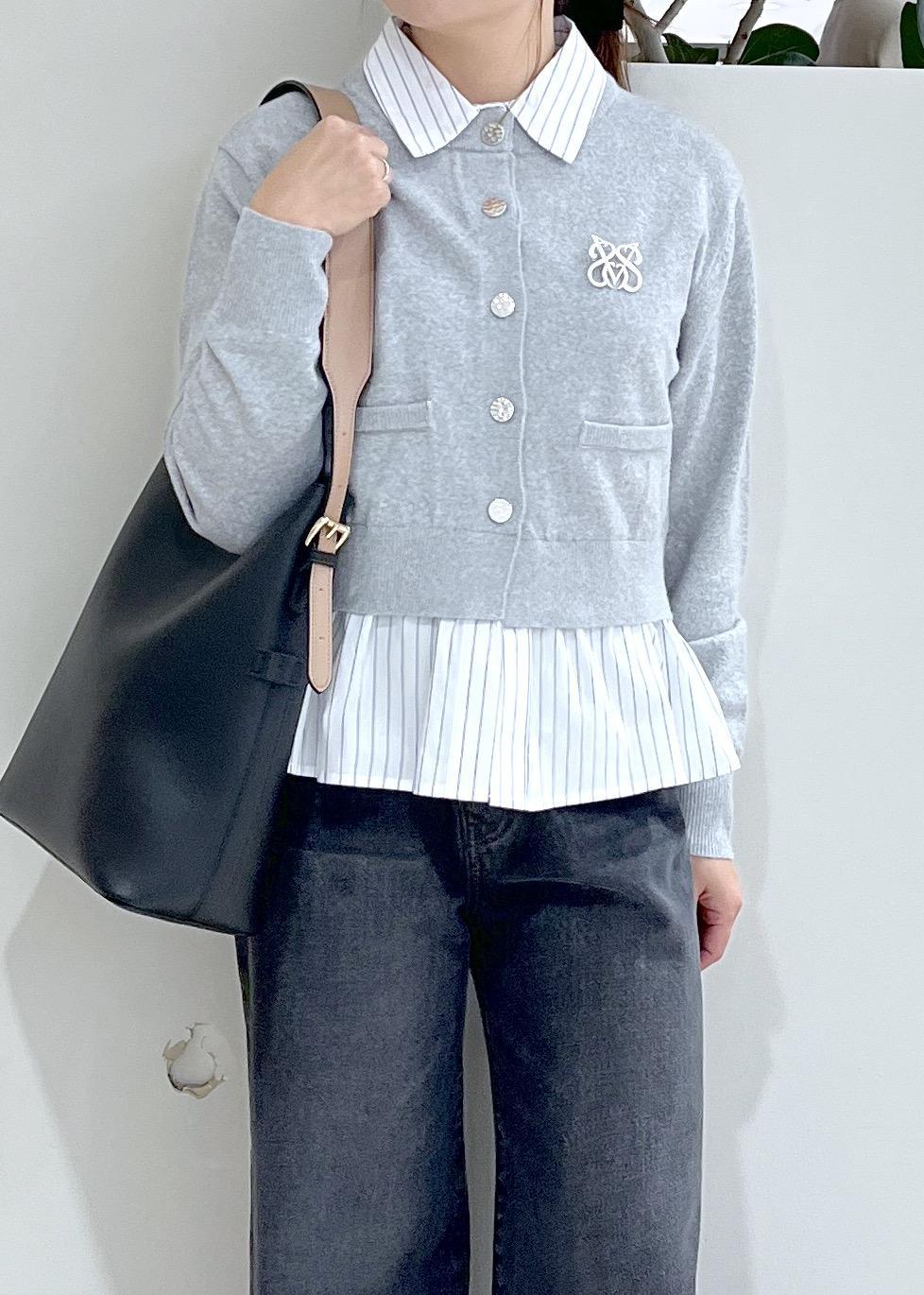VISシャツレイヤード風メタルボタンカーディガンライトグレー / F¥6,589レビューレイヤードされているニットトップスで一枚で便利なアイテムです。メタルボタンがアクセントになり、えり付きなのできちんと見えします。