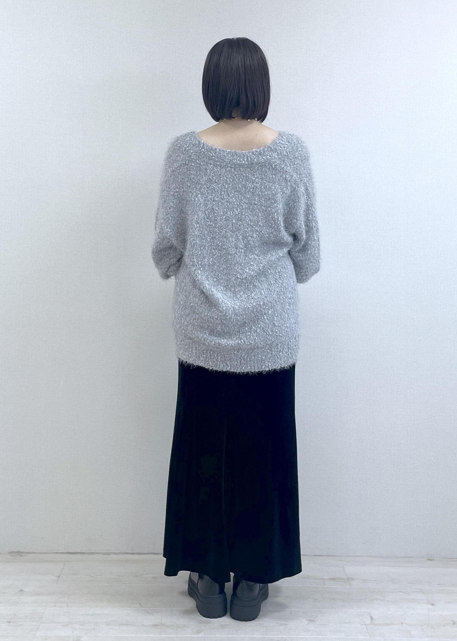 足がスラっと細く長く見え、ショート丈のボトムとも相性いいです。