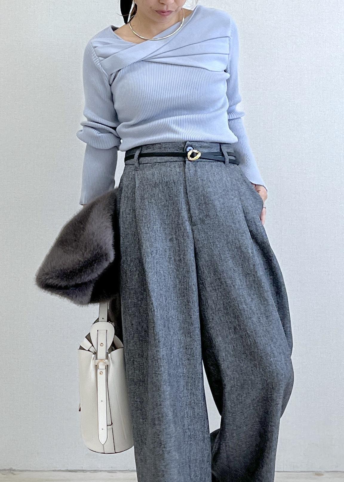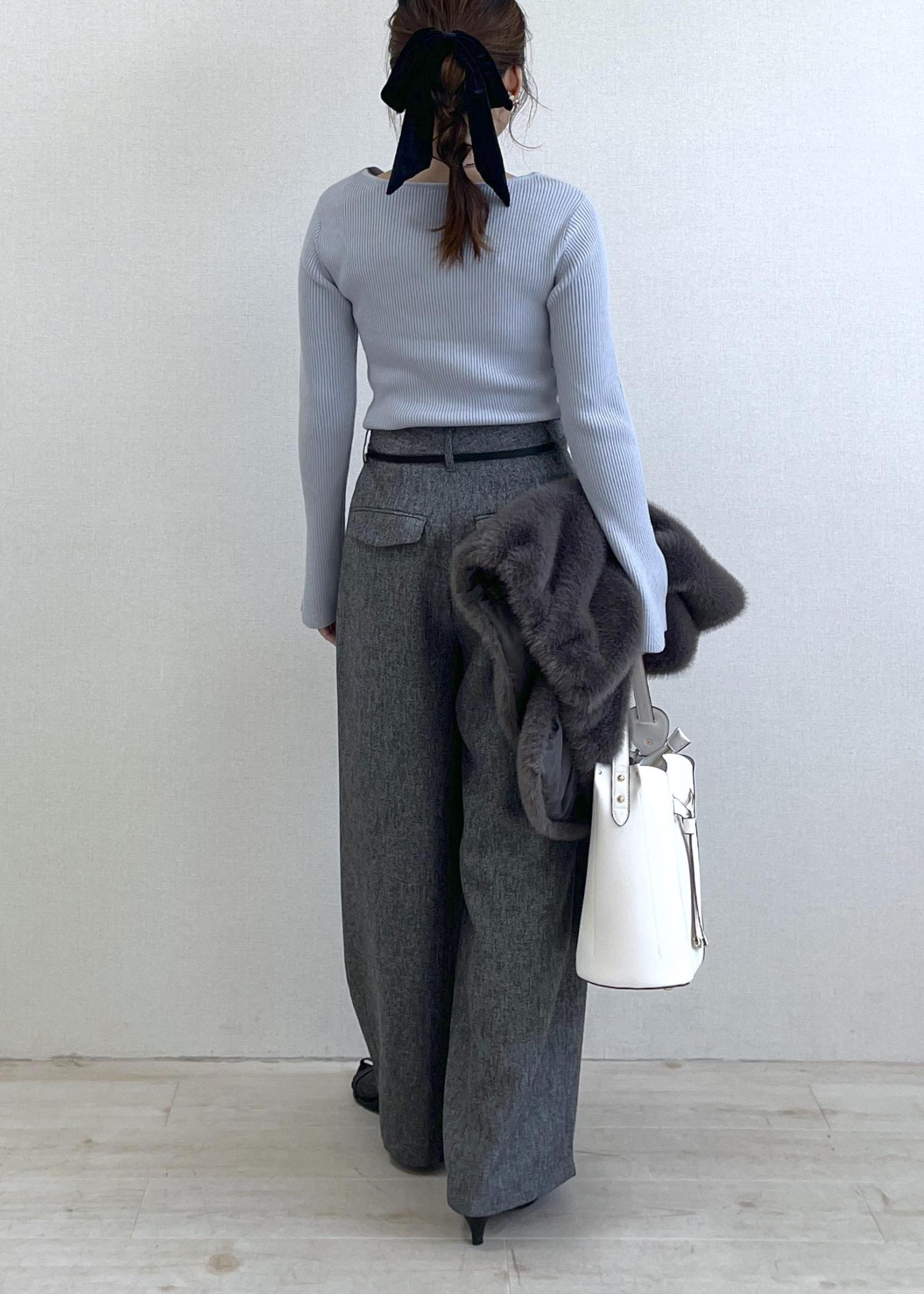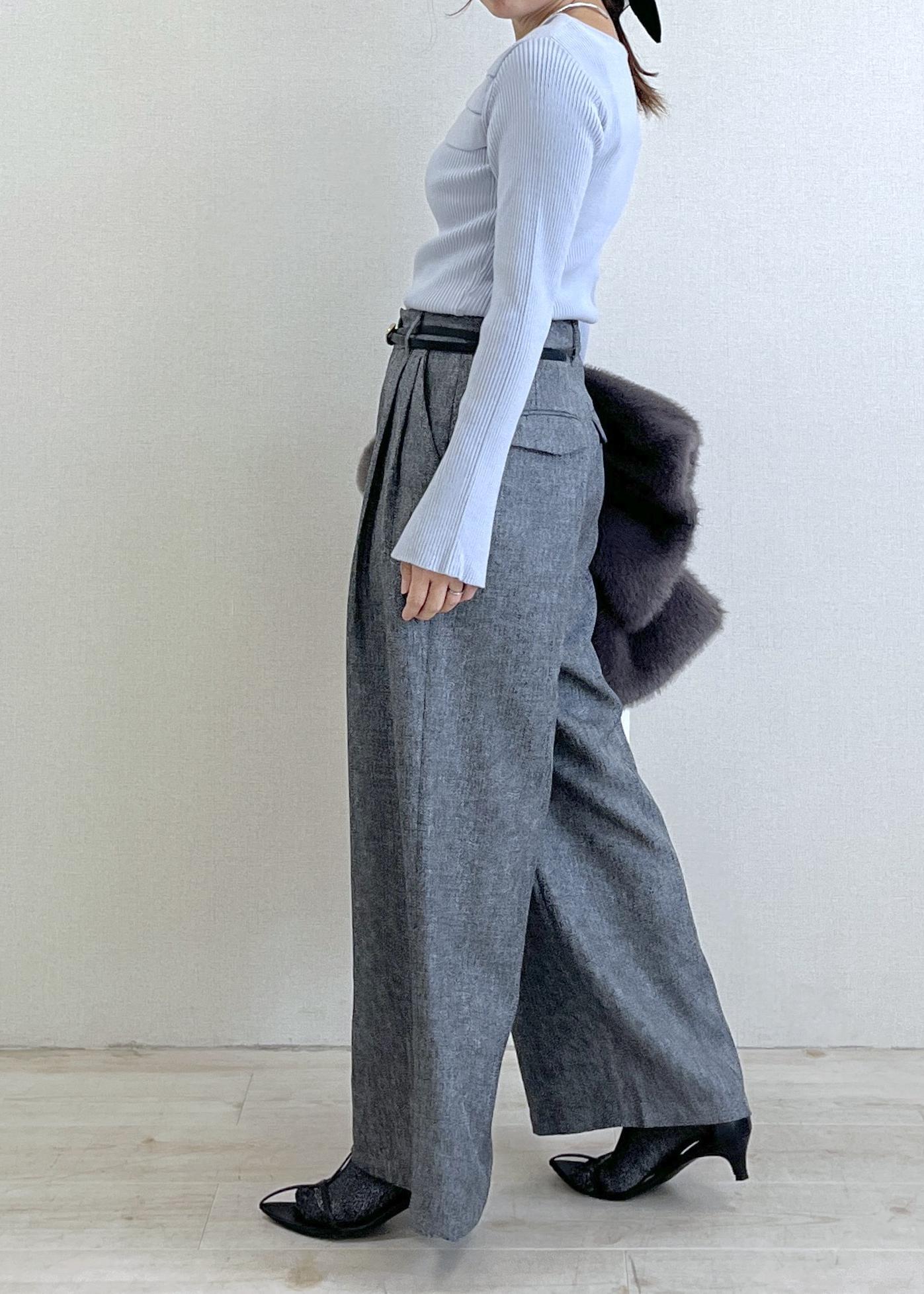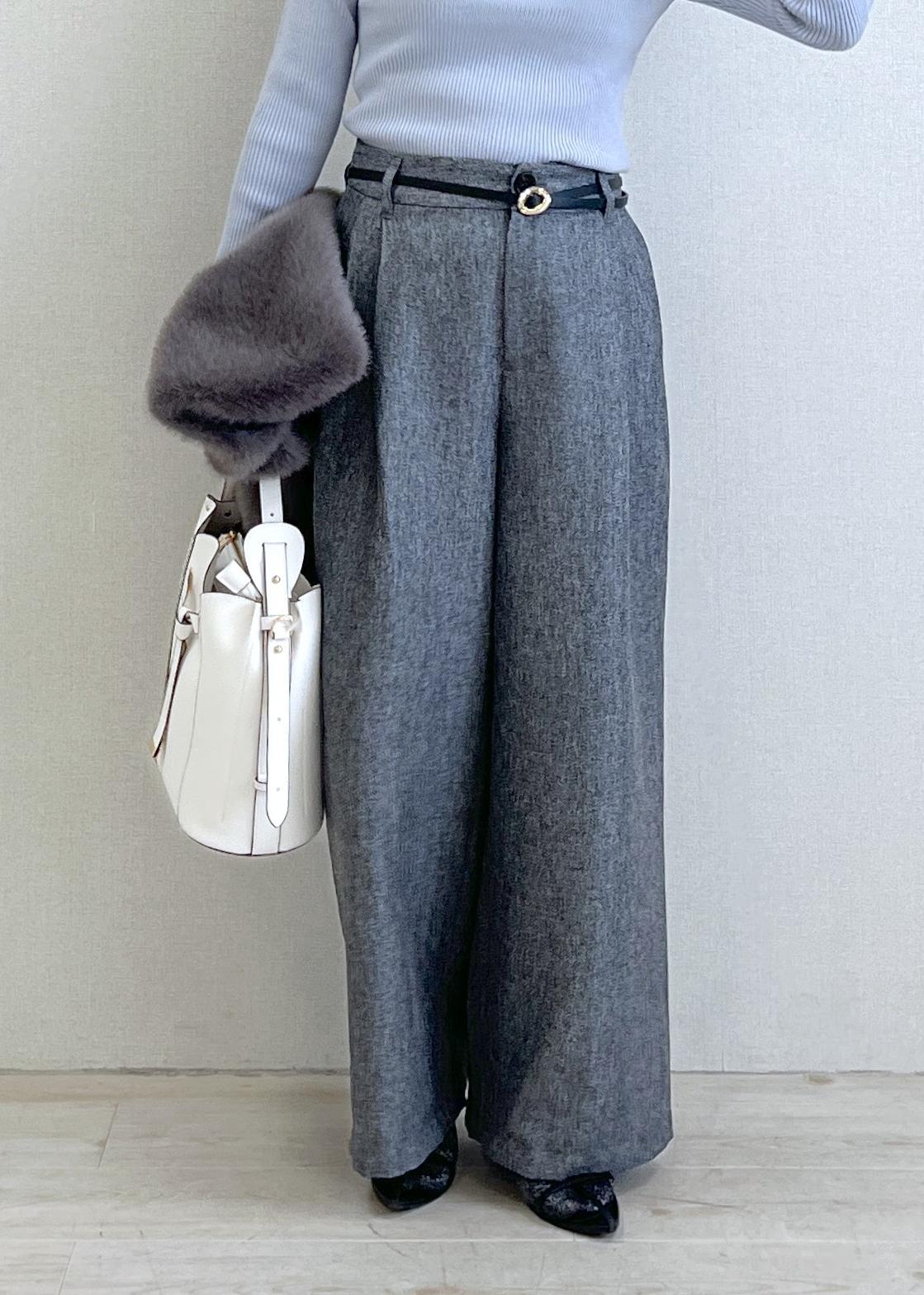 ややハイウエストなワイドパンツを合わせて、すっきり見えと脚長効果も◎