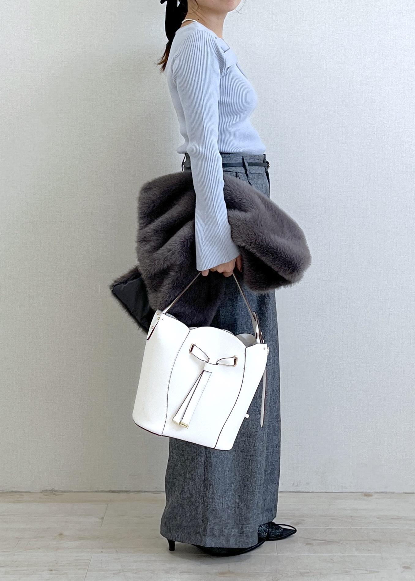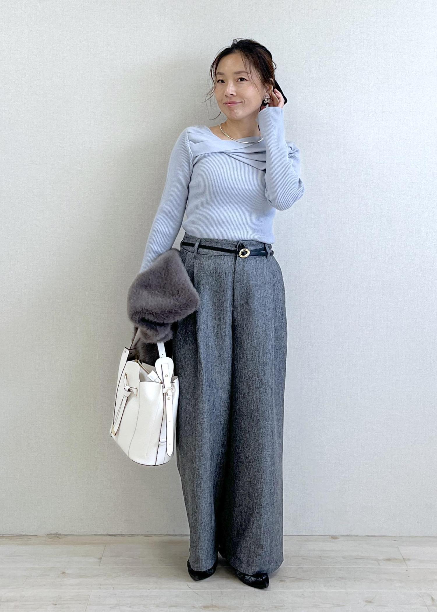 全体をグレー系でまとめつつ、白バッグで抜け感をプラスしました。