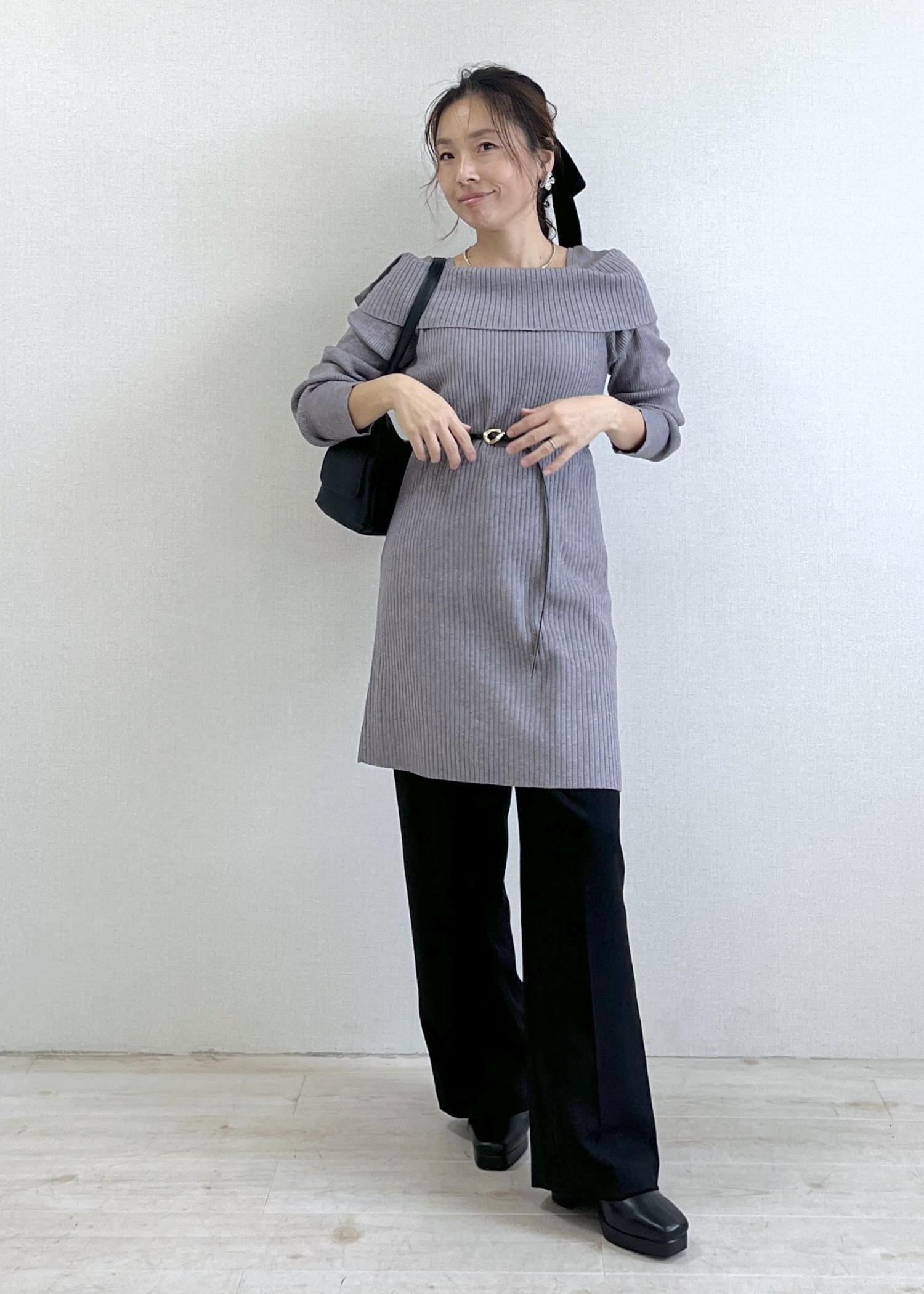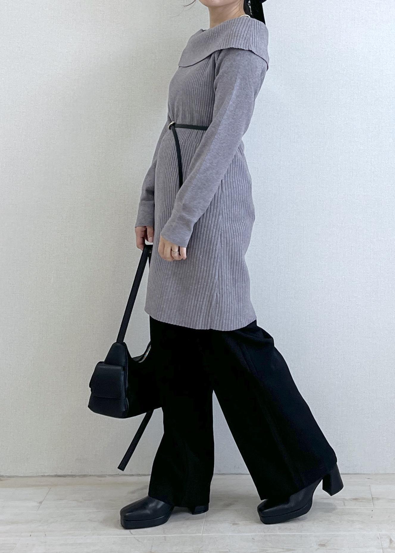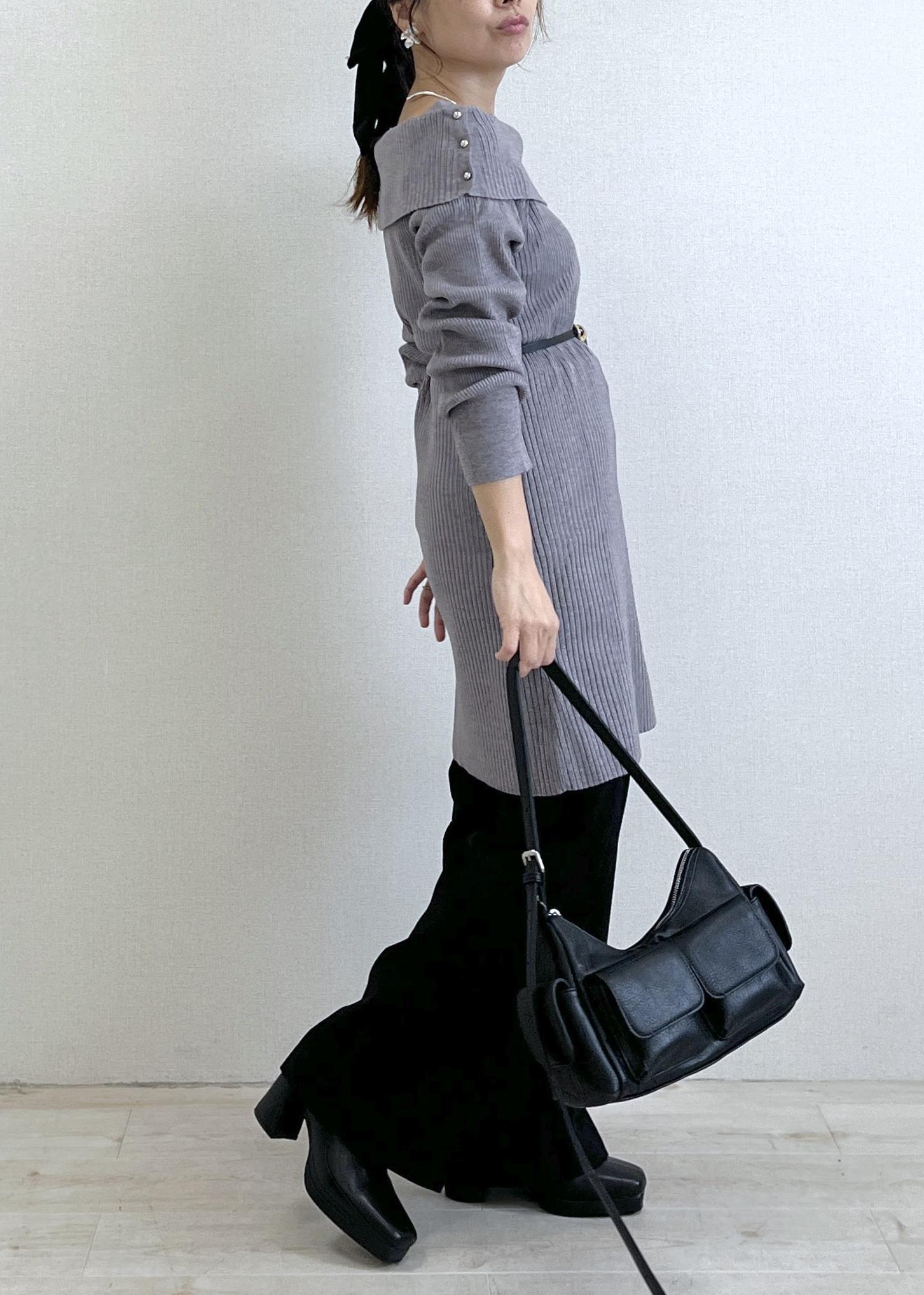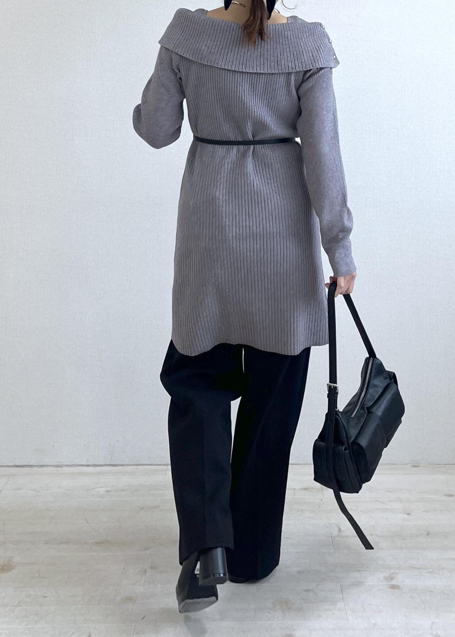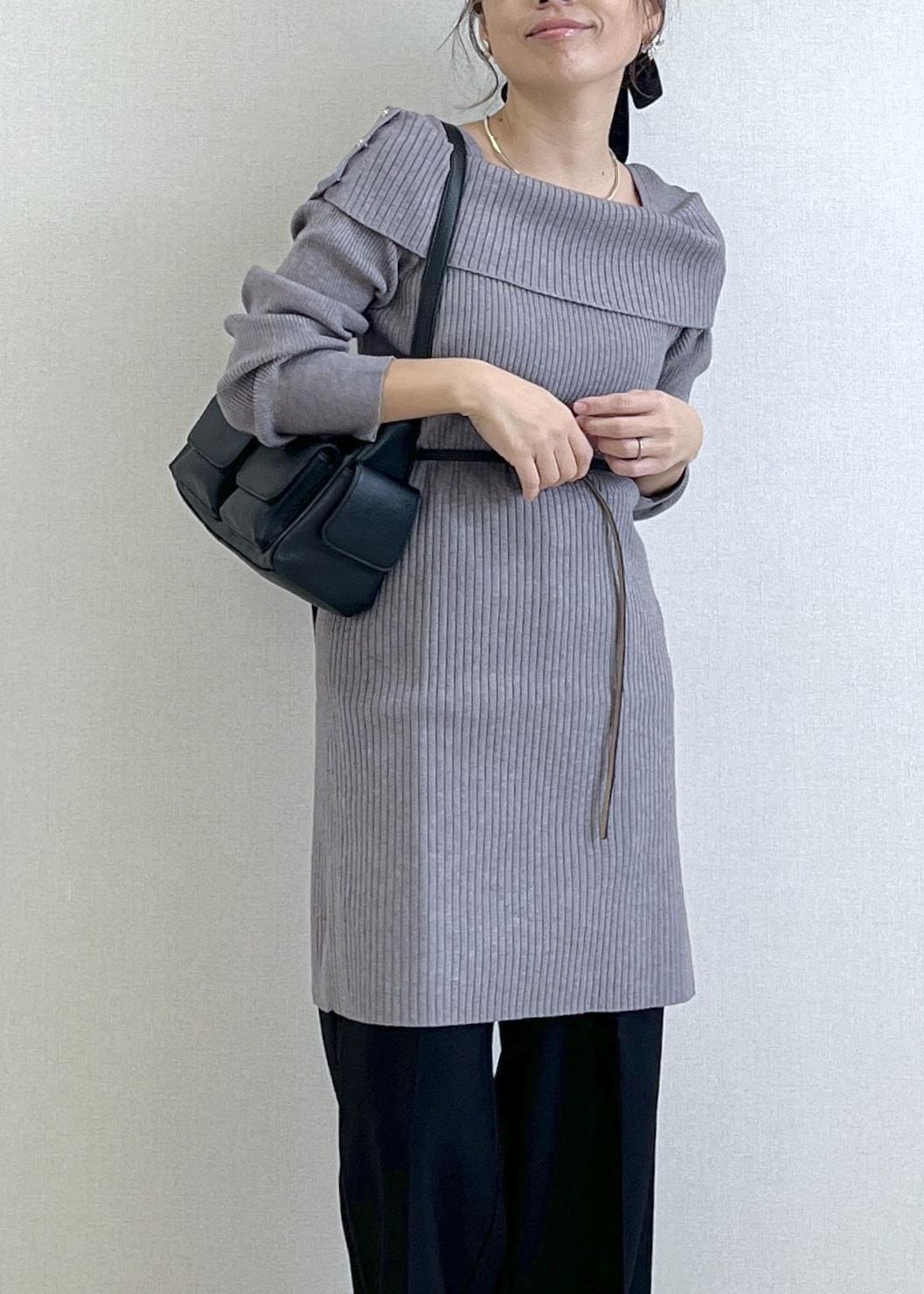 肩のボタンと広めの衿デザインで、シンプルだけど顔まわりに華やかさが出るニットワンピ。