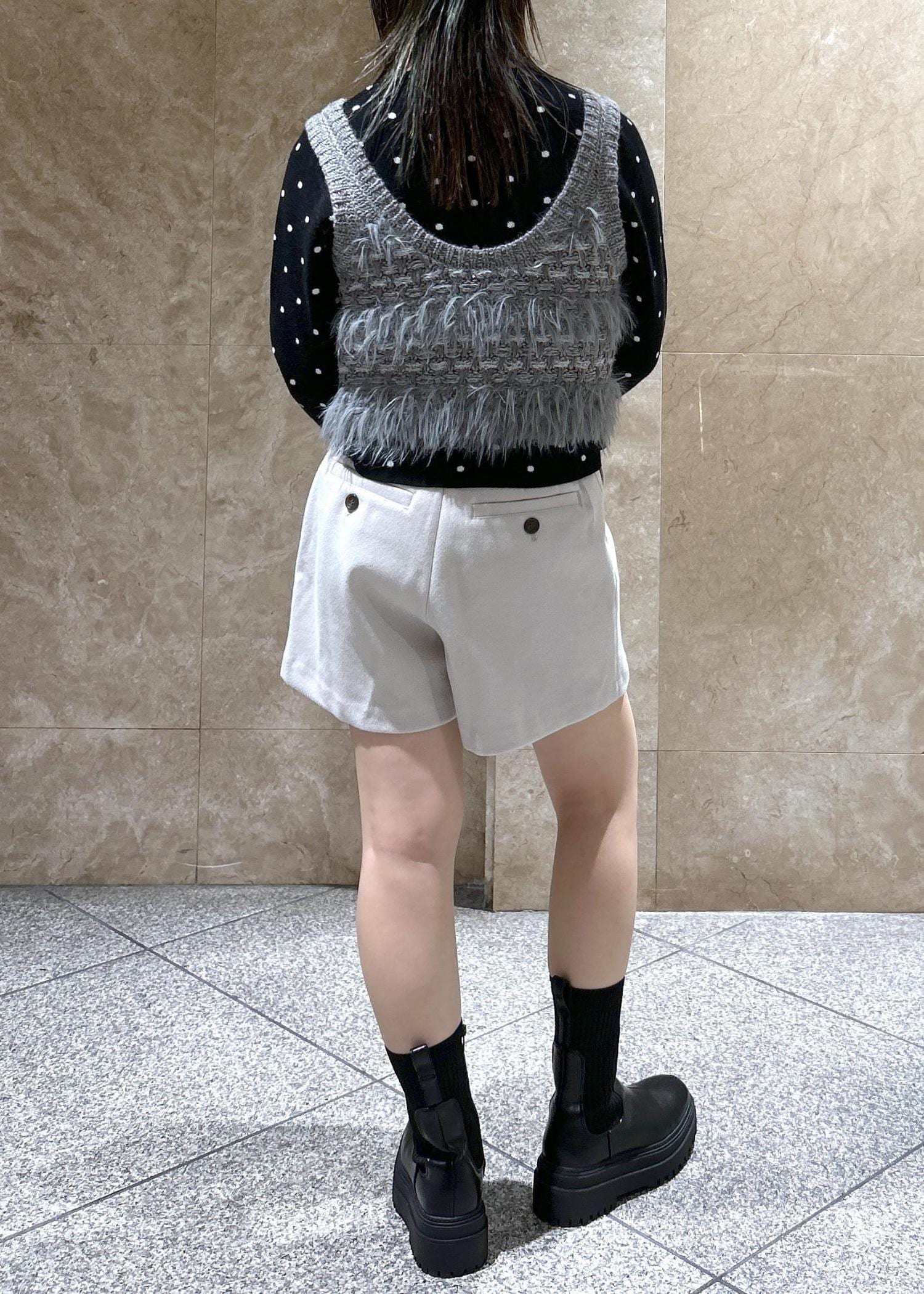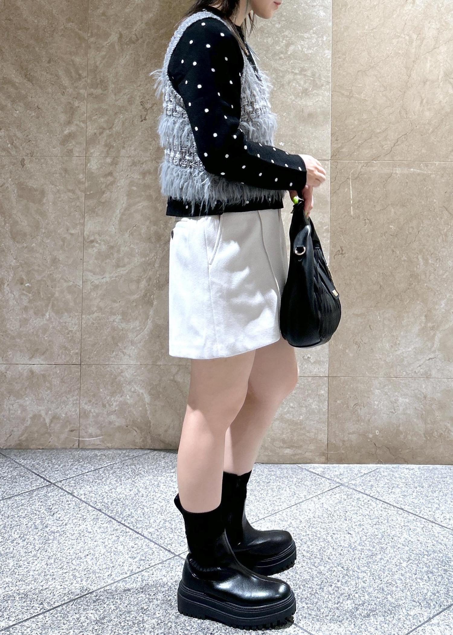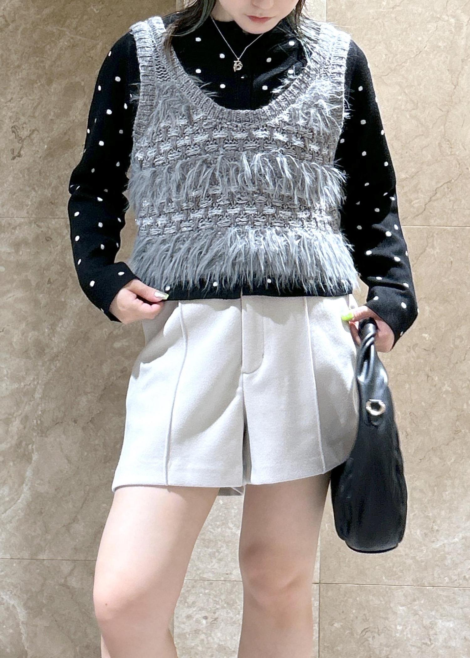 ドット柄カーディガンとニットビスチェをレイヤードして、ショートパンツと合わせたモノトーンコーデです!