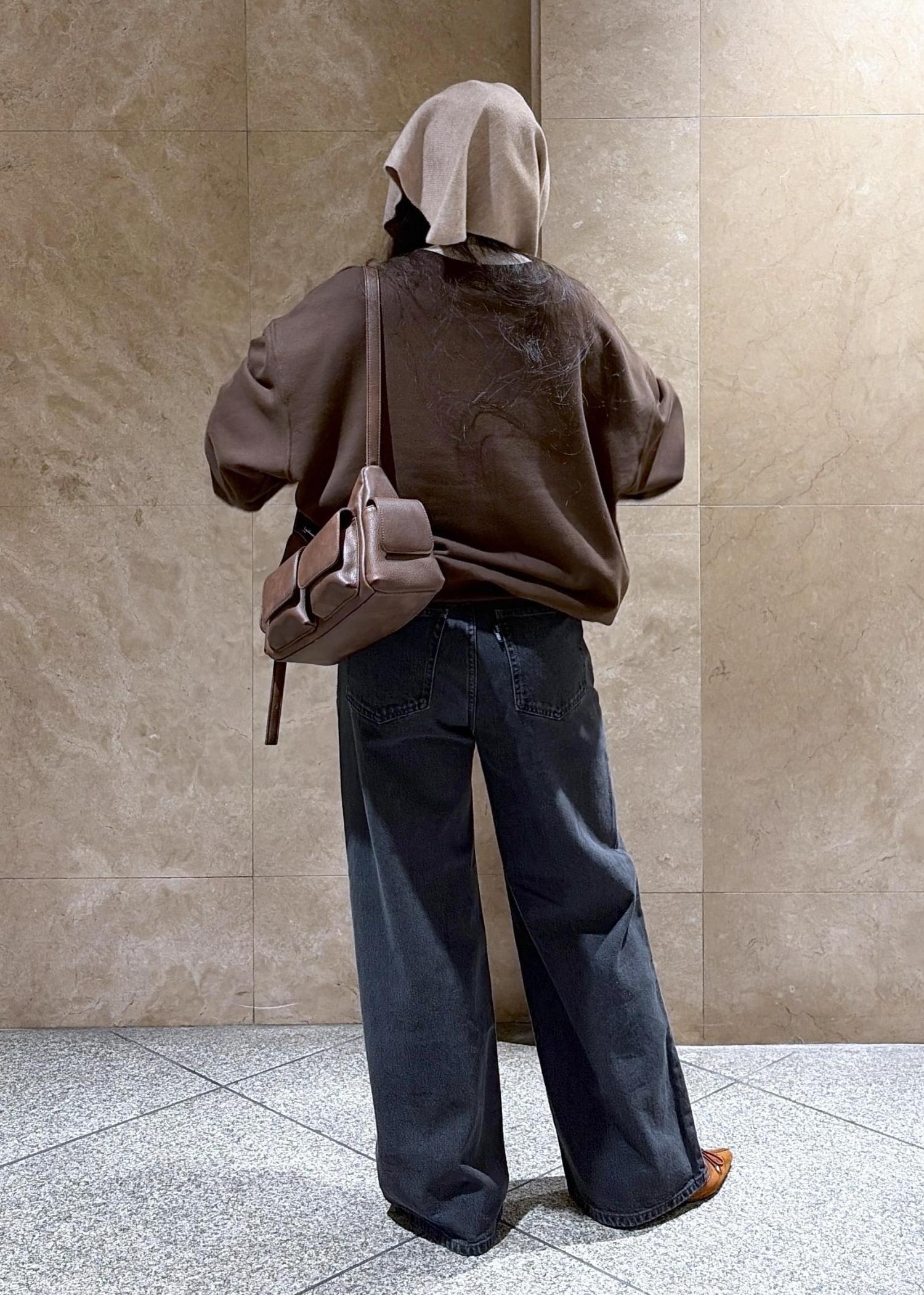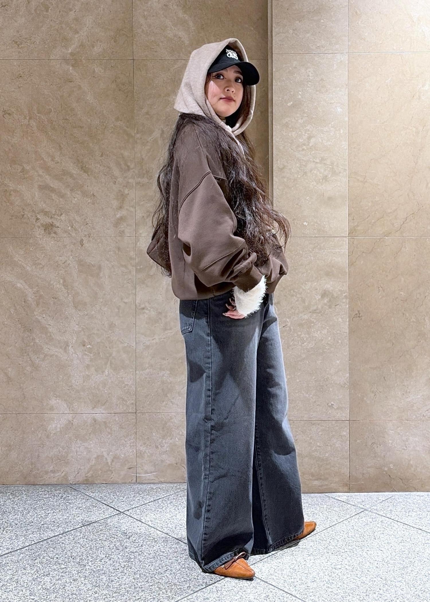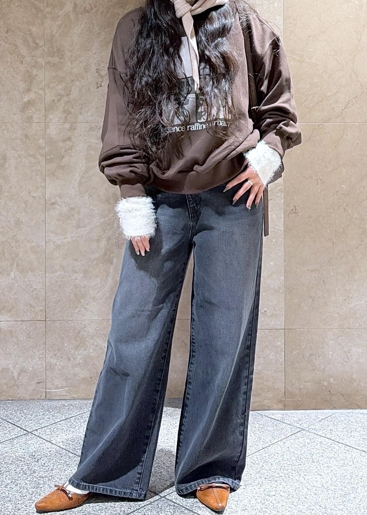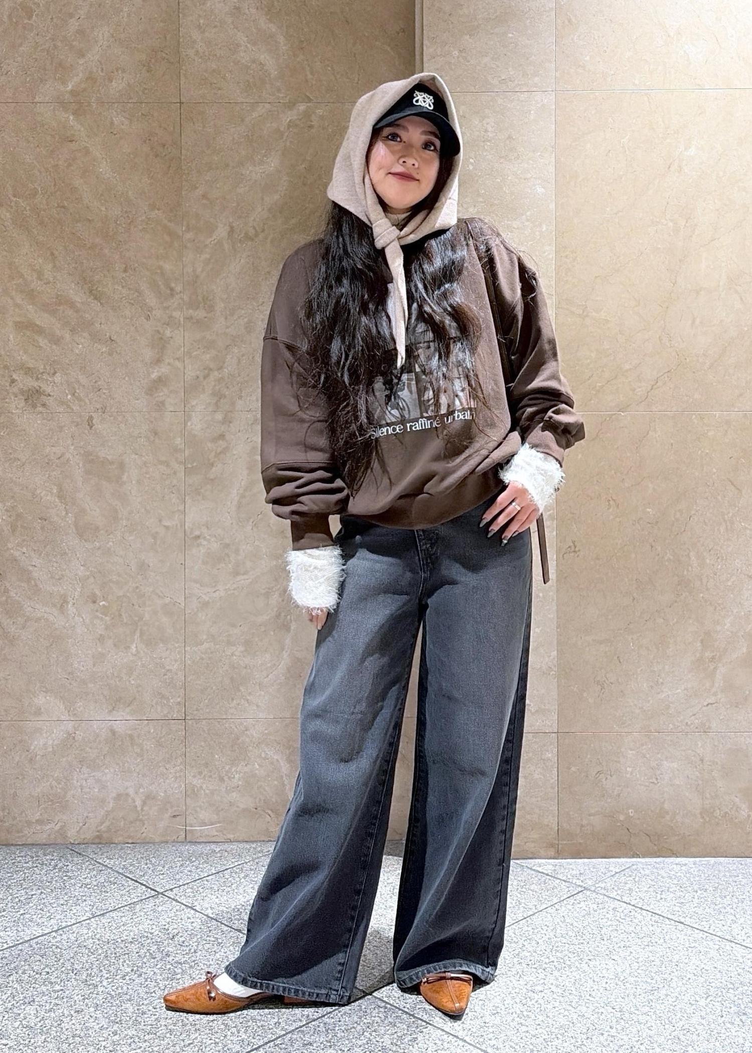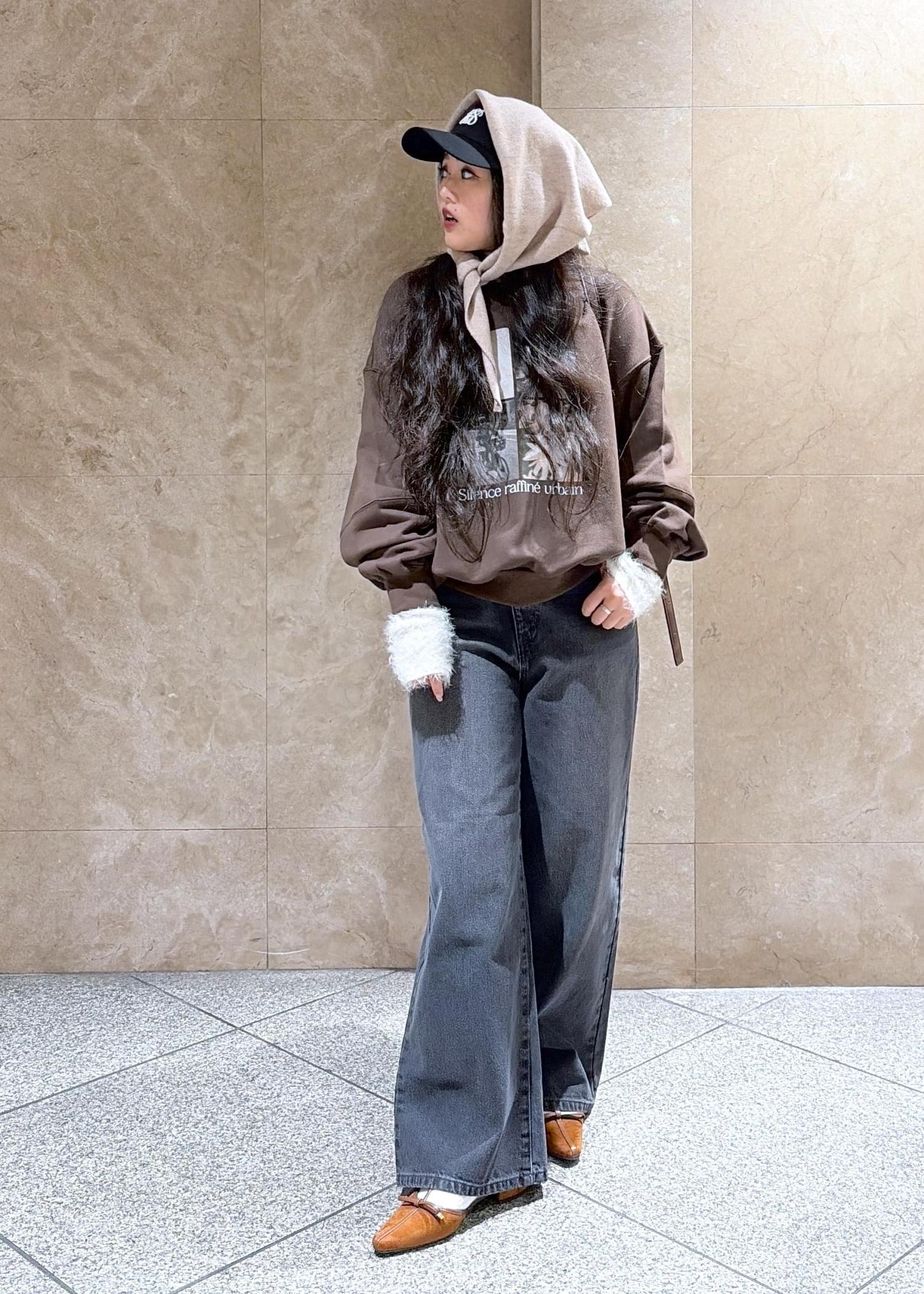 身長が低めなので155cmMサイズであまり低めのサンダルなどを履いてしまうと引き摺ってしまいますので高めのスニーカーをオススメします◎