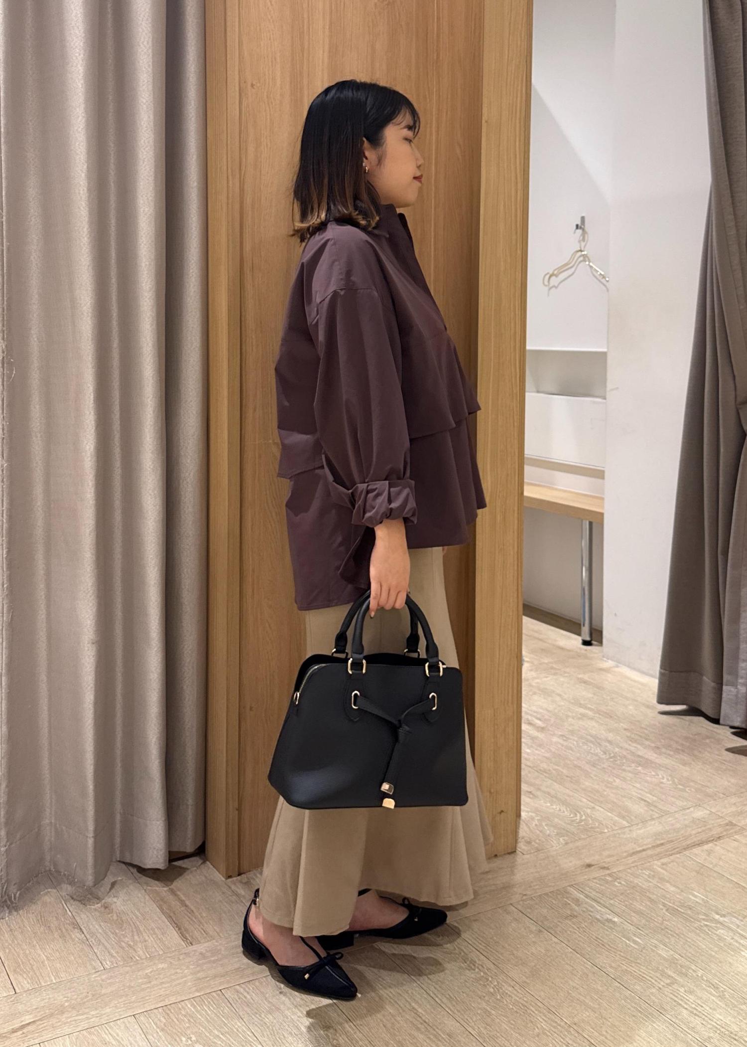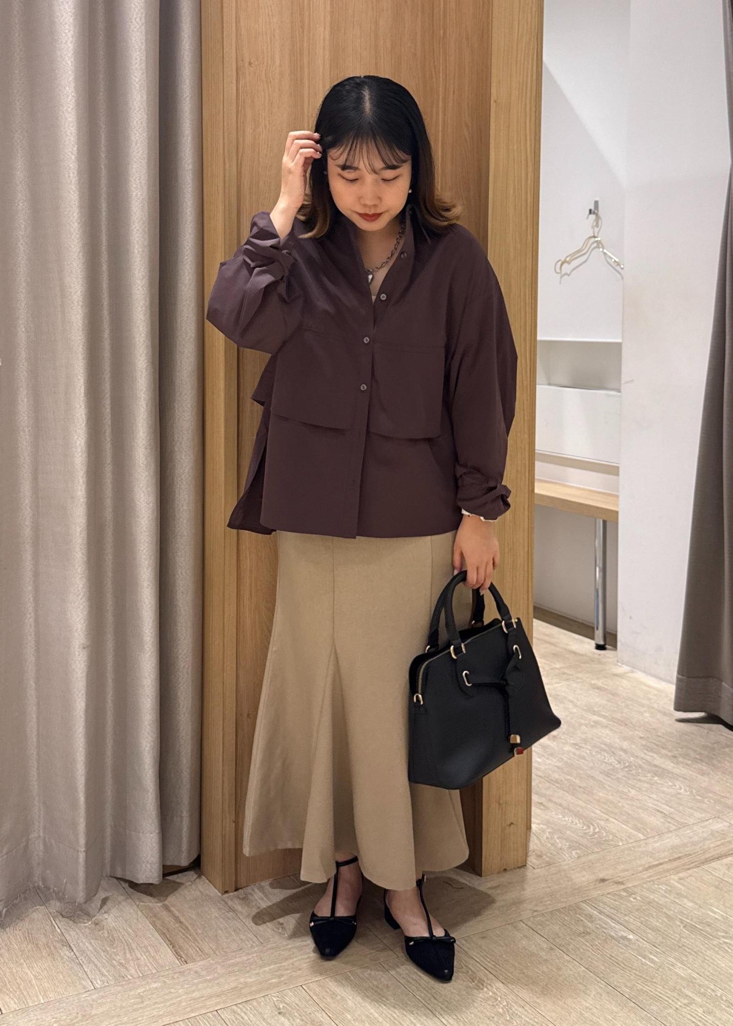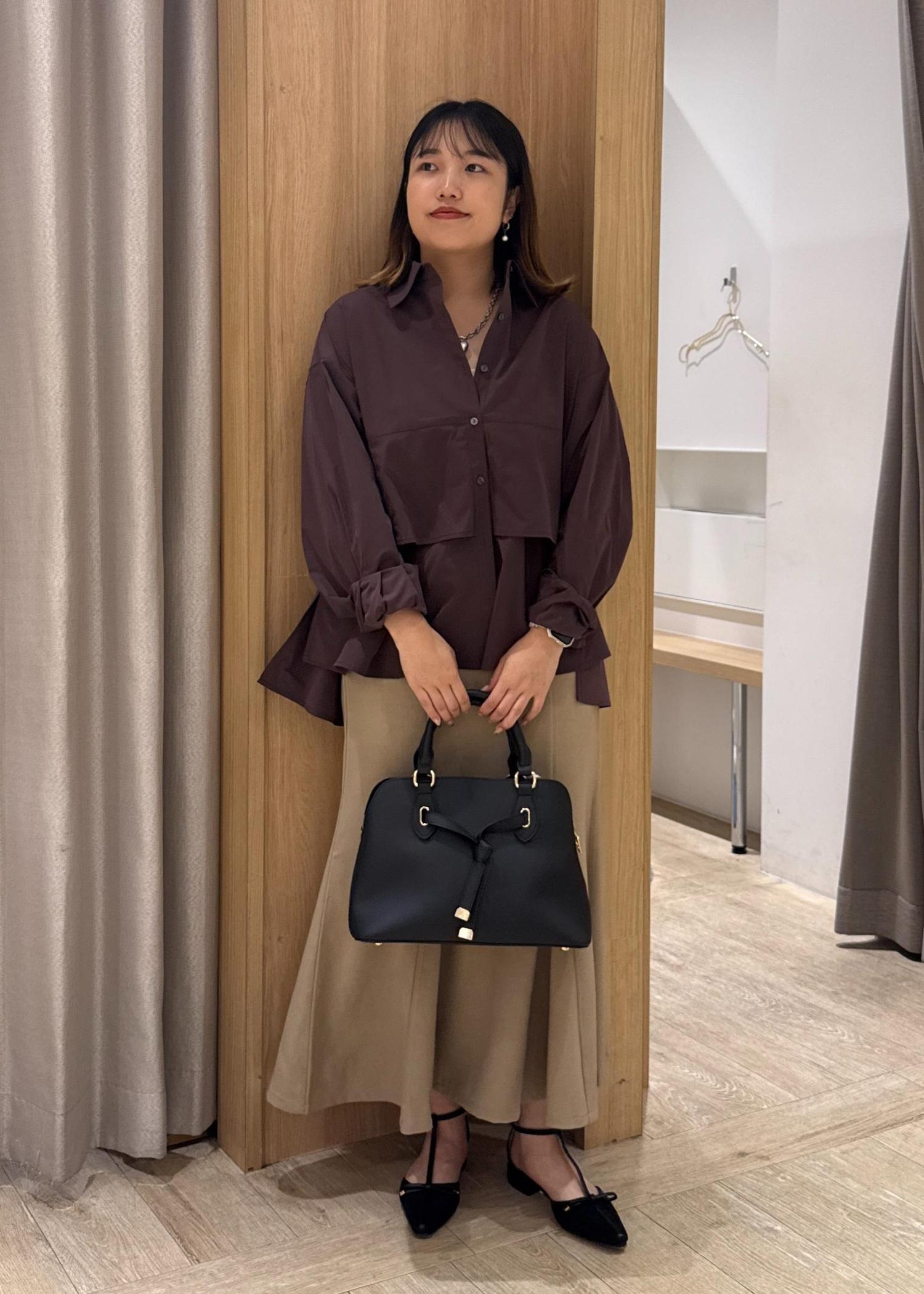 重くなりすぎないよう、少し明るめのベージュのスカートを合わせました◎