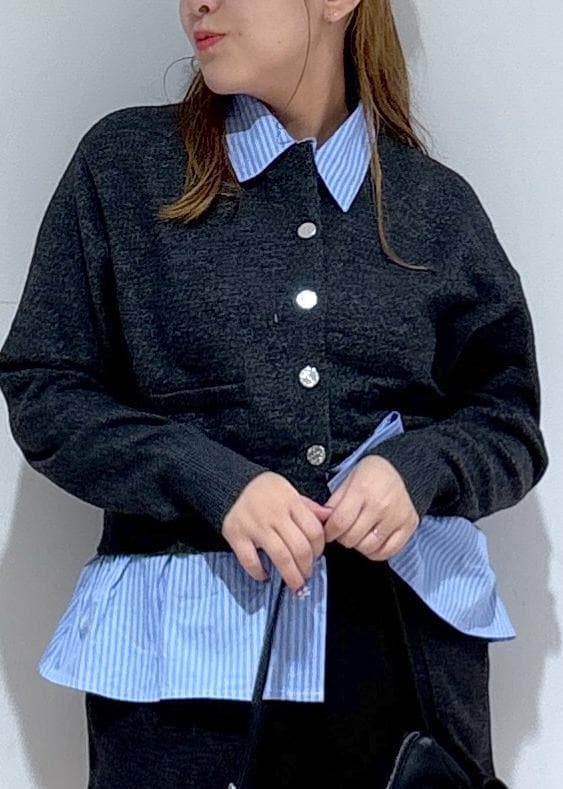 VISシャツレイヤード風メタルボタンカーディガンチャコール / F¥6,589レビューニットにシャツがドッキングされたデザインで1枚で着映えします◎