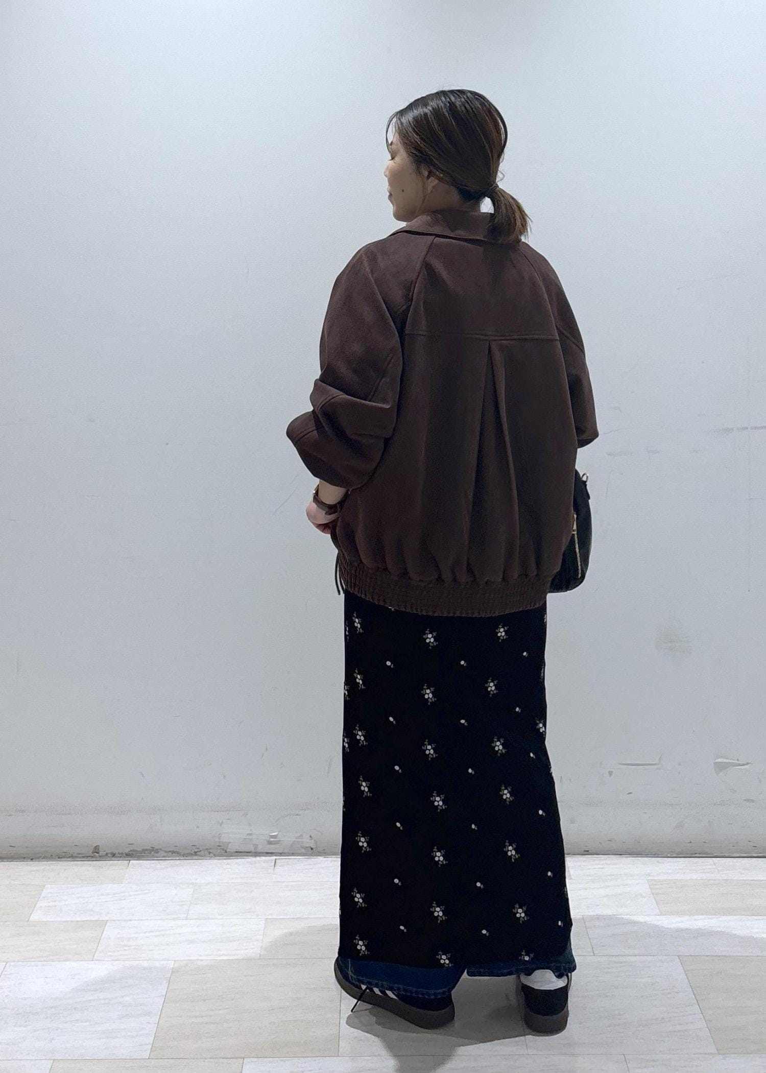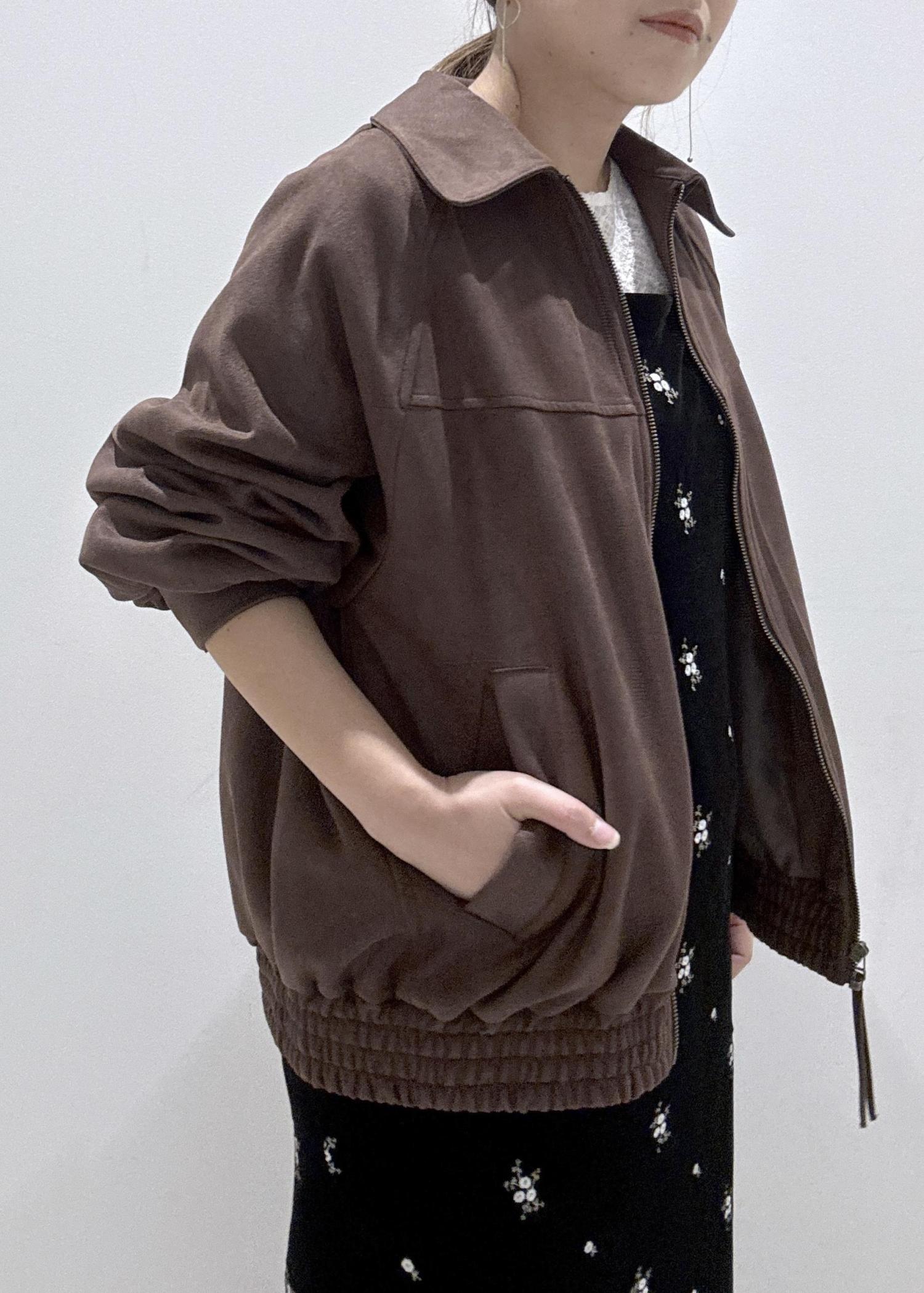 ダークブラウンは、柔らかなスエード調の生地感で羽織り心地も良いです。 -