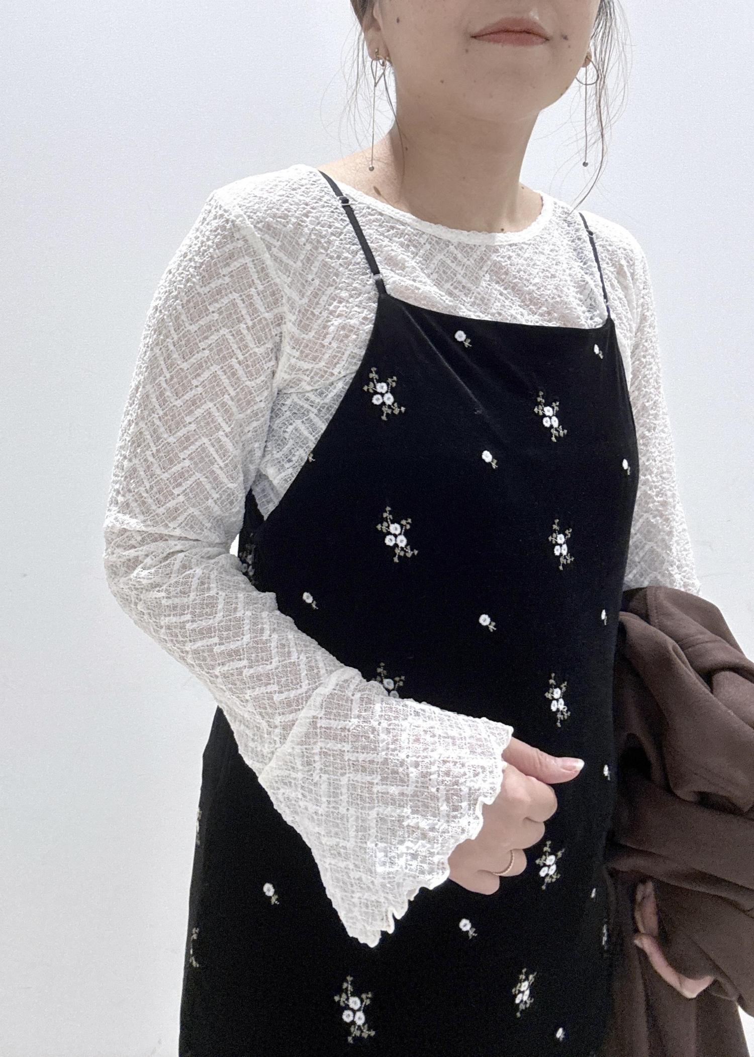 袖口がフレアシルエットでトップスとしても着用可ですが、シアーで透ける生地なので、カップ付きキャミと合わせるのがオススメです。