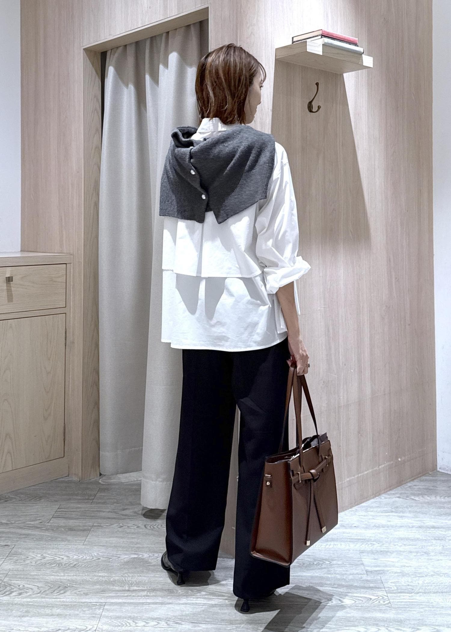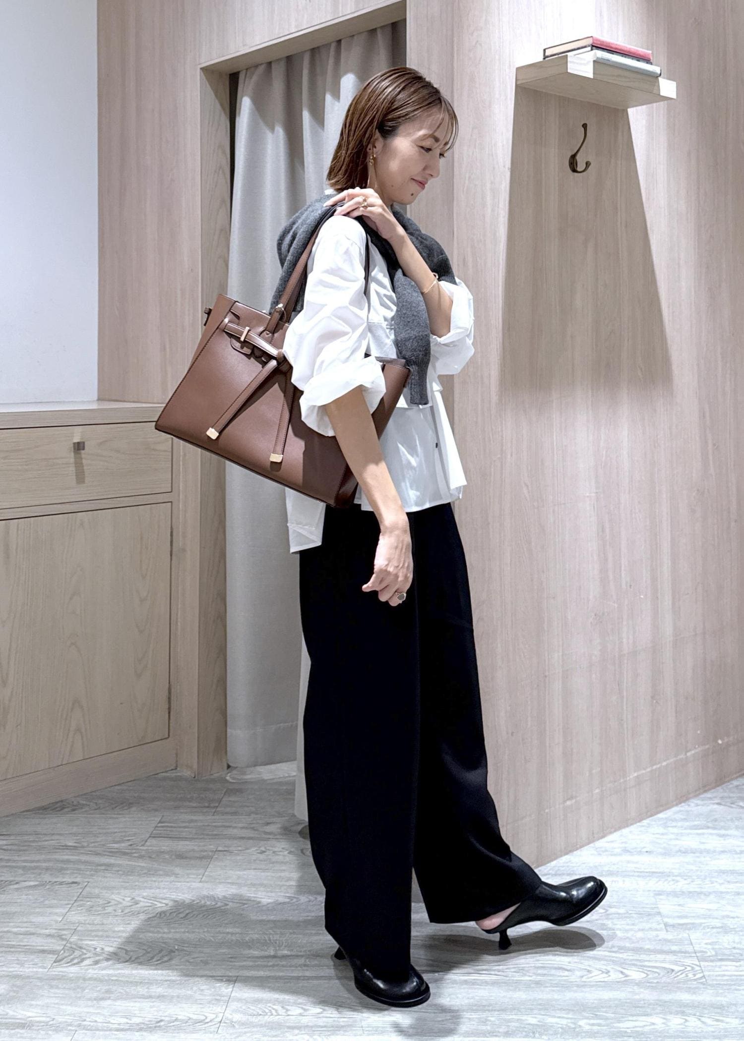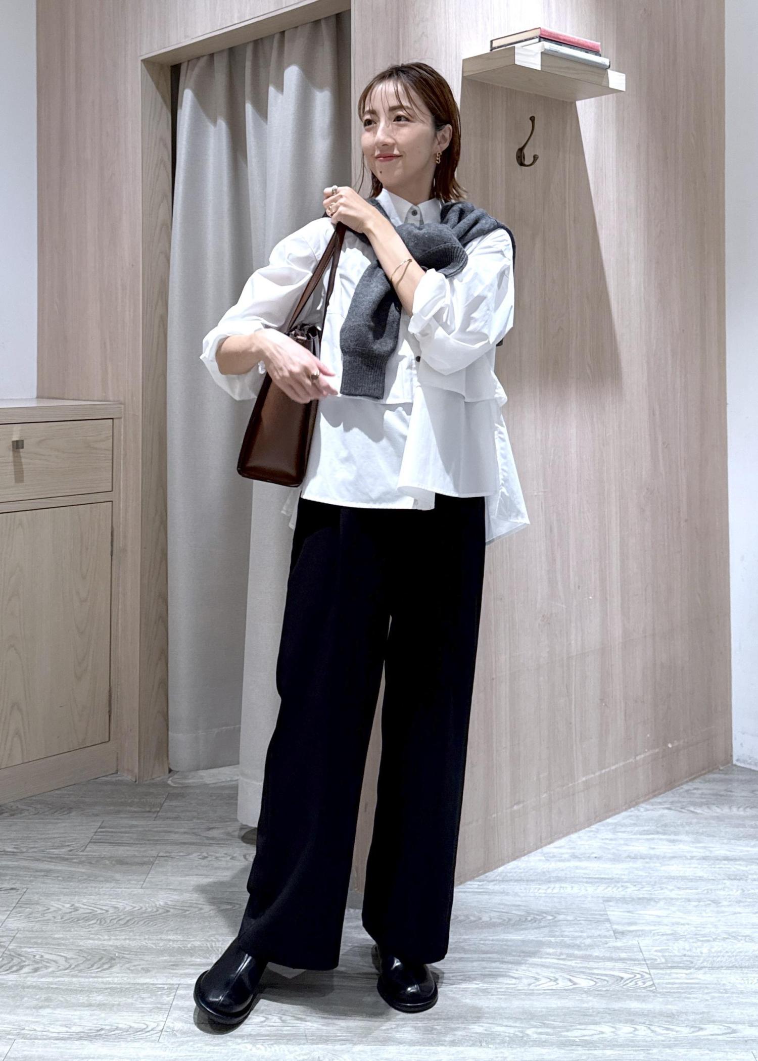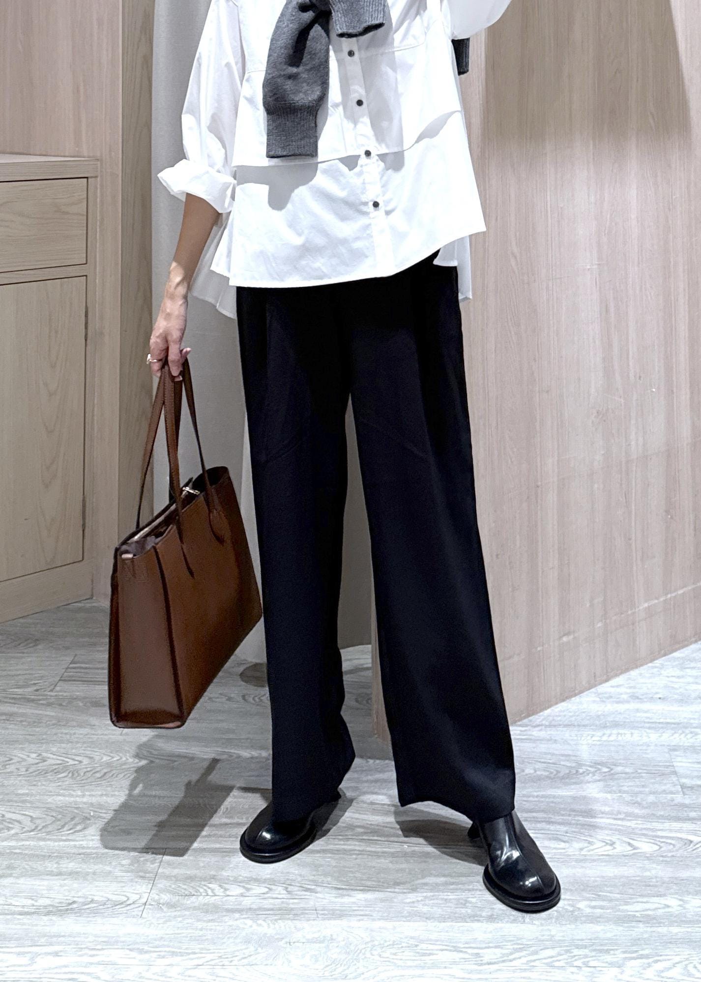 いつものモノトーンな通勤スタイルにブラウンの存在感のあるバッグを合わせて、秋らしいオフィスカジュアルスタイルにしました!