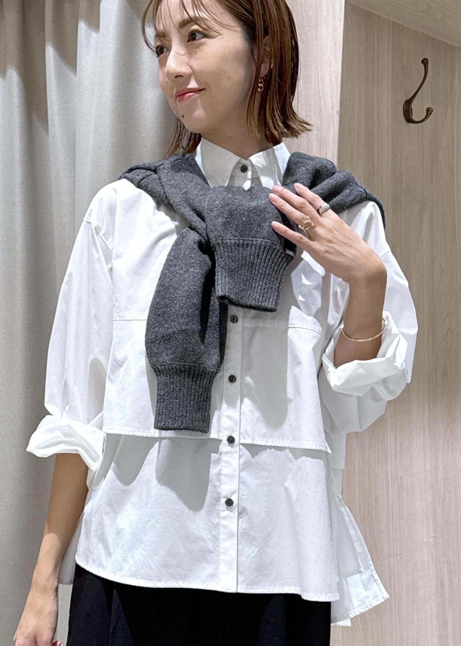 VIS裾ティアードオーバーシャツ/UVケア・イージーケアホワイト / F¥3,557レビューティアードが可愛いオーバーシャツです♪ボタンを全て留めて着ても可愛かったです!