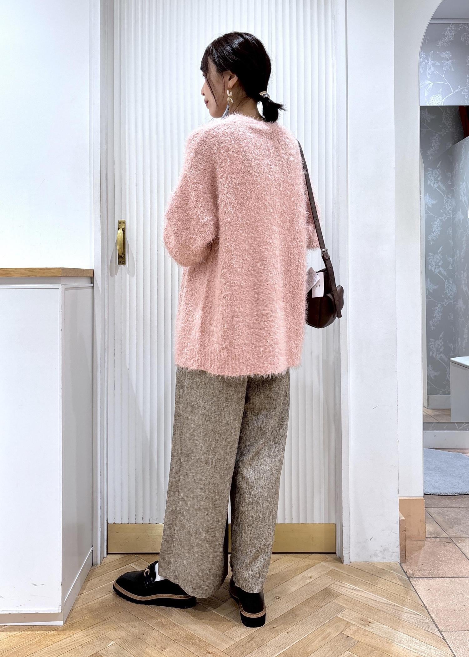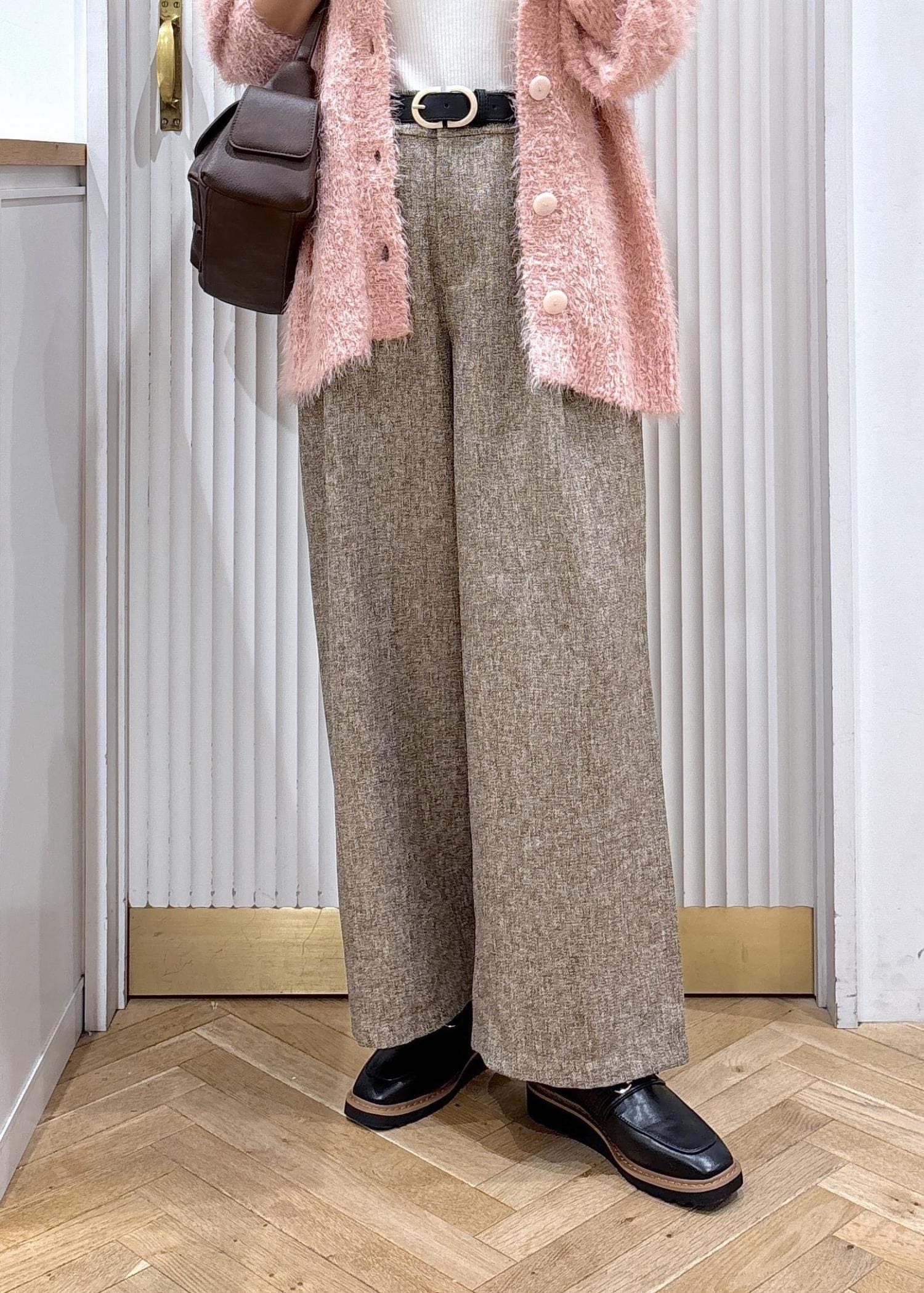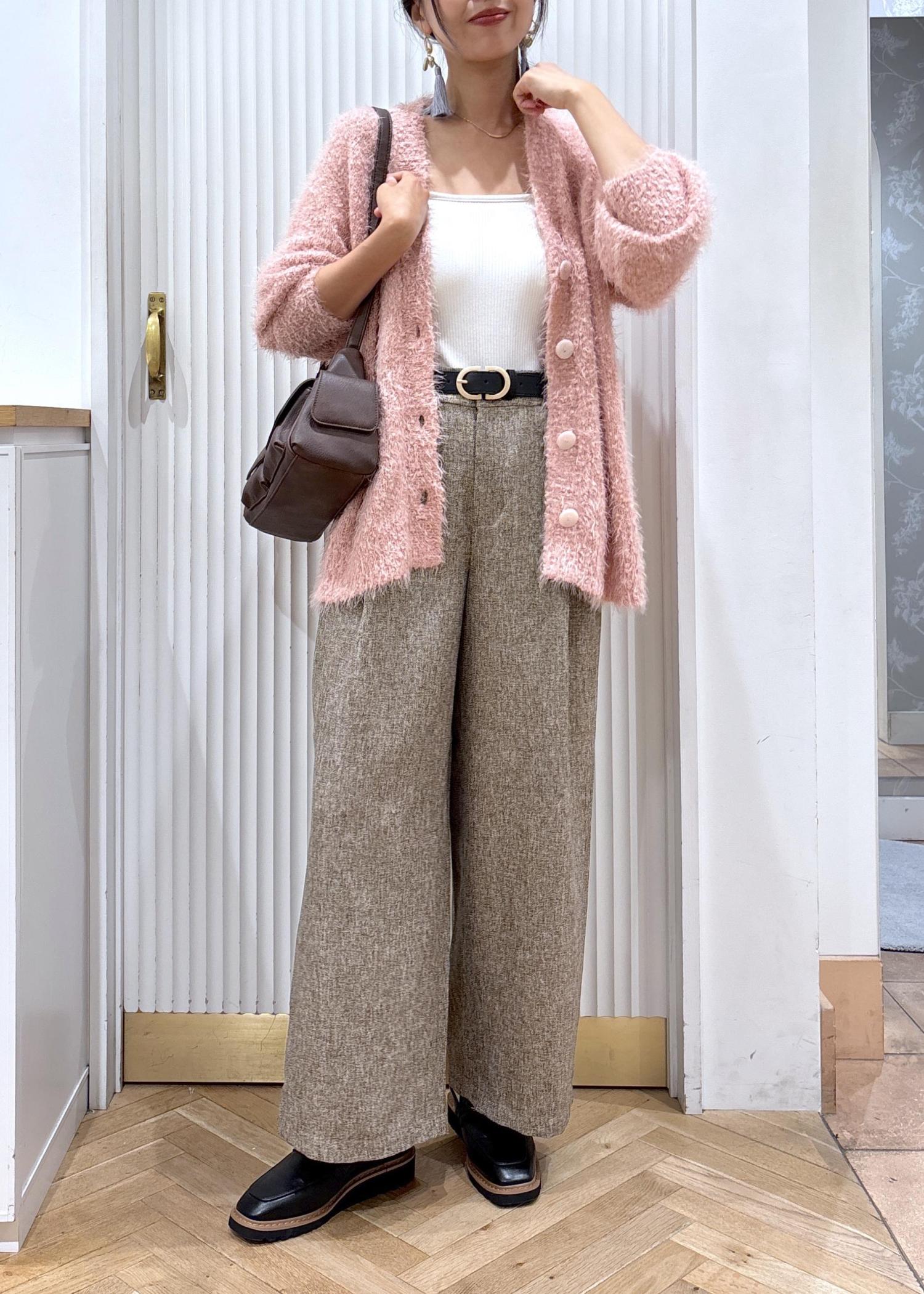 素材感の可愛いピンクのカーディガンとブラウンベースのミックスツイードのパンツを合わせたコーディネートです。