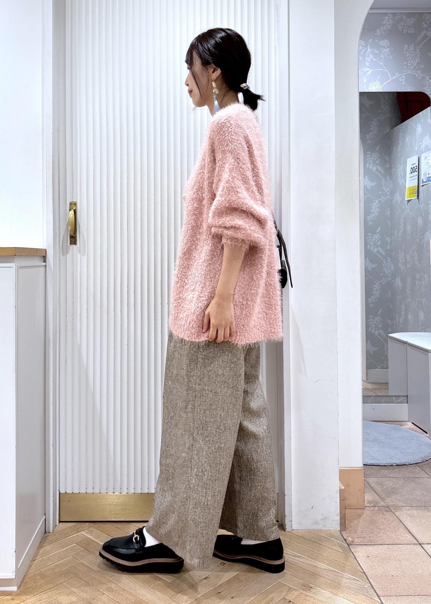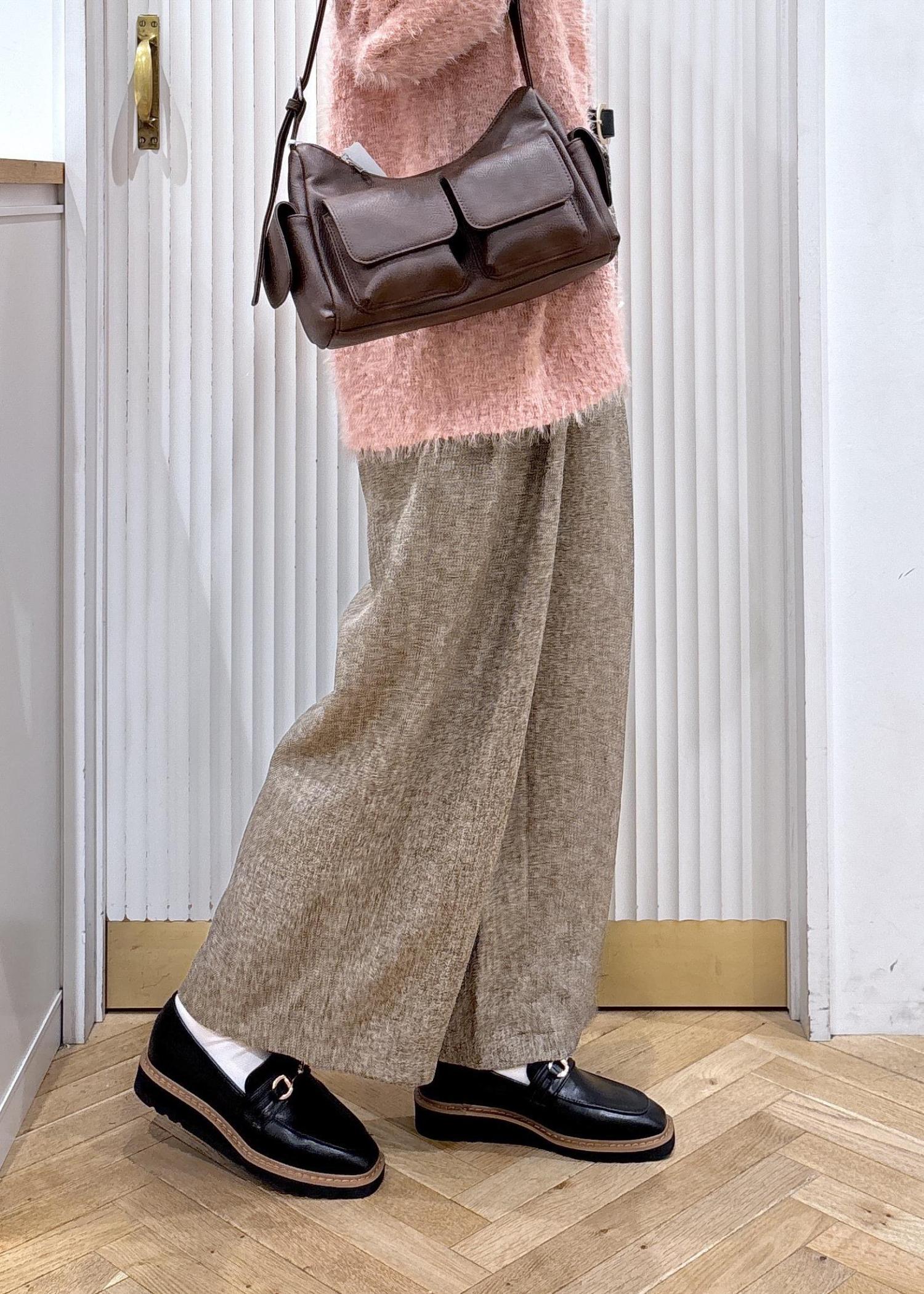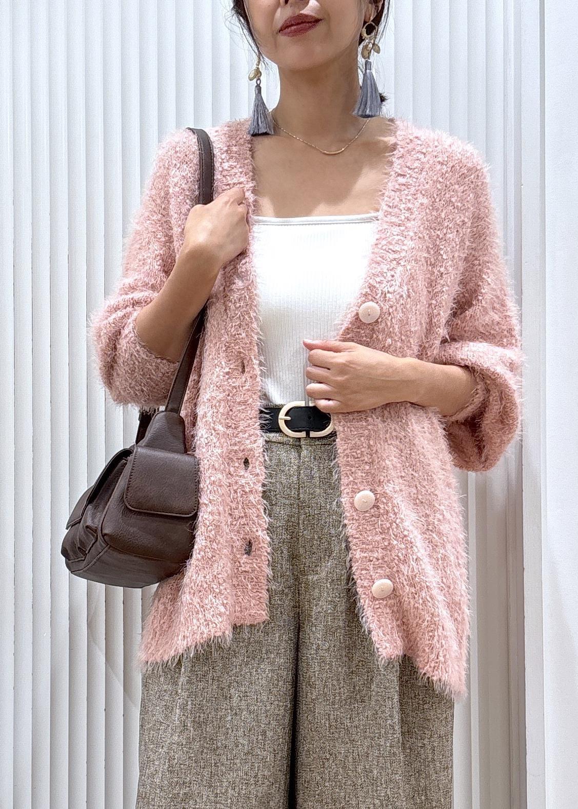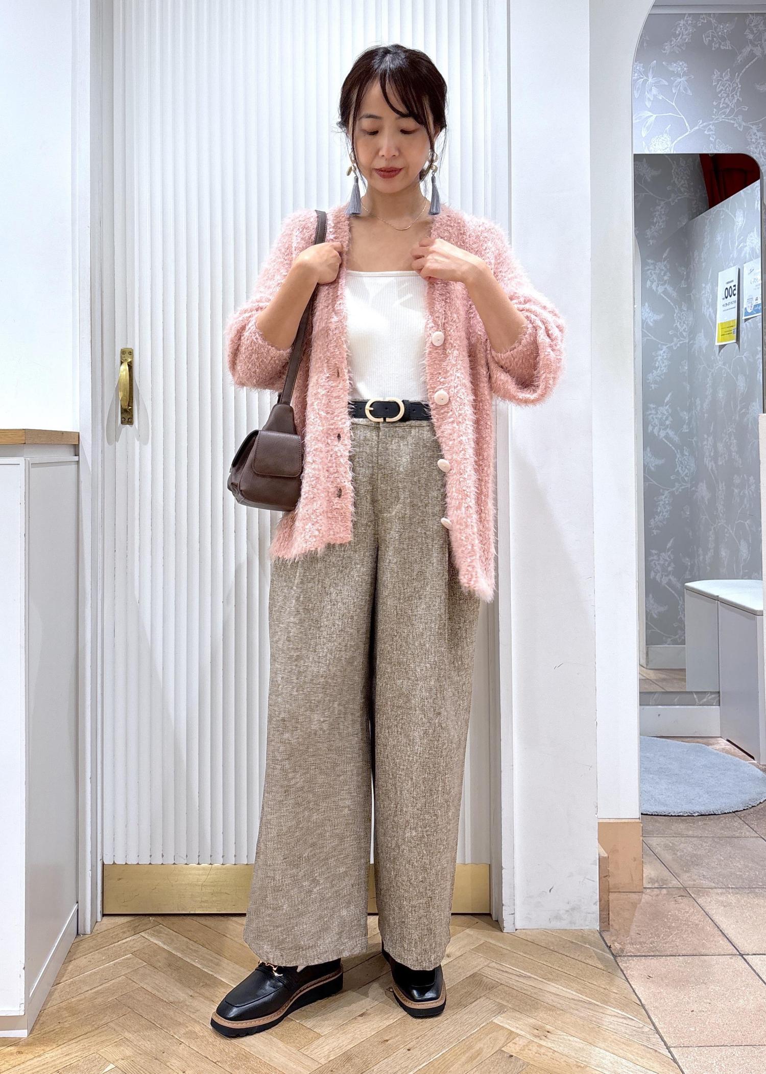 素材感の可愛いピンクのカーディガンとブラウンベースのミックスツイードのパンツを合わせたコーディネートです。