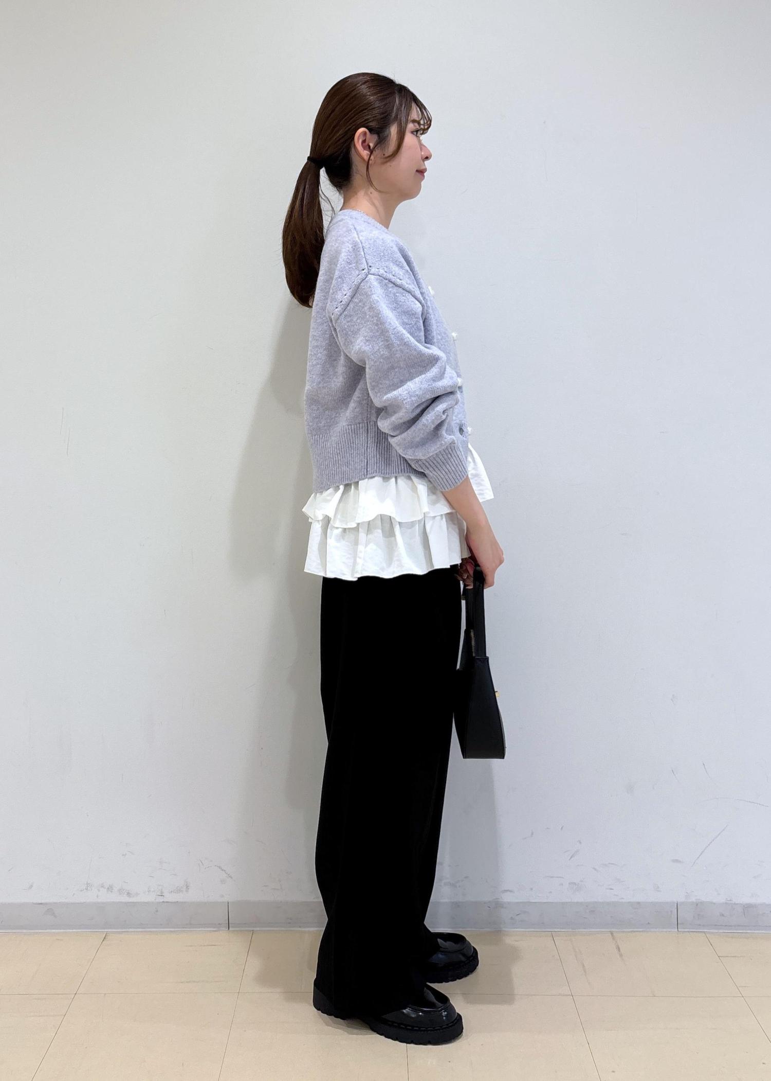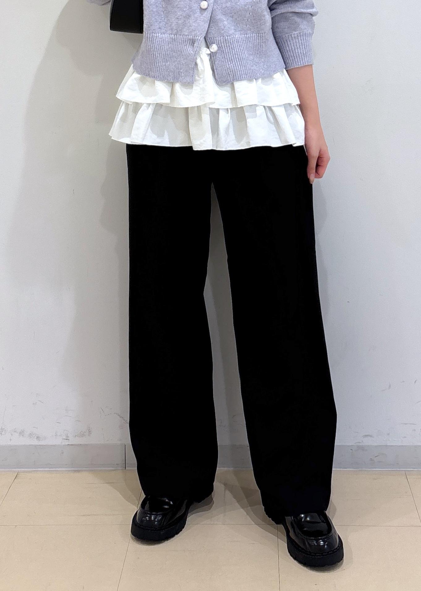 トップスのカラーが引き立つのにパンツはブラックを選びました。