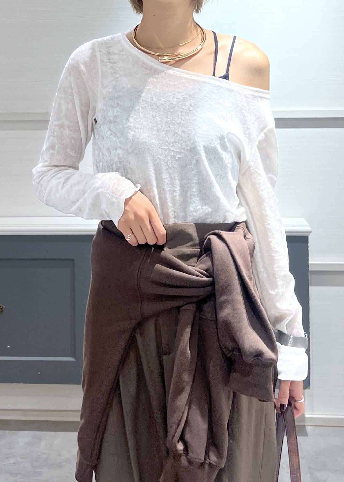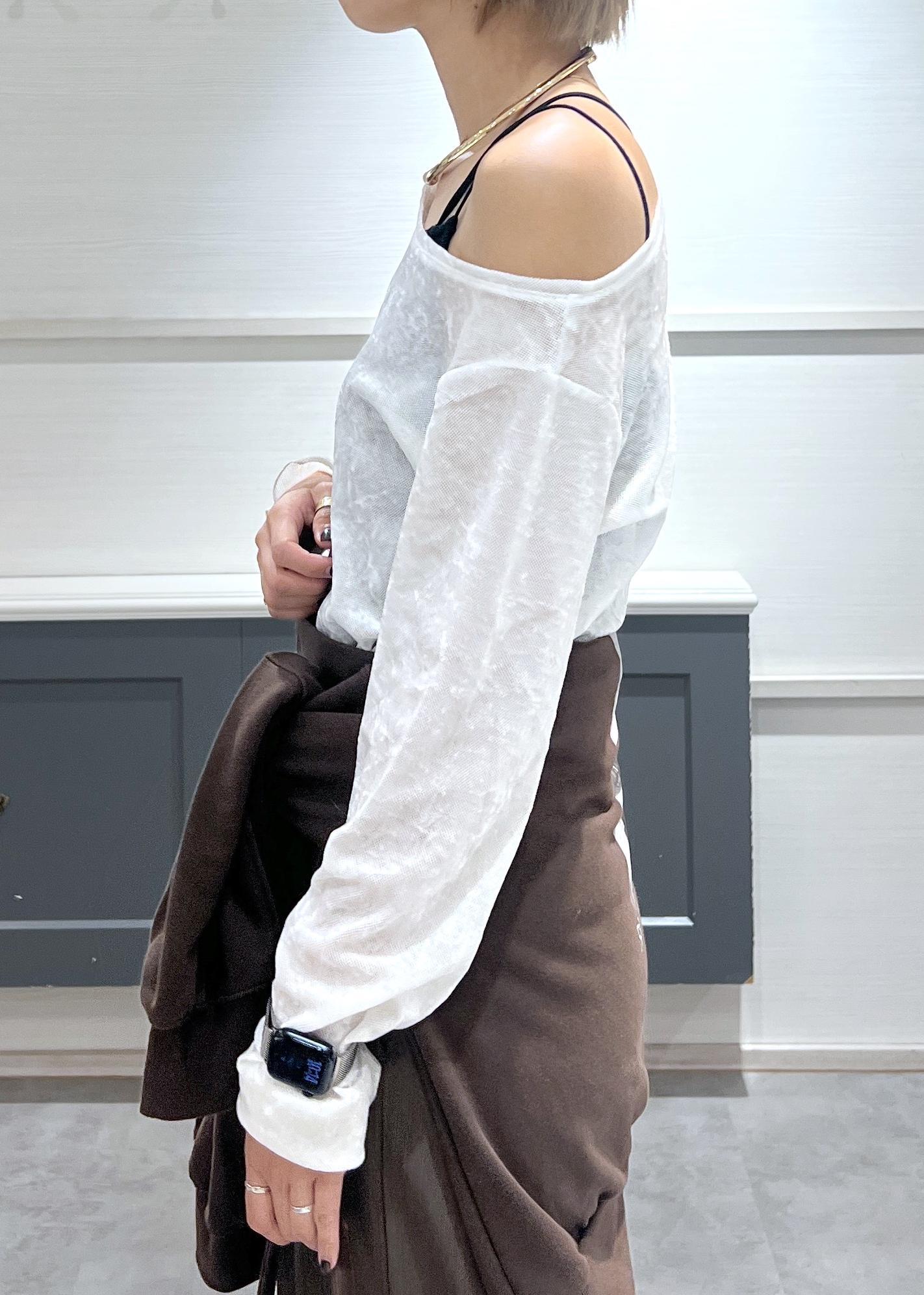 VISシアーベロアロングスリーブTシャツオフホワイト / F¥4,389レビュー鎖骨が綺麗に見えるボートネック風なディティール。