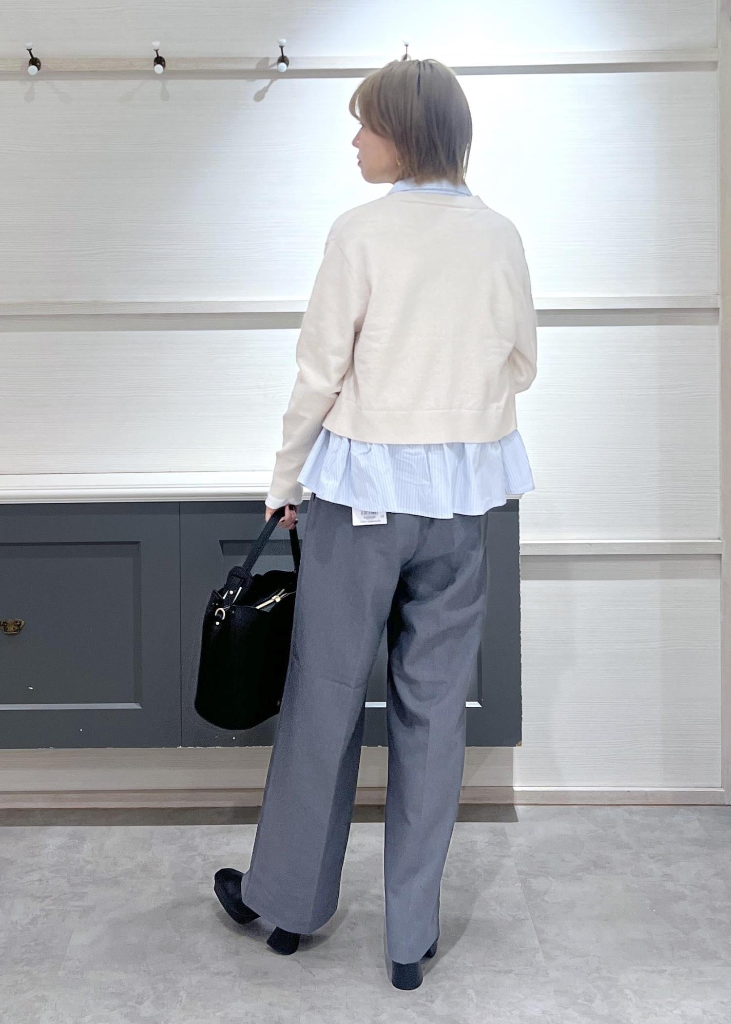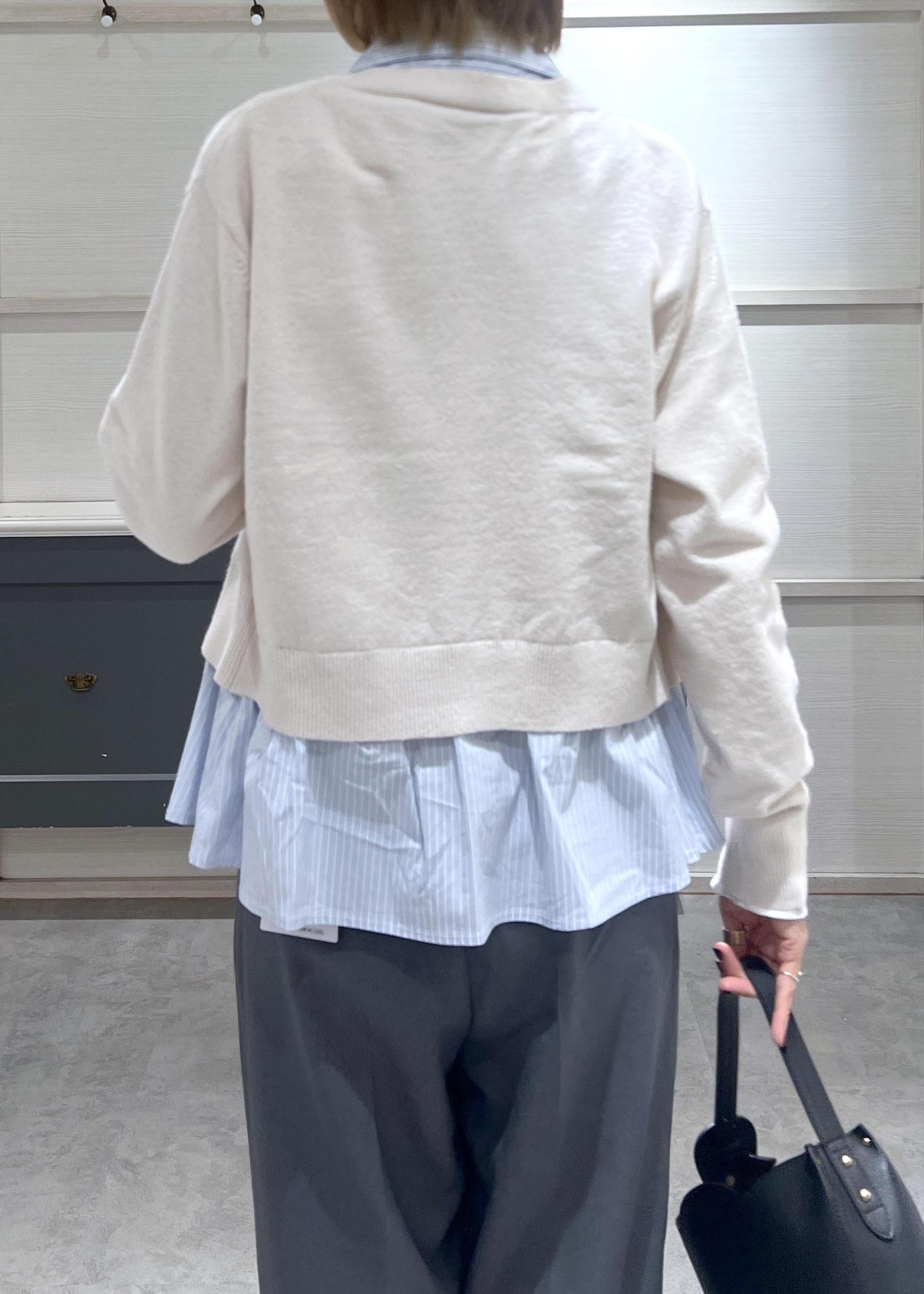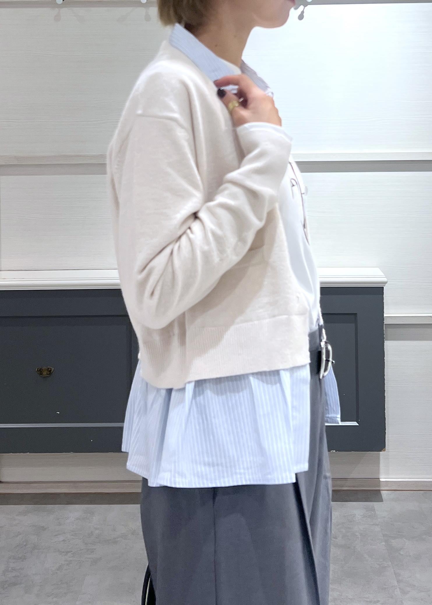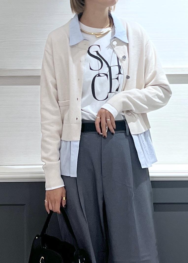 着丈はヒップにかかる程度で、袖幅・身頃はコンパクトめな作りなので、1枚着としてはもちろんカーディガンやジャケットのインナーにも◎