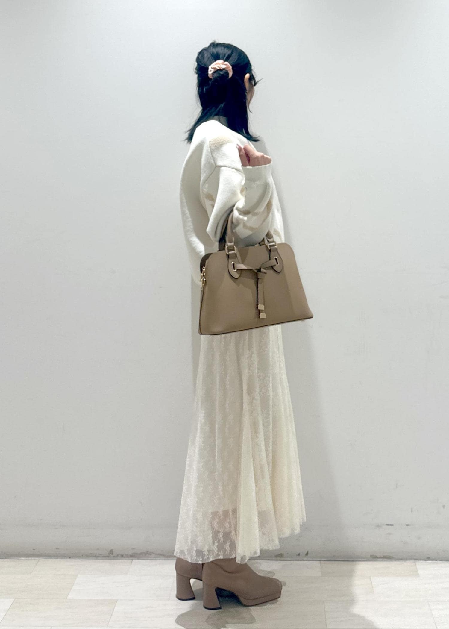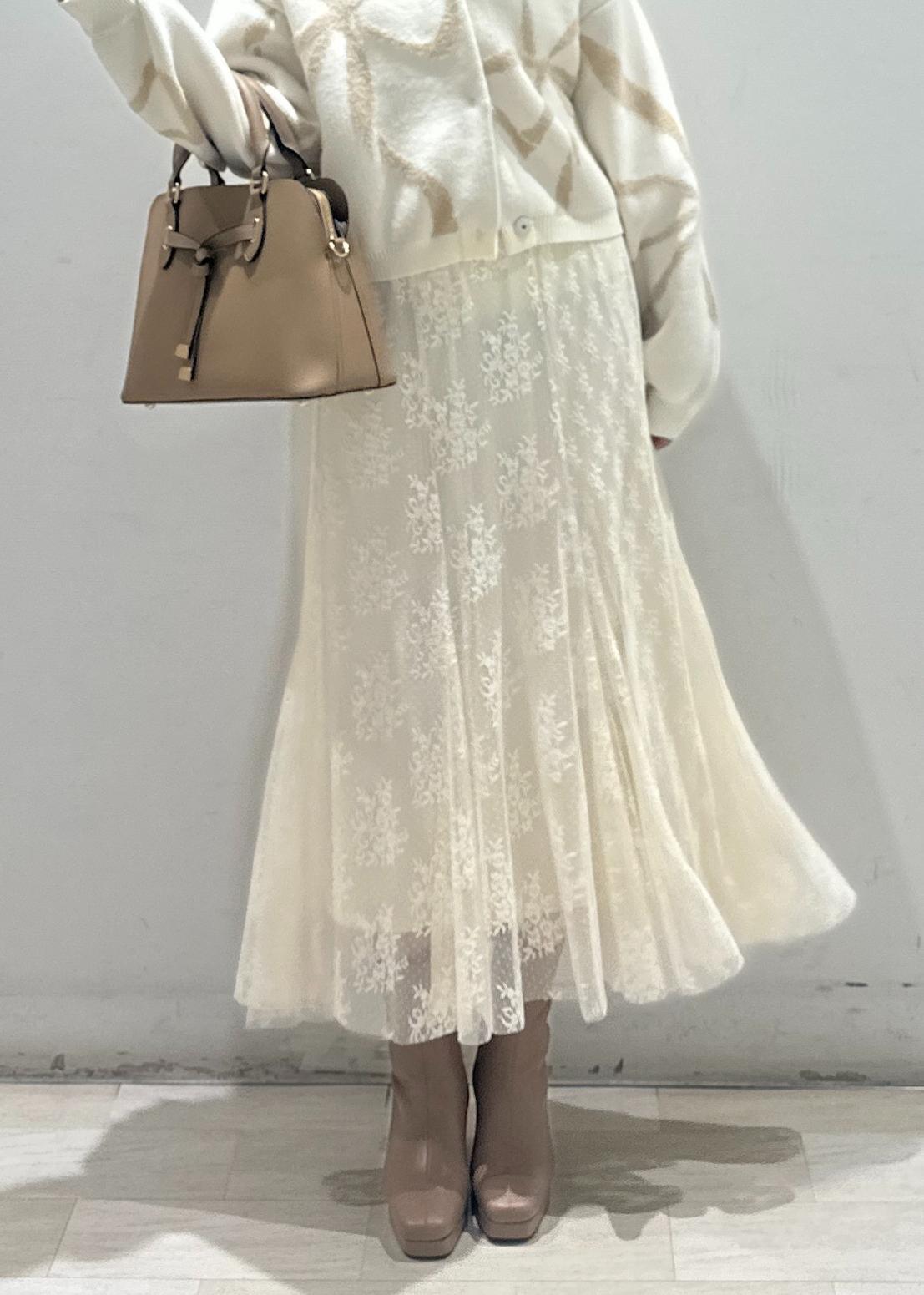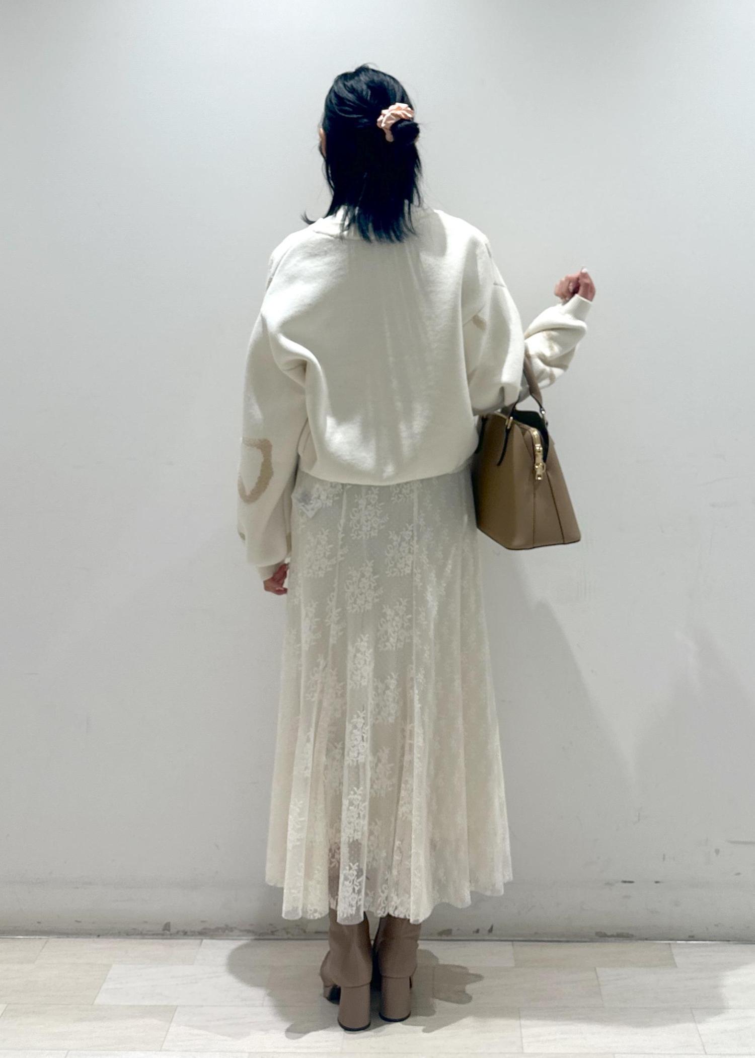 主役のリボン柄カーディガンとレーススカートの素材感が、コーディネートをふわっとした雰囲気に◎