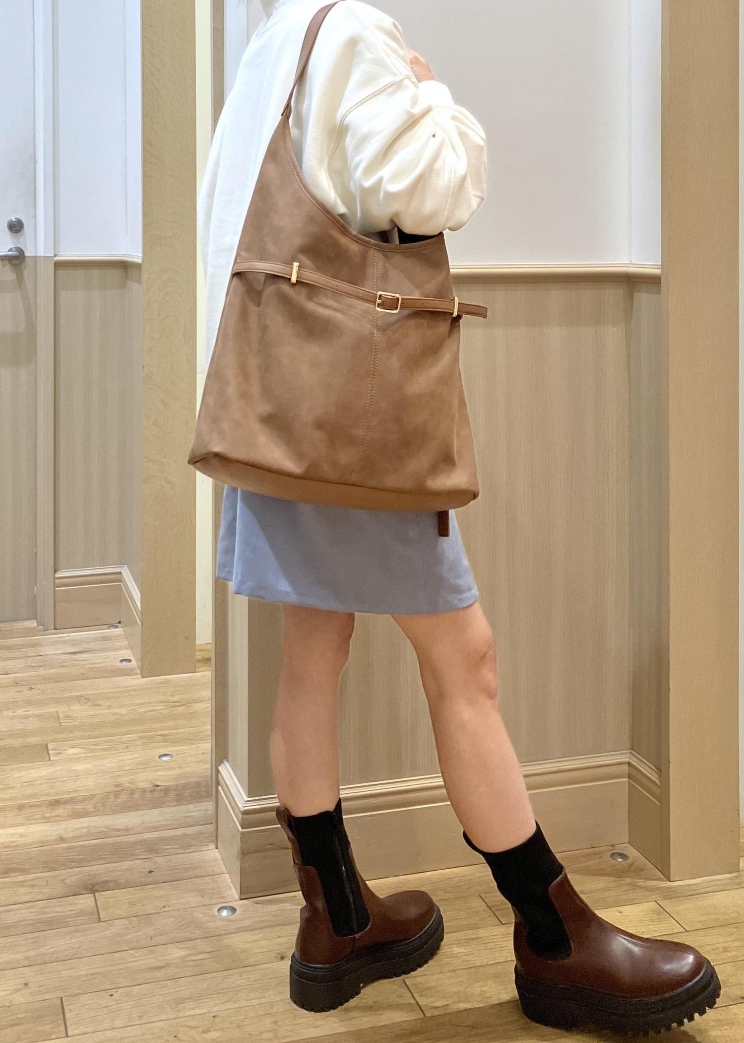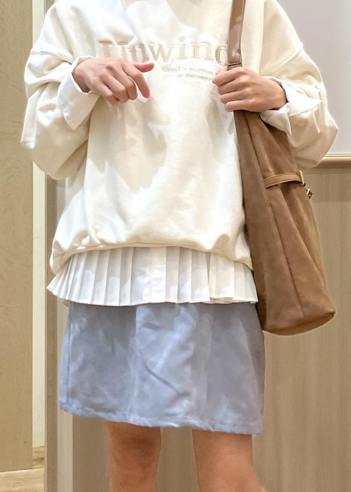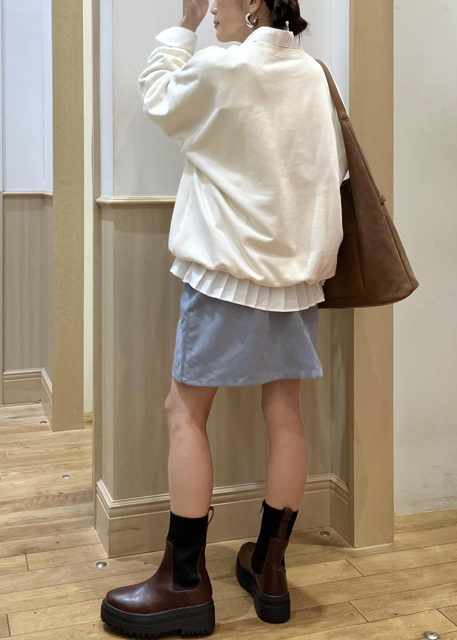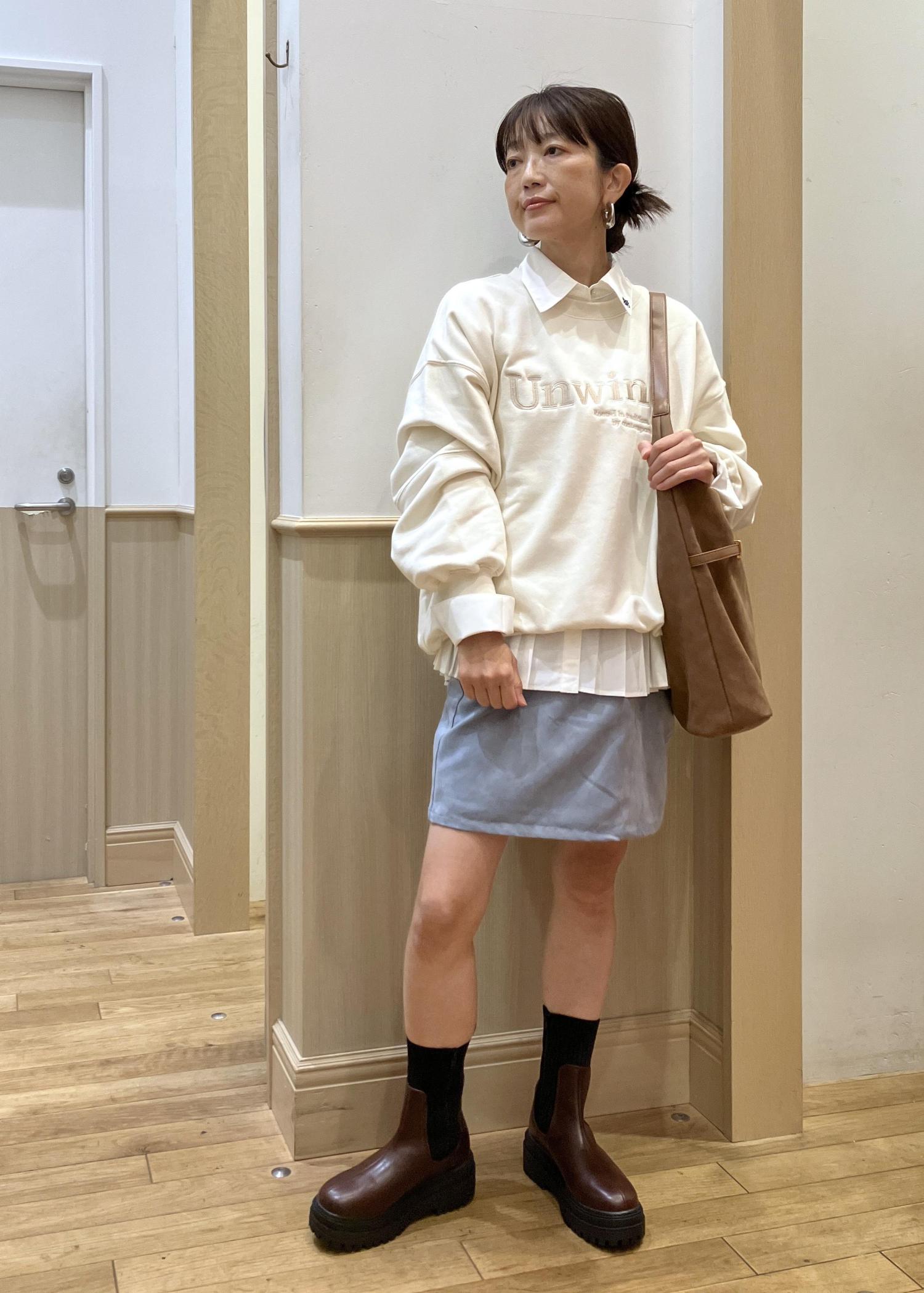 ブーツとミニスカートの着丈のバランスにこだわってみました。トップスもボリューム感のあるbigシルエットのスウェットを合わせる事でバランス良く見えるようにしてみました。
