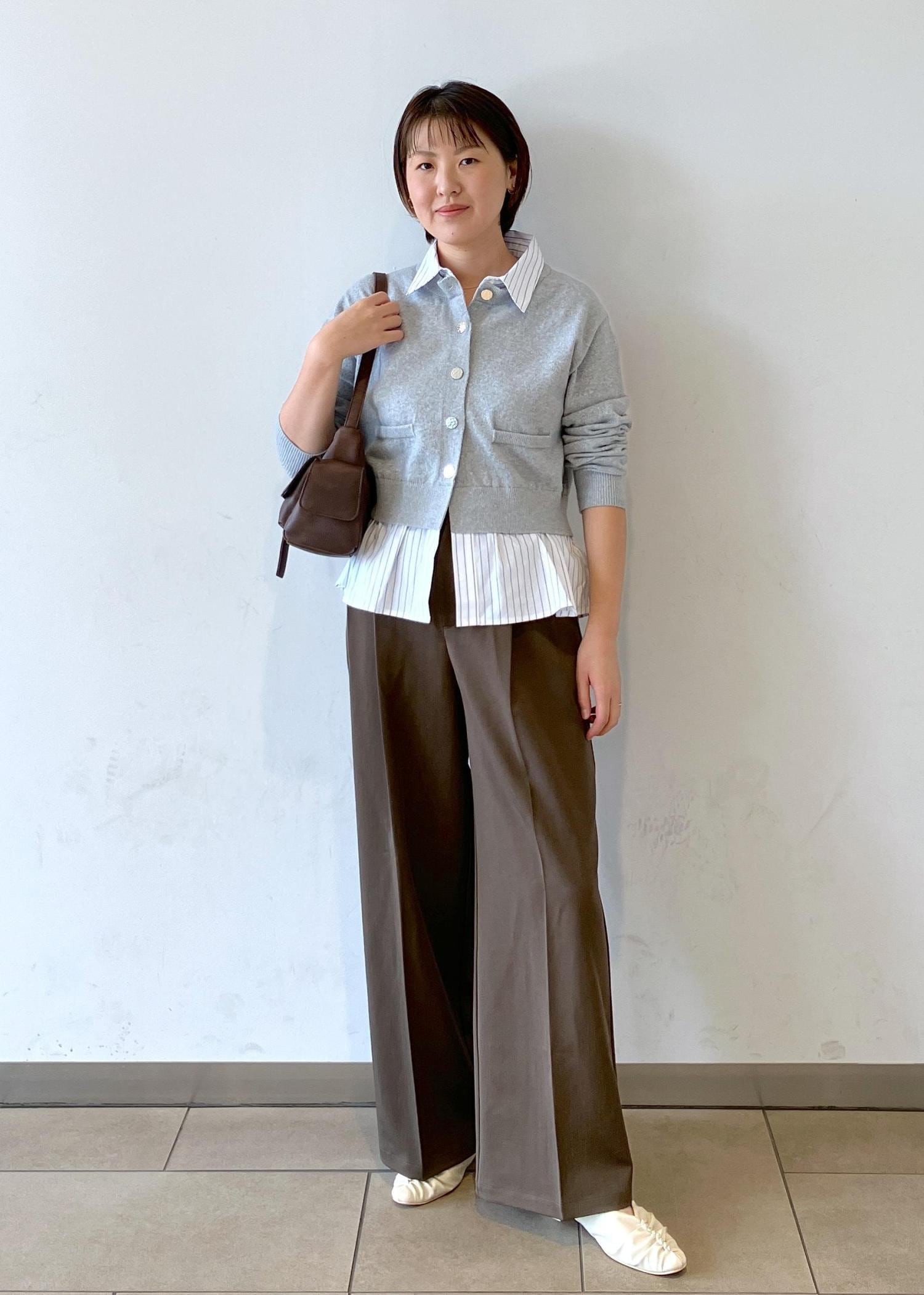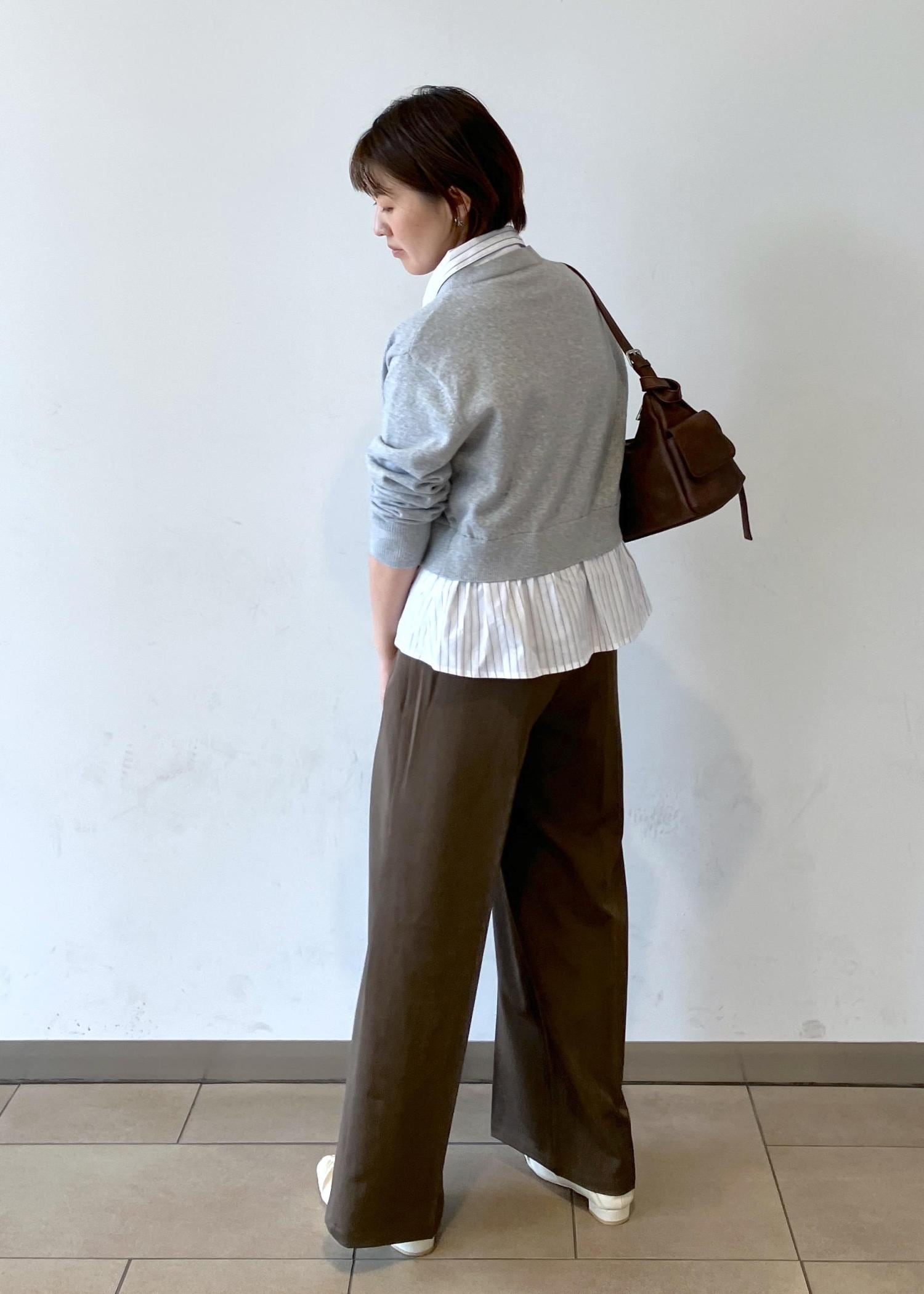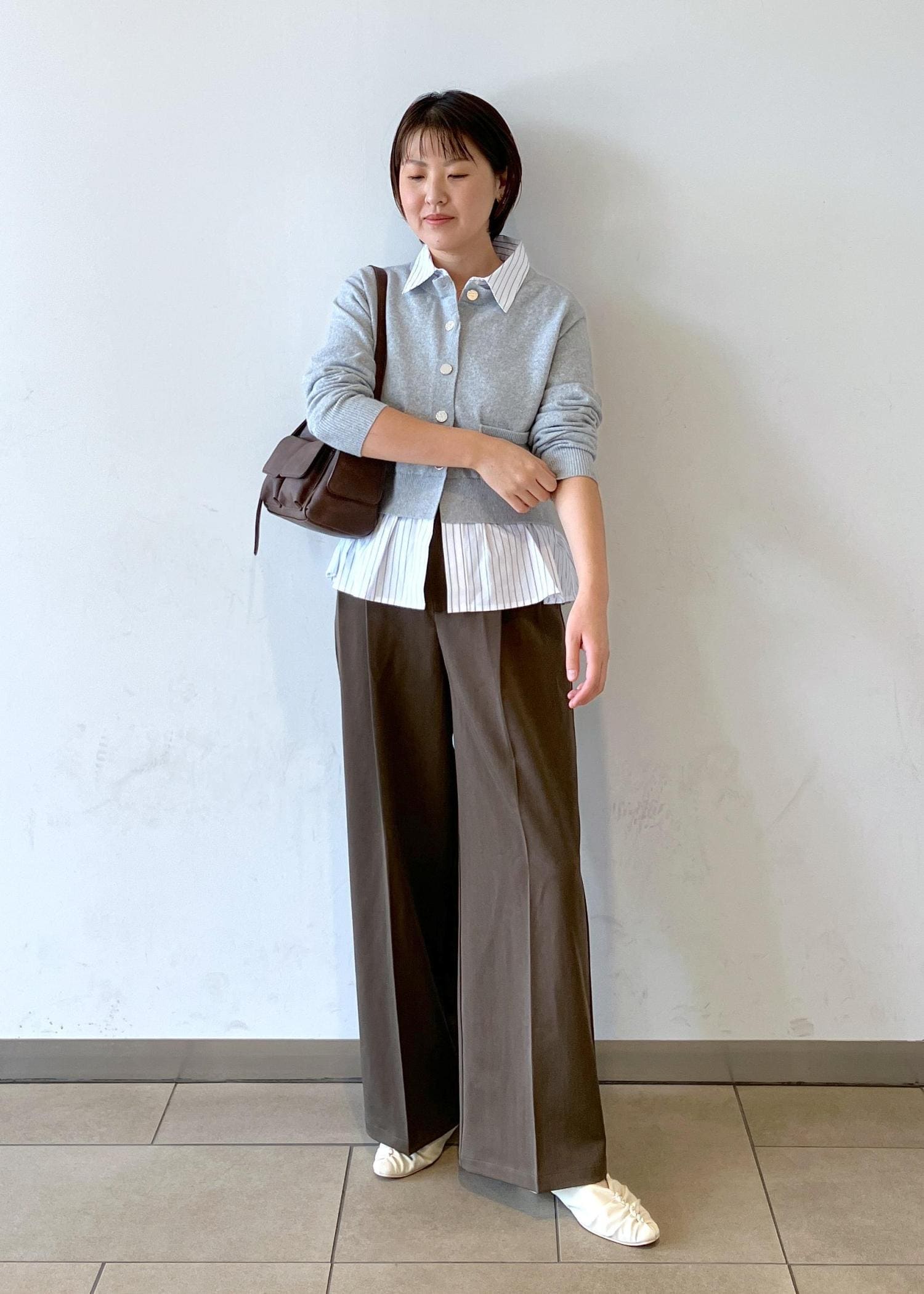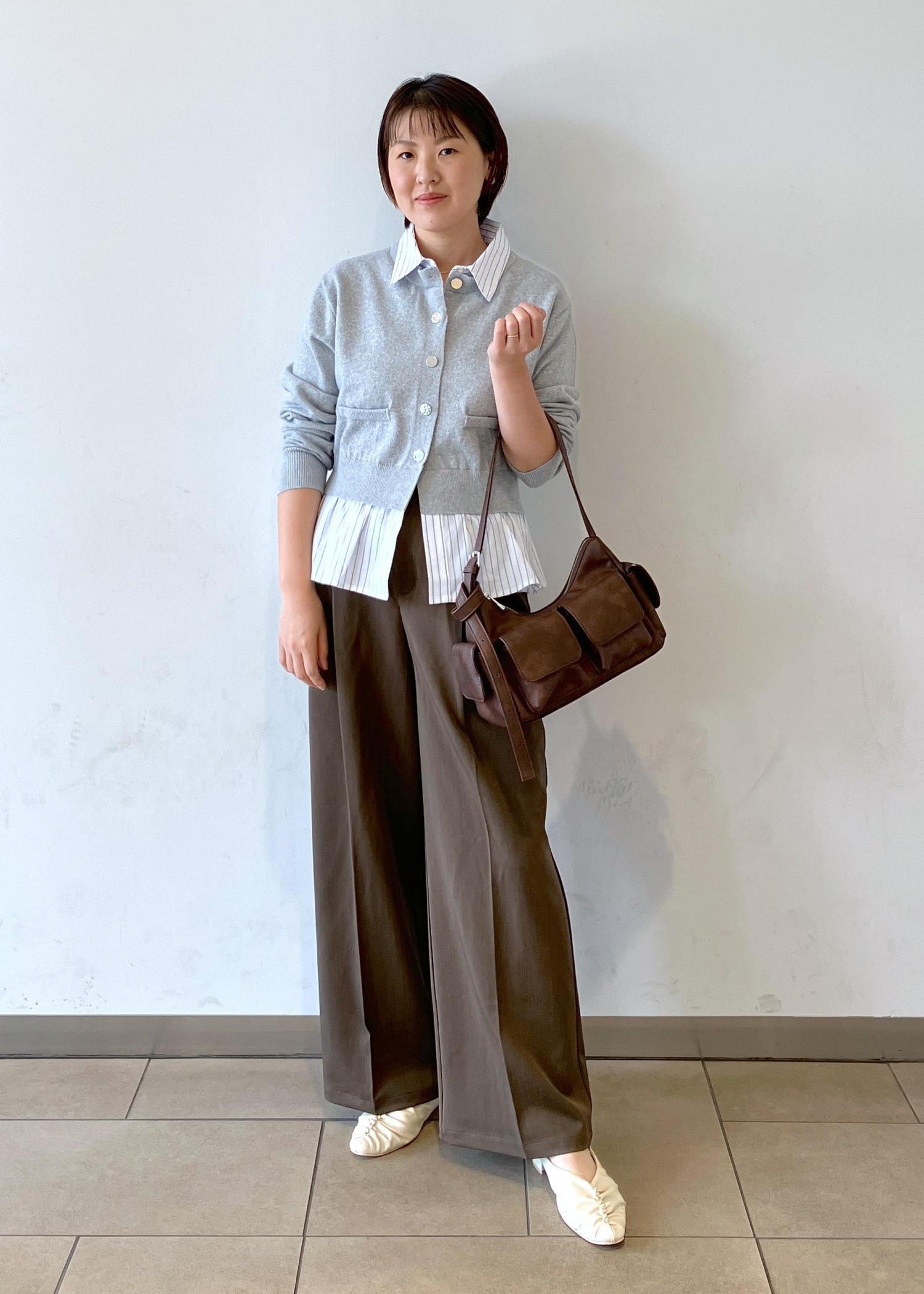 トレンドのレイヤードが1枚で叶うカーディガンにはかっこ良く着こなしたかったのでワイドパンツとショルダーバッグを合わせました!また秋らしくパンツとバッグのカラーはブラウンで合わせてみました!
