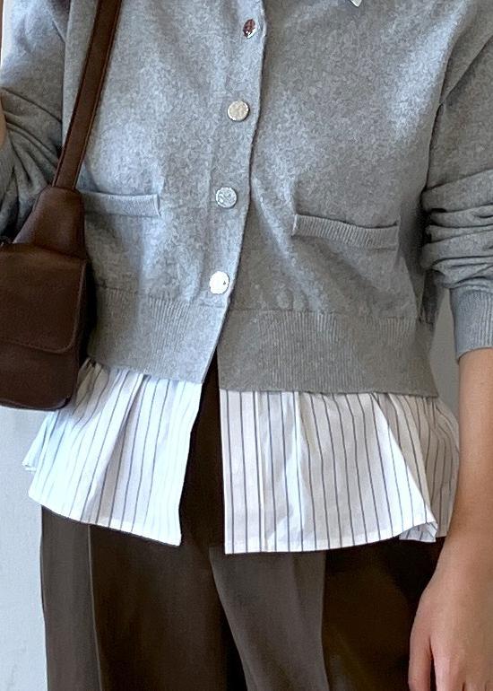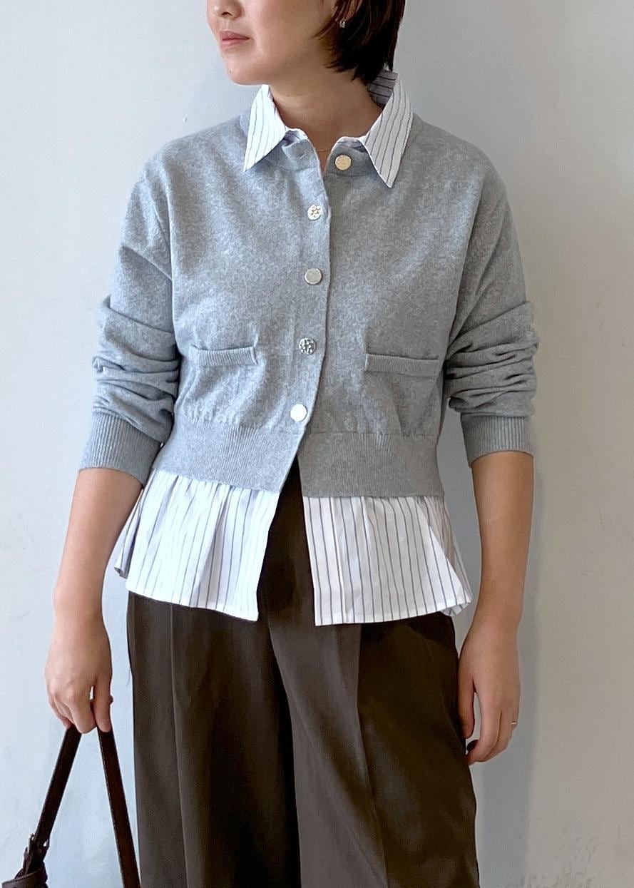 VISシャツレイヤード風メタルボタンカーディガンライトグレー / F¥6,589レビューシャツとカーディガンかドッキングされておりレイヤードと時短が叶うアイテムです!カーディガン部分は滑らかな肌触りでチクチクしません!伸縮性があり着脱しやすいです!前開きで羽織りとしても着用いただけます!シャツの切り替えは高めに設定されているのでスタイリングUPになります!