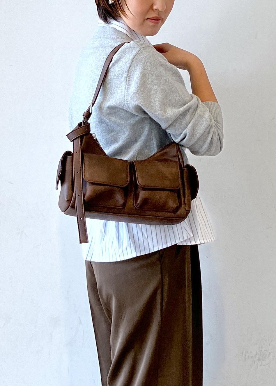 VIS【2WAY】ビンテージ合皮クアトロポケットショルダーバッグブラウン系 / F¥6,919レビュー立体感のある外ポケットは、すぐに取り出したいもの(ICカード、携帯など)やコードレスイヤホンやリップなど細々したものを収納できます!500mlのペットボトルや長財布が入るサイズ感です!口元はファスナー開閉で防犯面もバッチリ!ショルダーにもハンドバッグにもなる2WAY仕様です!