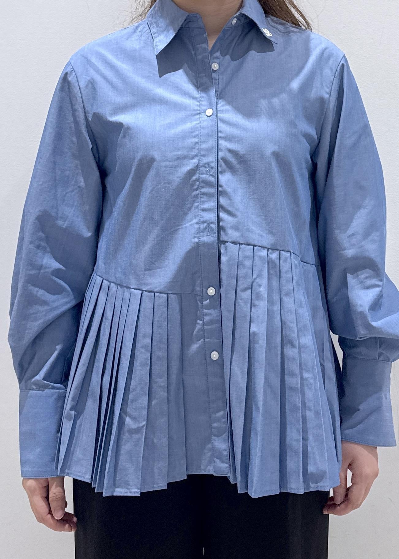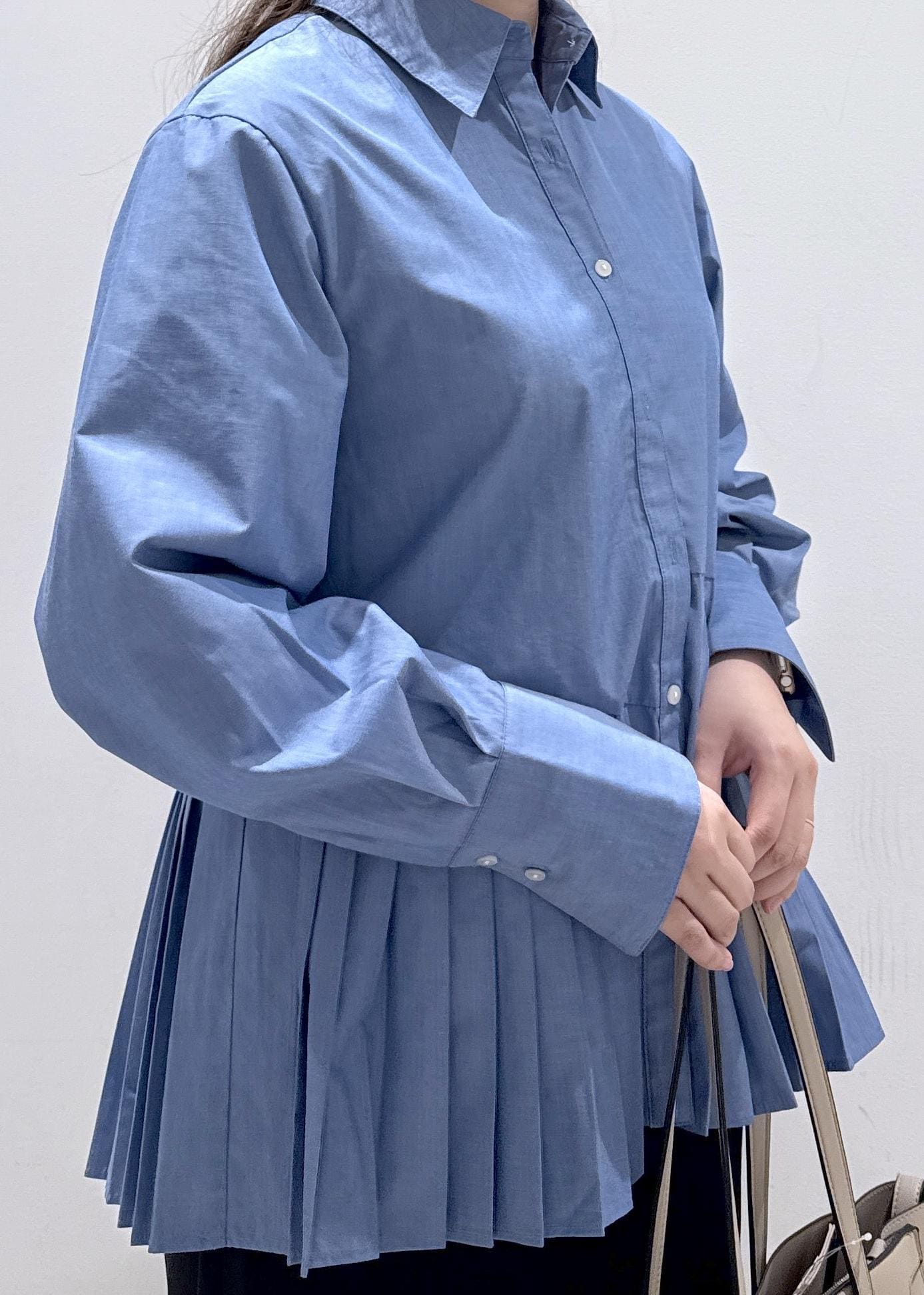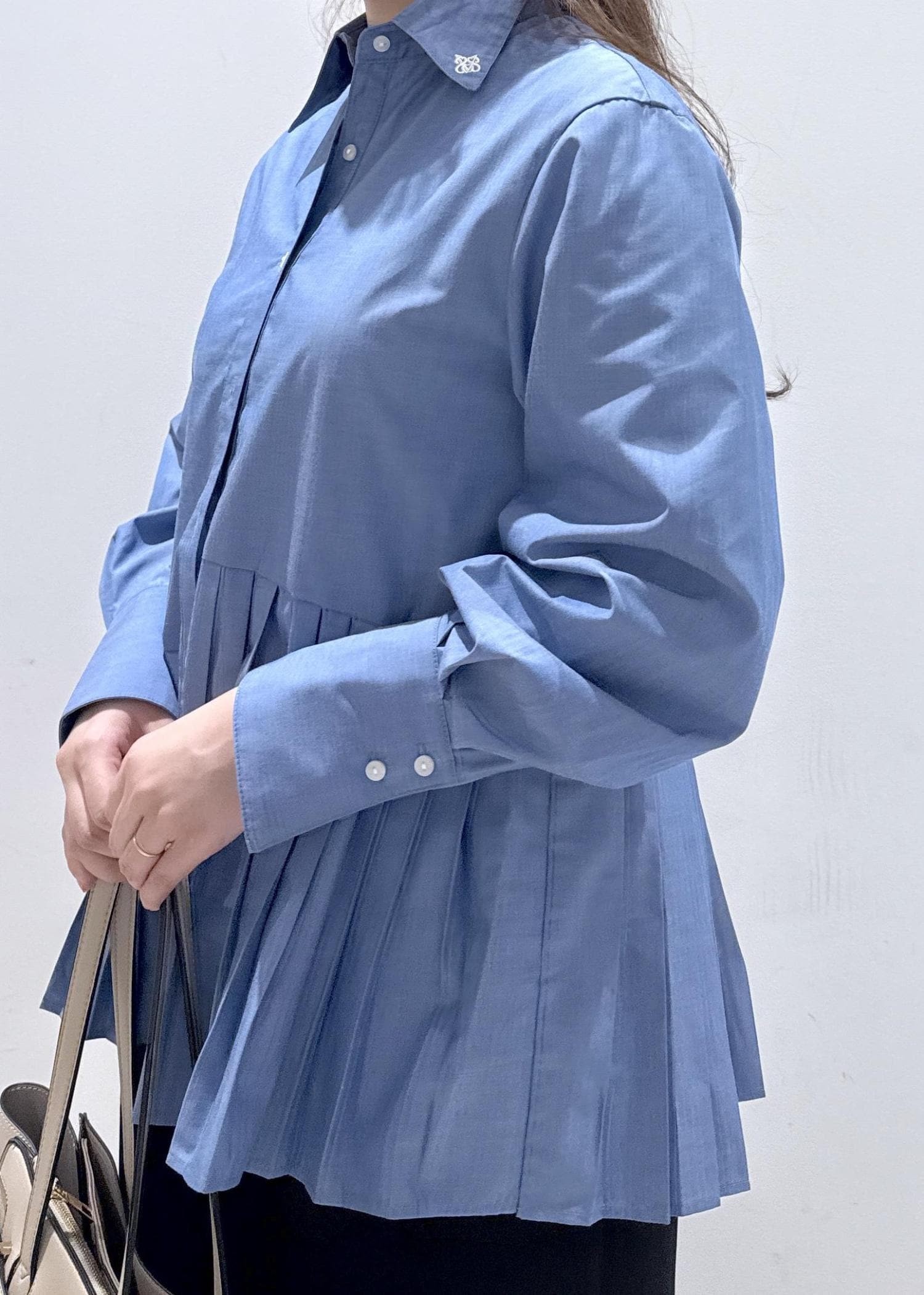 今回は新作で入荷しましたブルーのプリーツシャツに